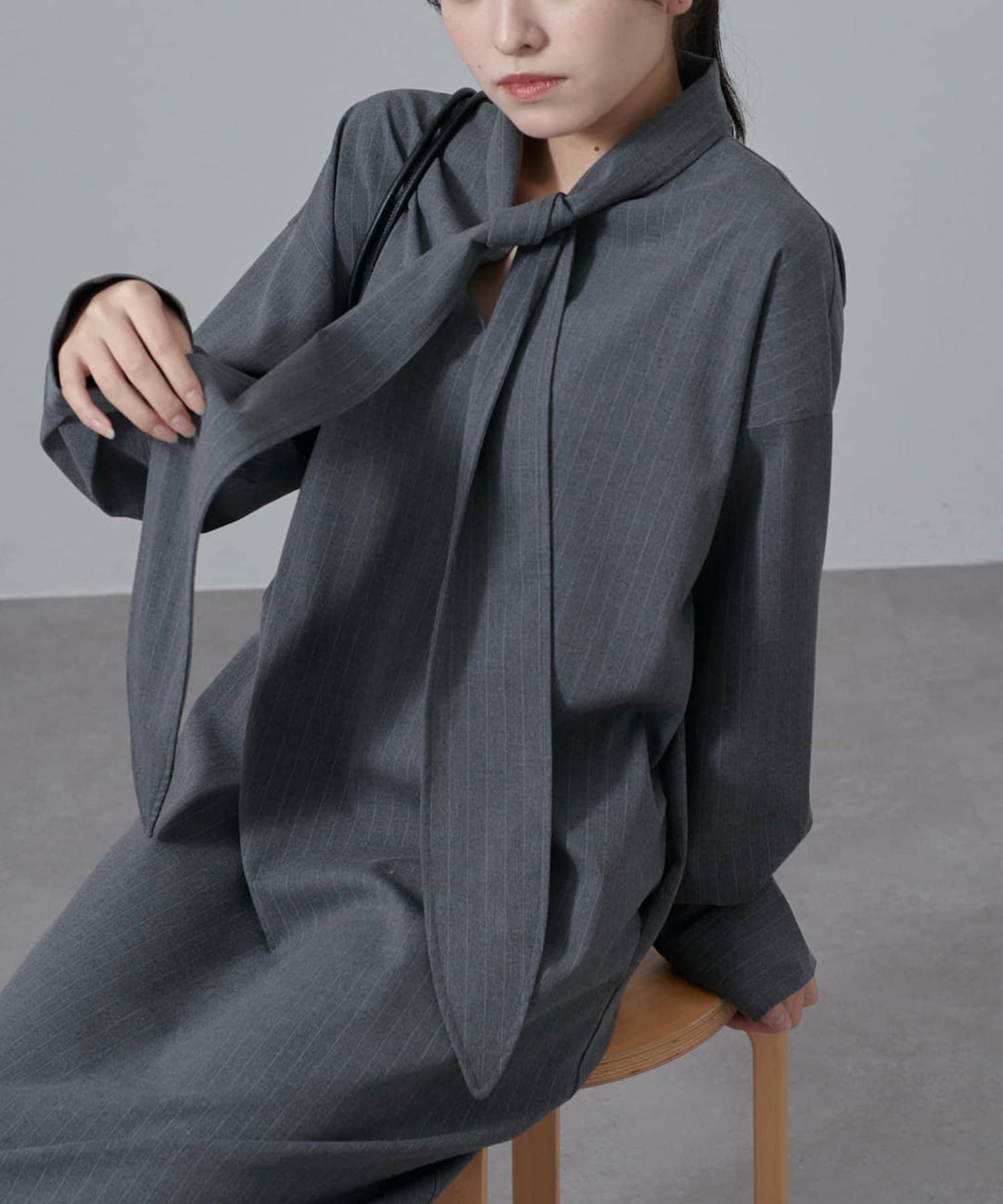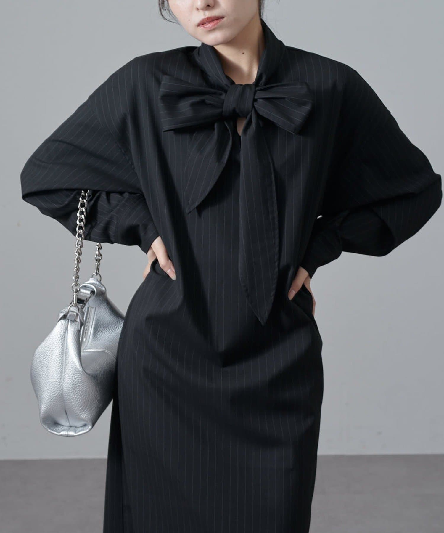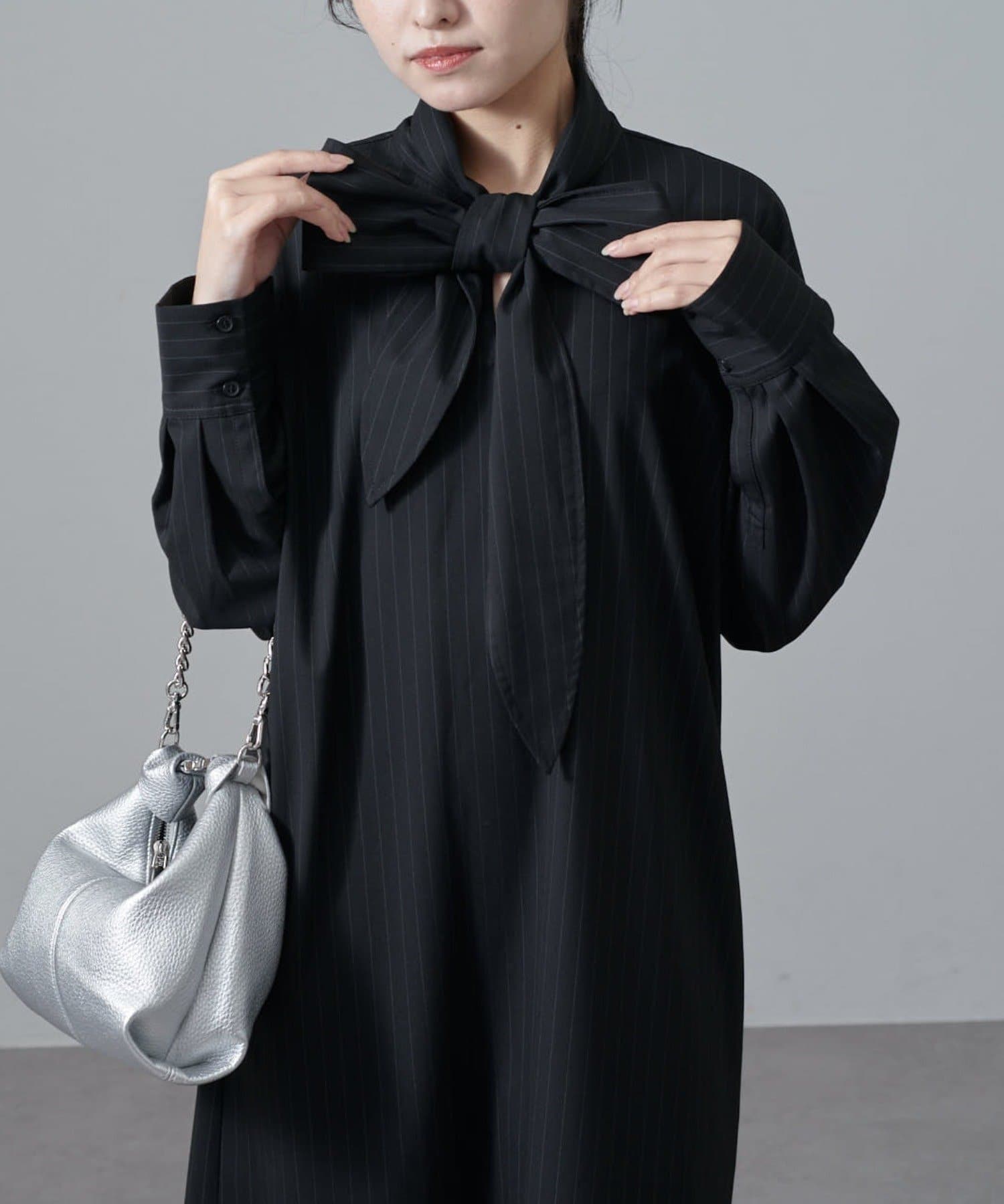 ハンサムな雰囲気で着られるボウタイ付きシャツワンピ♡