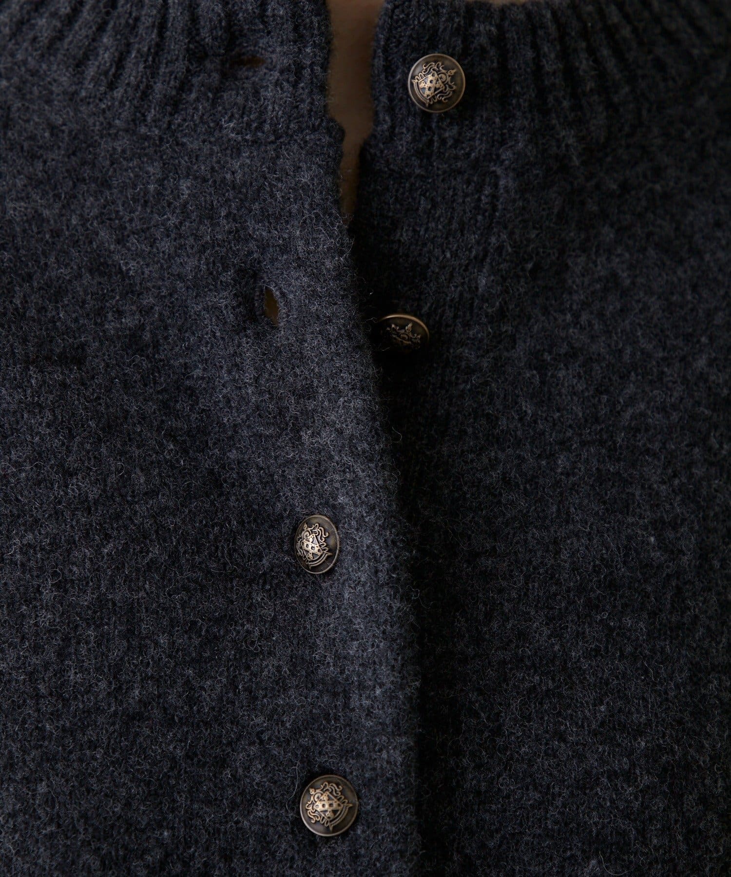 フロントのボタンにはアンティークゴールド刻印ボタンを採用。遊び心のあるデザインで、さりげなく目を惹くアクセントに。