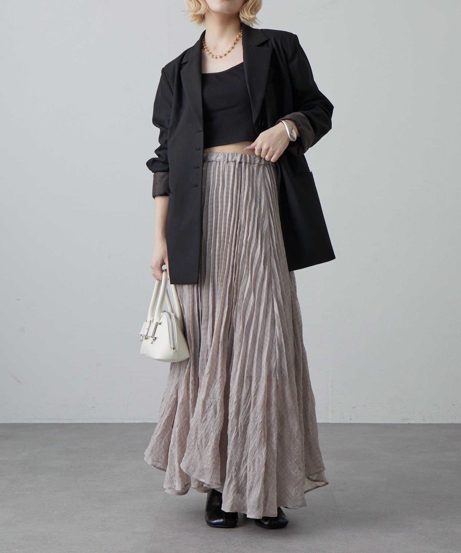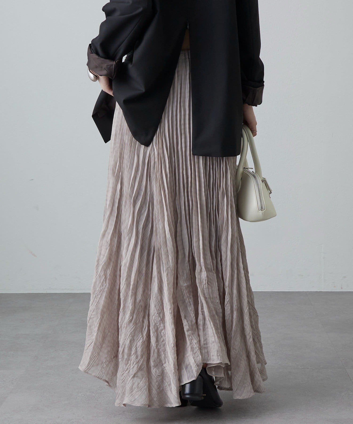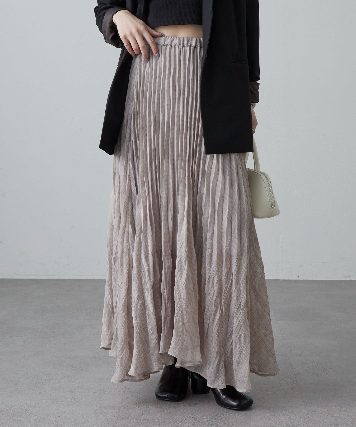 ・繊細なプリーツが縦ラインを強調し、スタイルアップ効果をプラス。