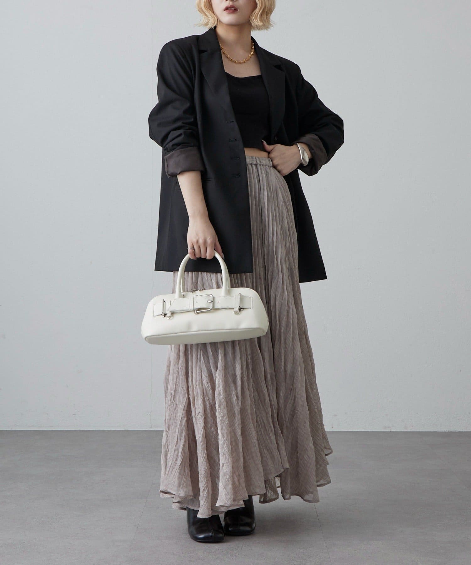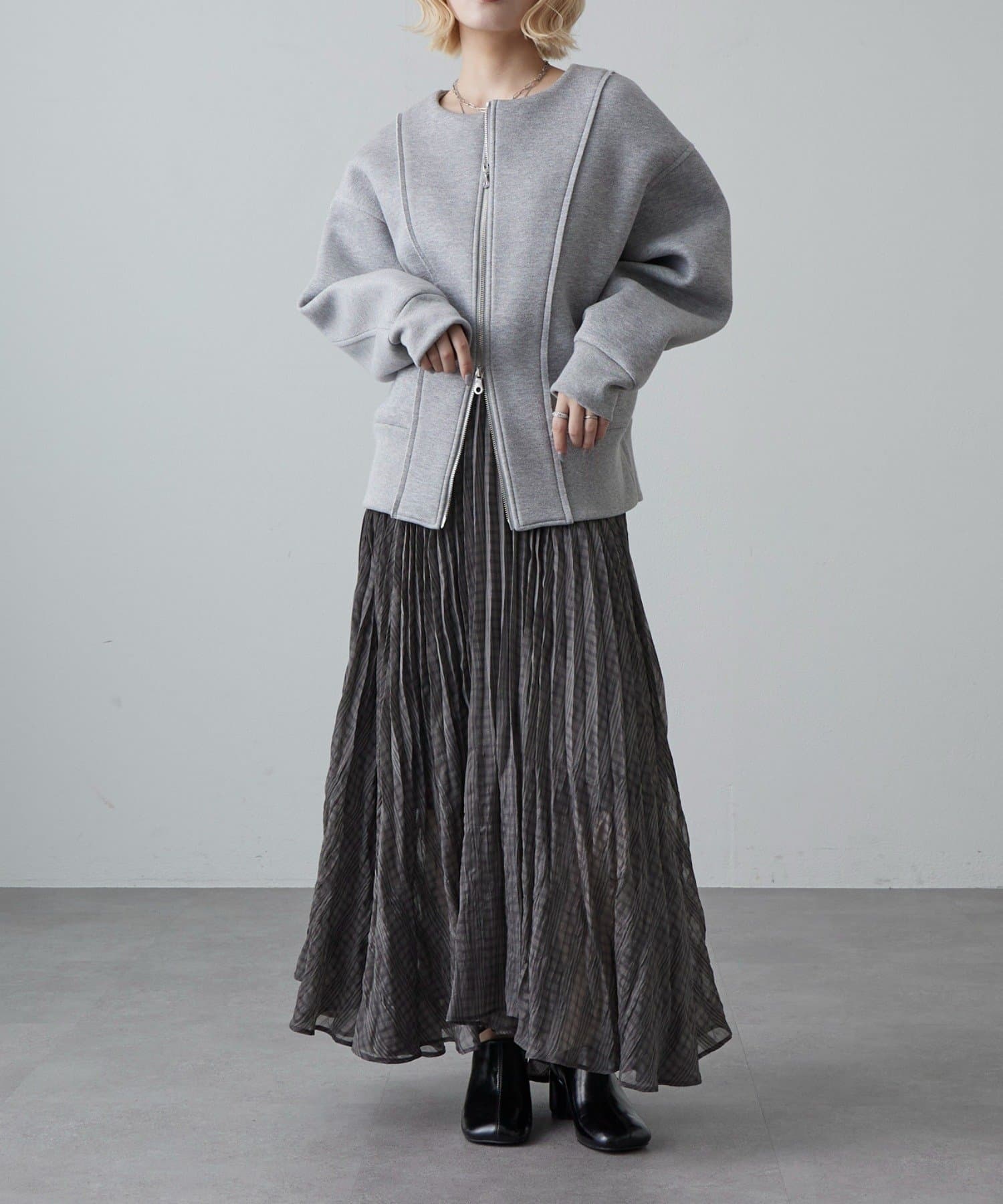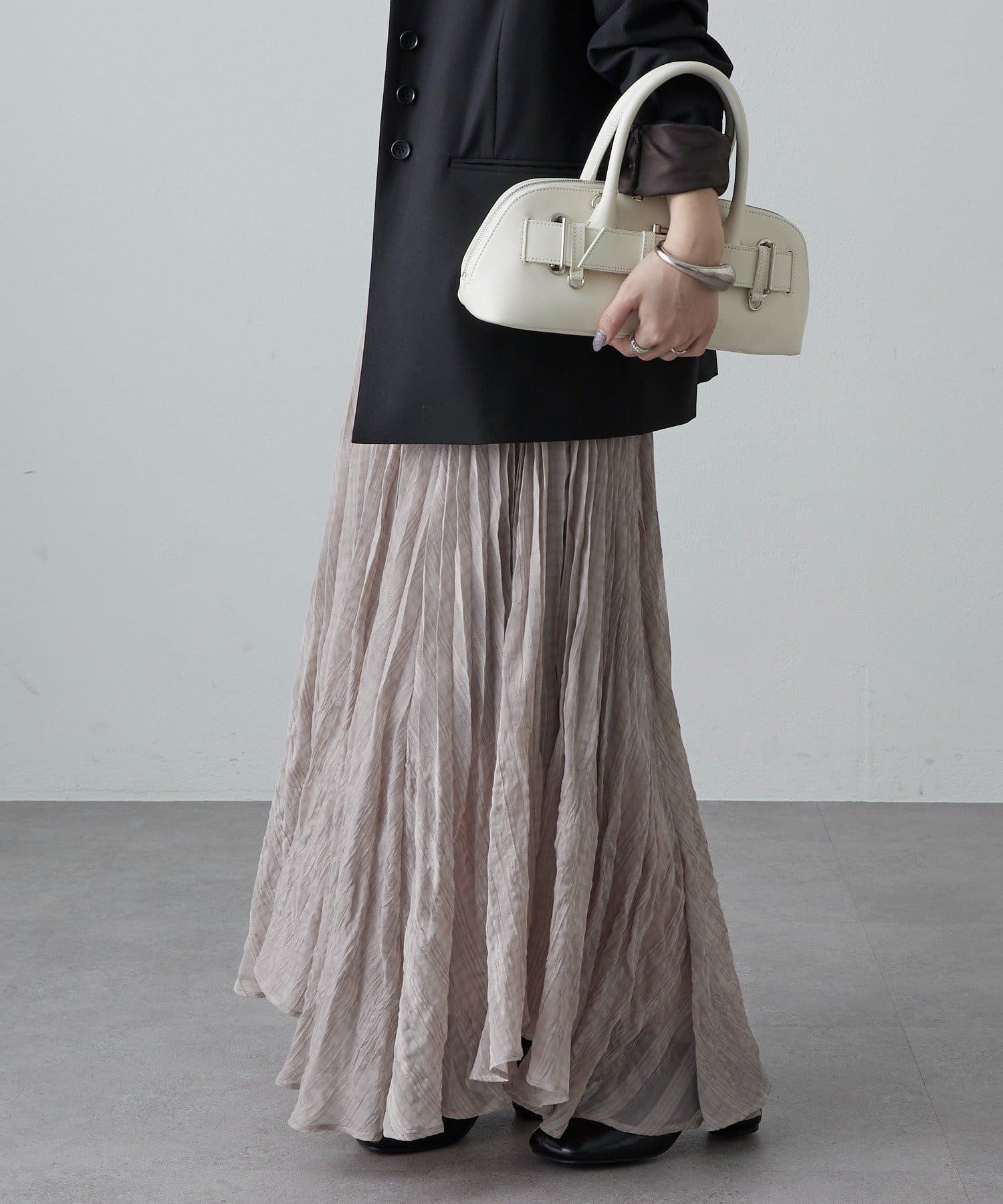 ・繊細なプリーツが縦ラインを強調し、スタイルアップ効果をプラス。