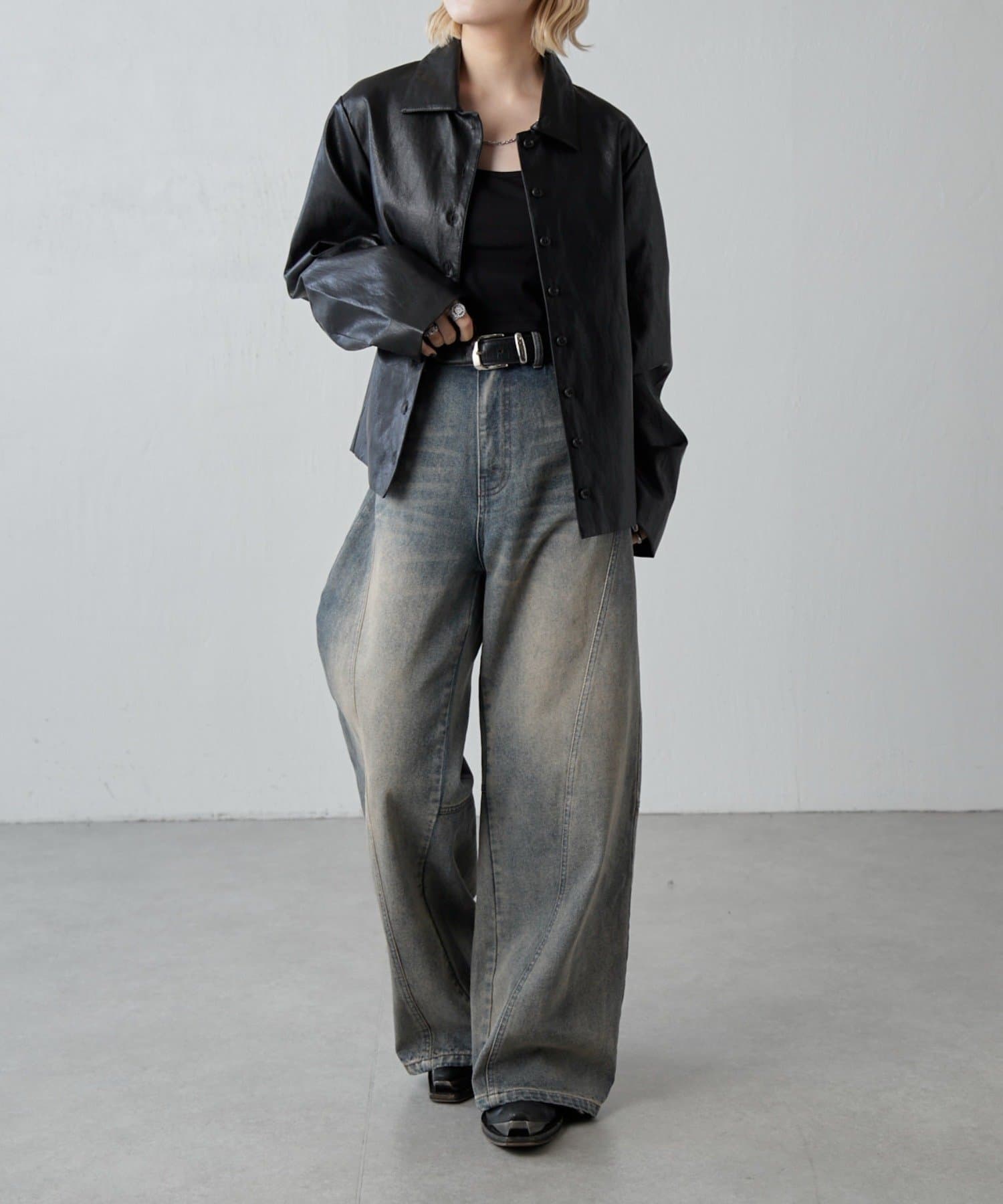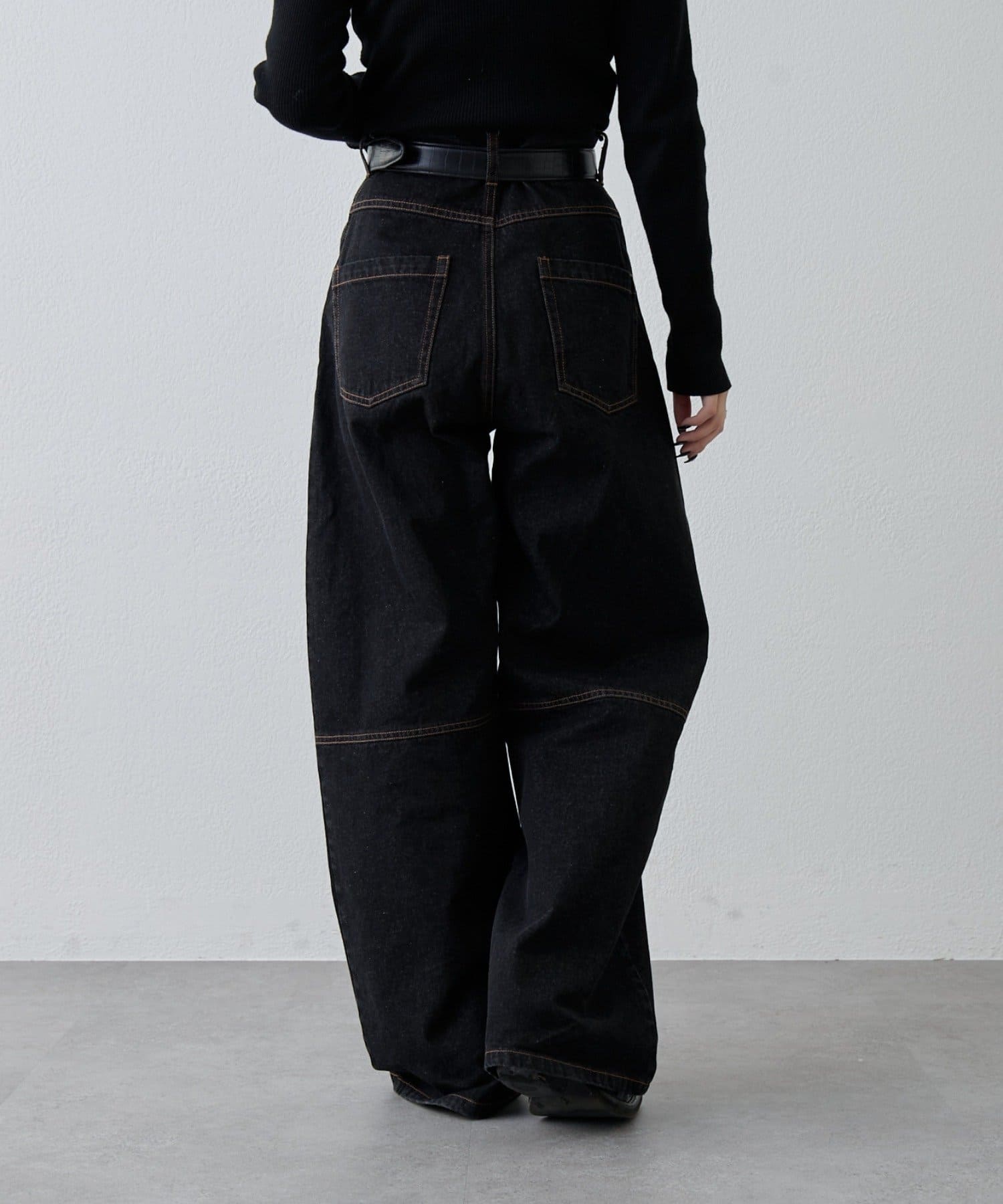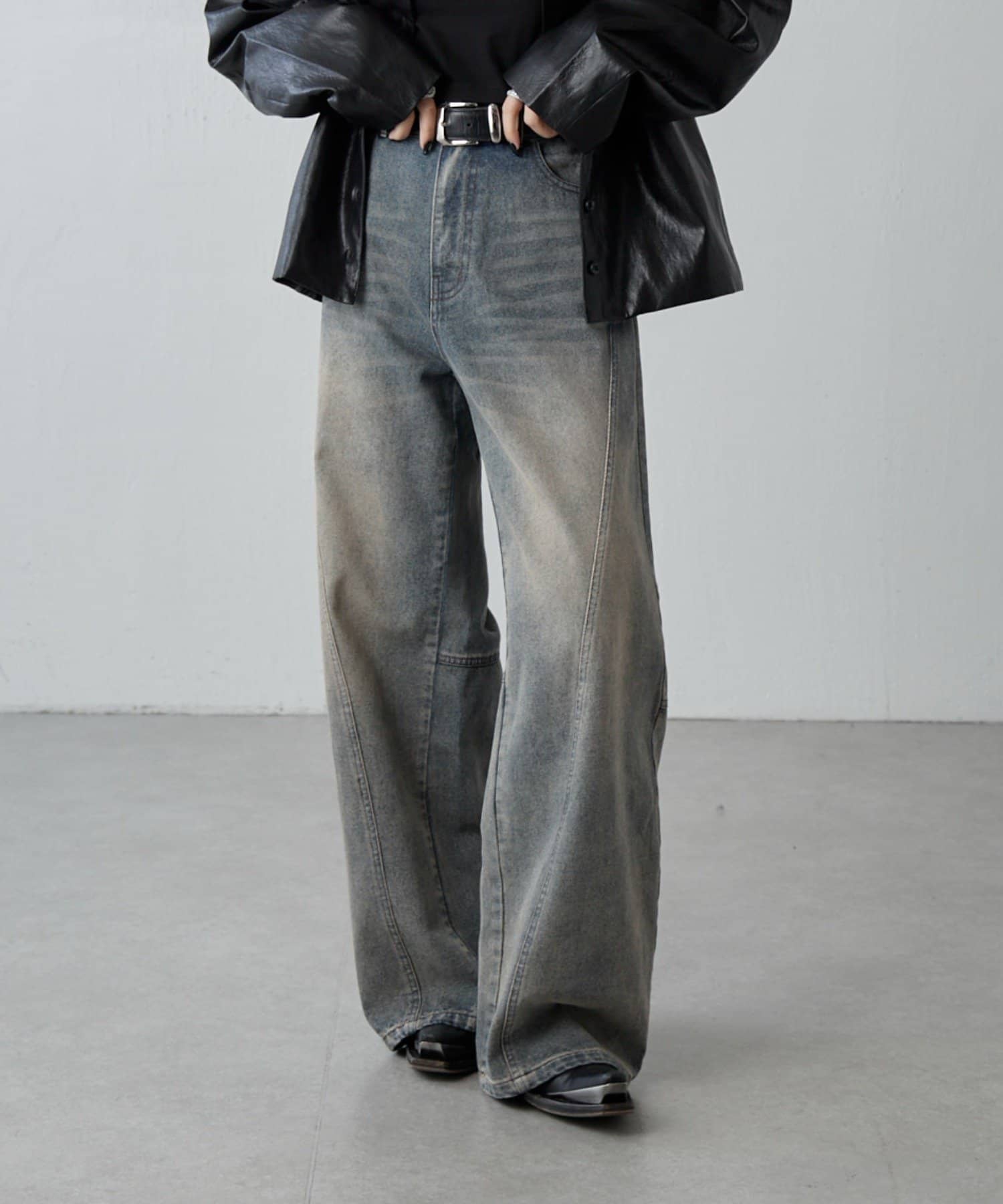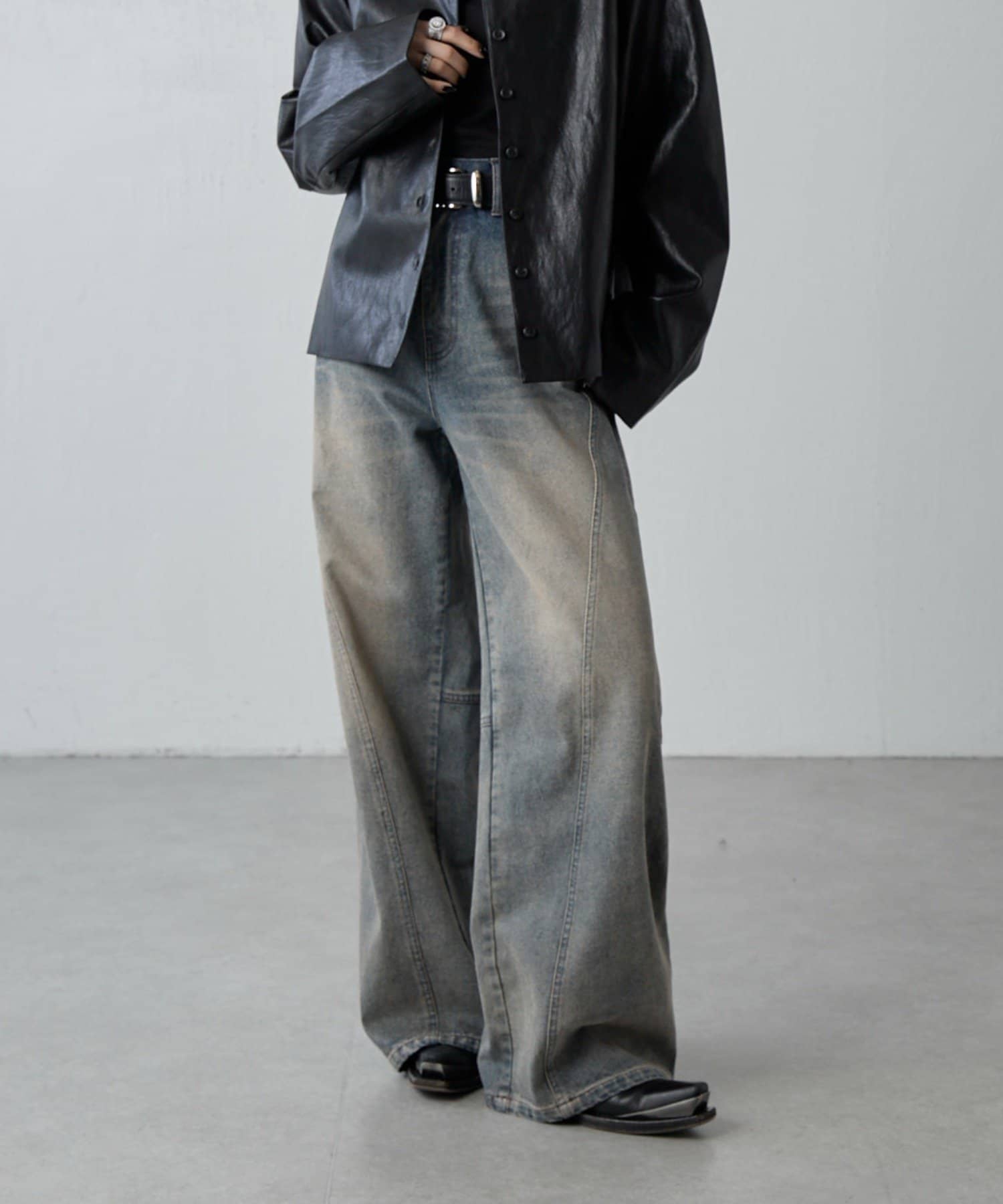 ルーズ感のあるシルエットと絶妙なカラーが魅力。切替デザインでバックシルエットも映えるワイドデニム