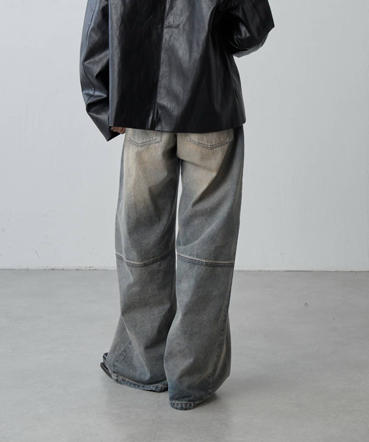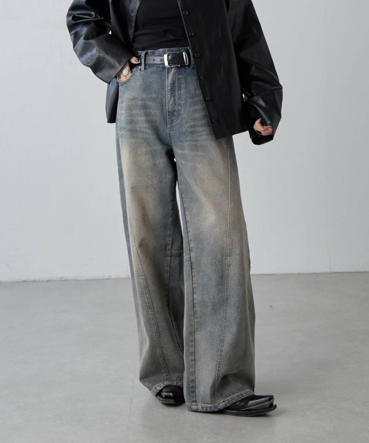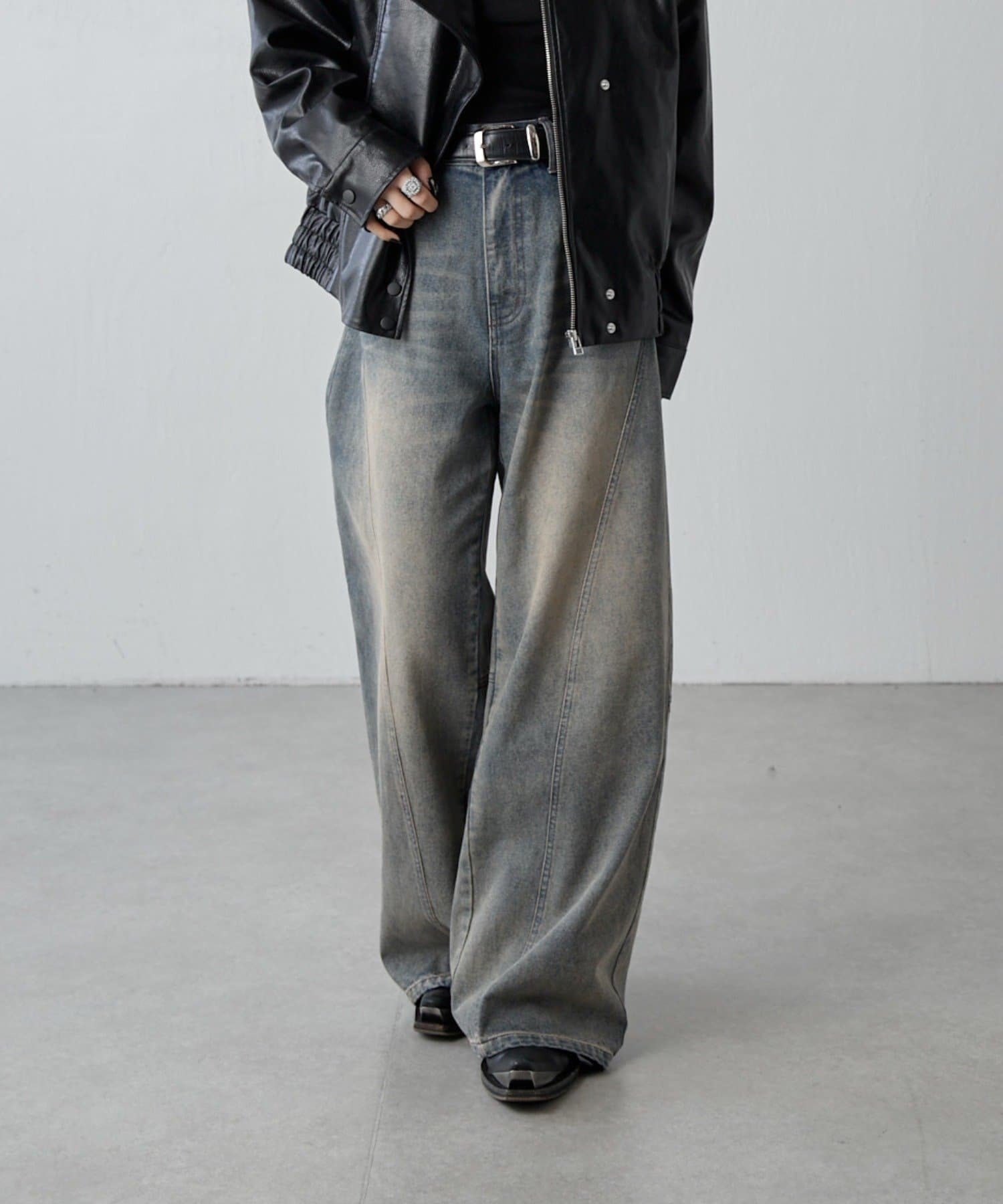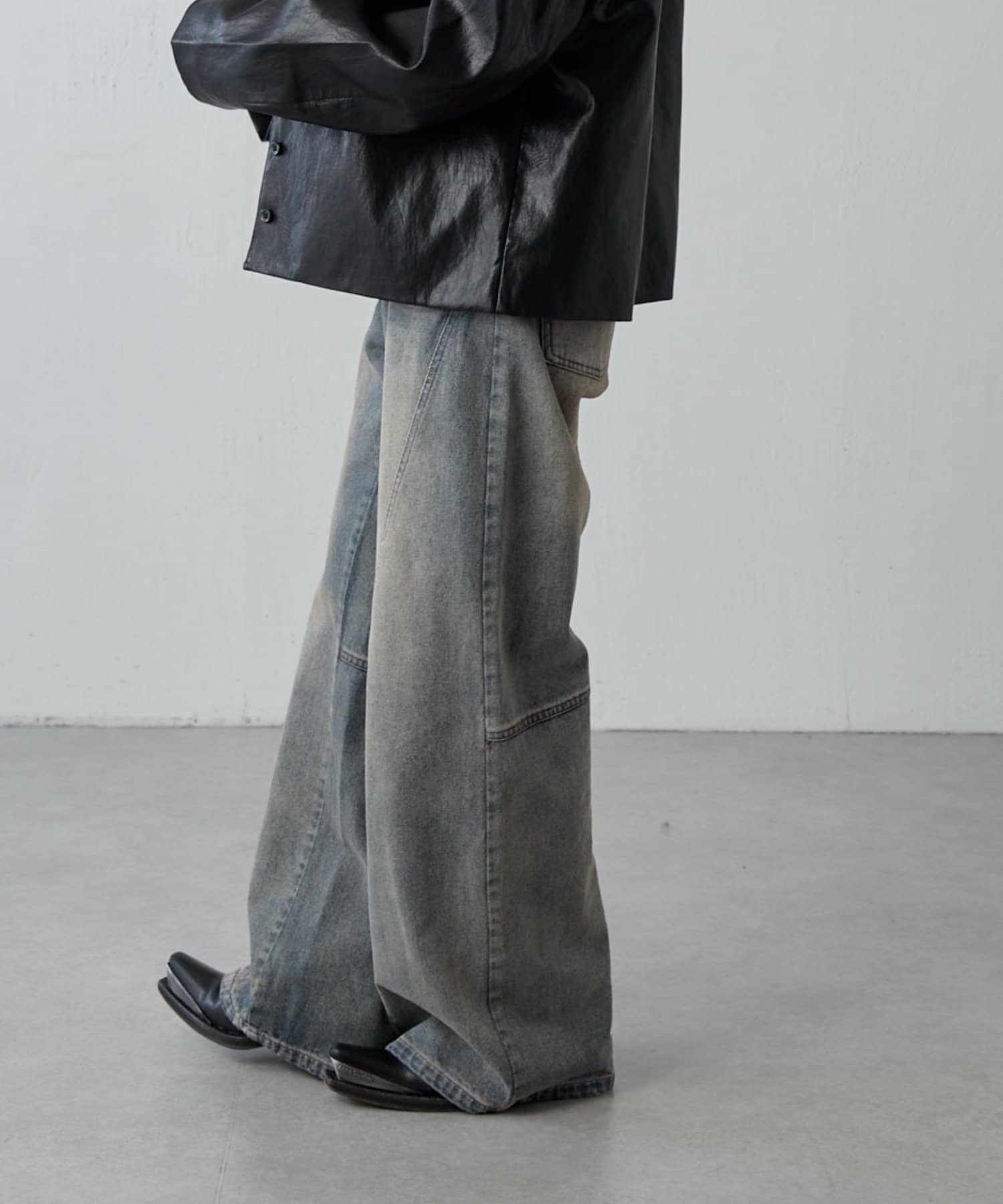 ルーズ感のあるシルエットと絶妙なカラーが魅力。切替デザインでバックシルエットも映えるワイドデニム