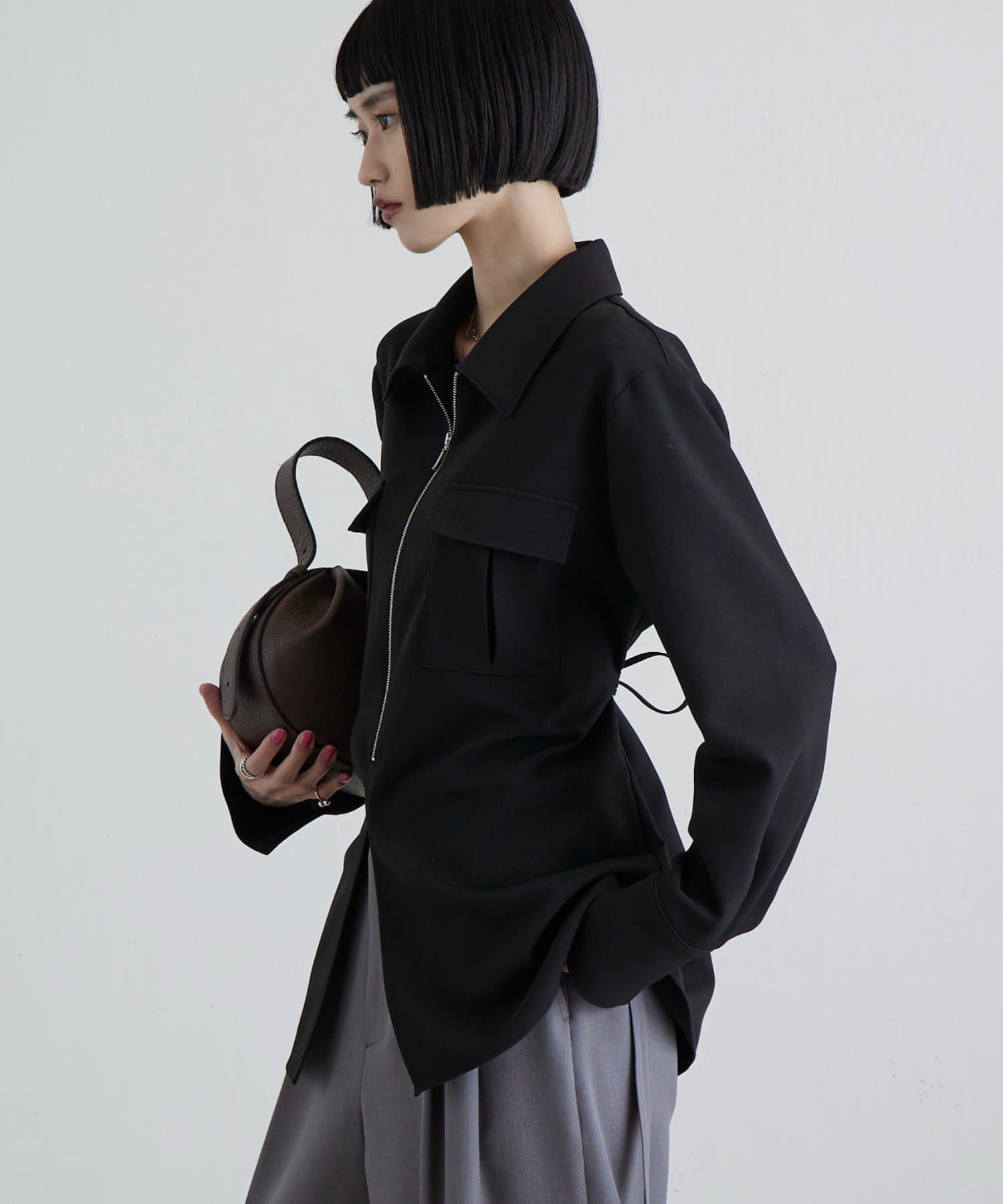 ・やや長めの着丈にウエストシェイプさせ、すっきりとした抜け感も◎