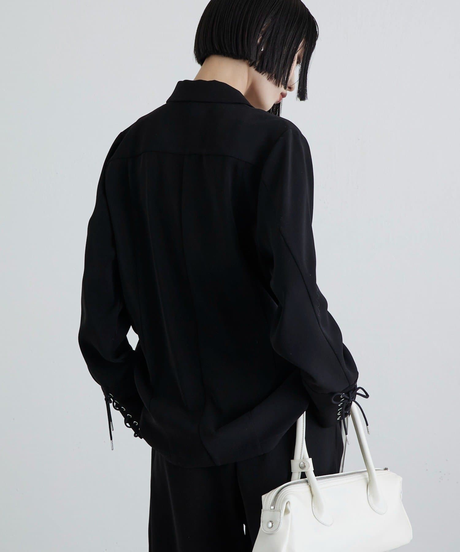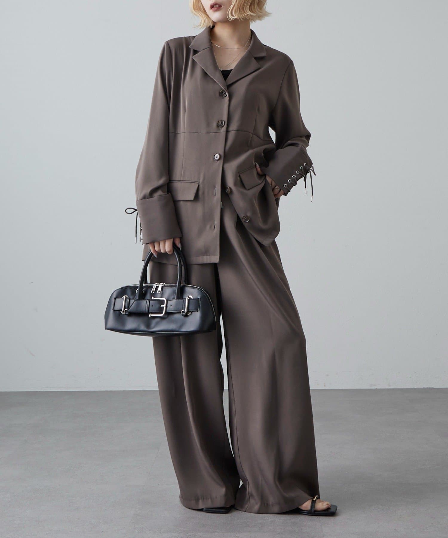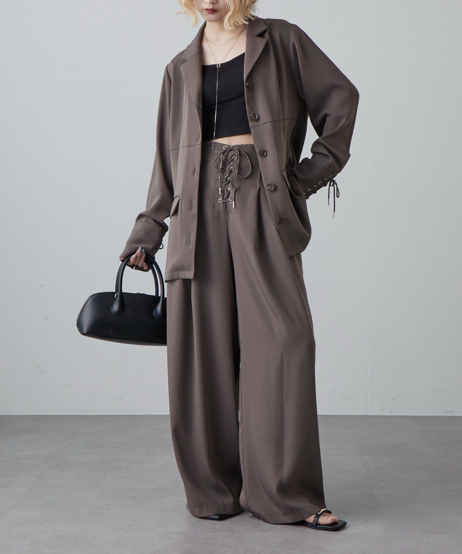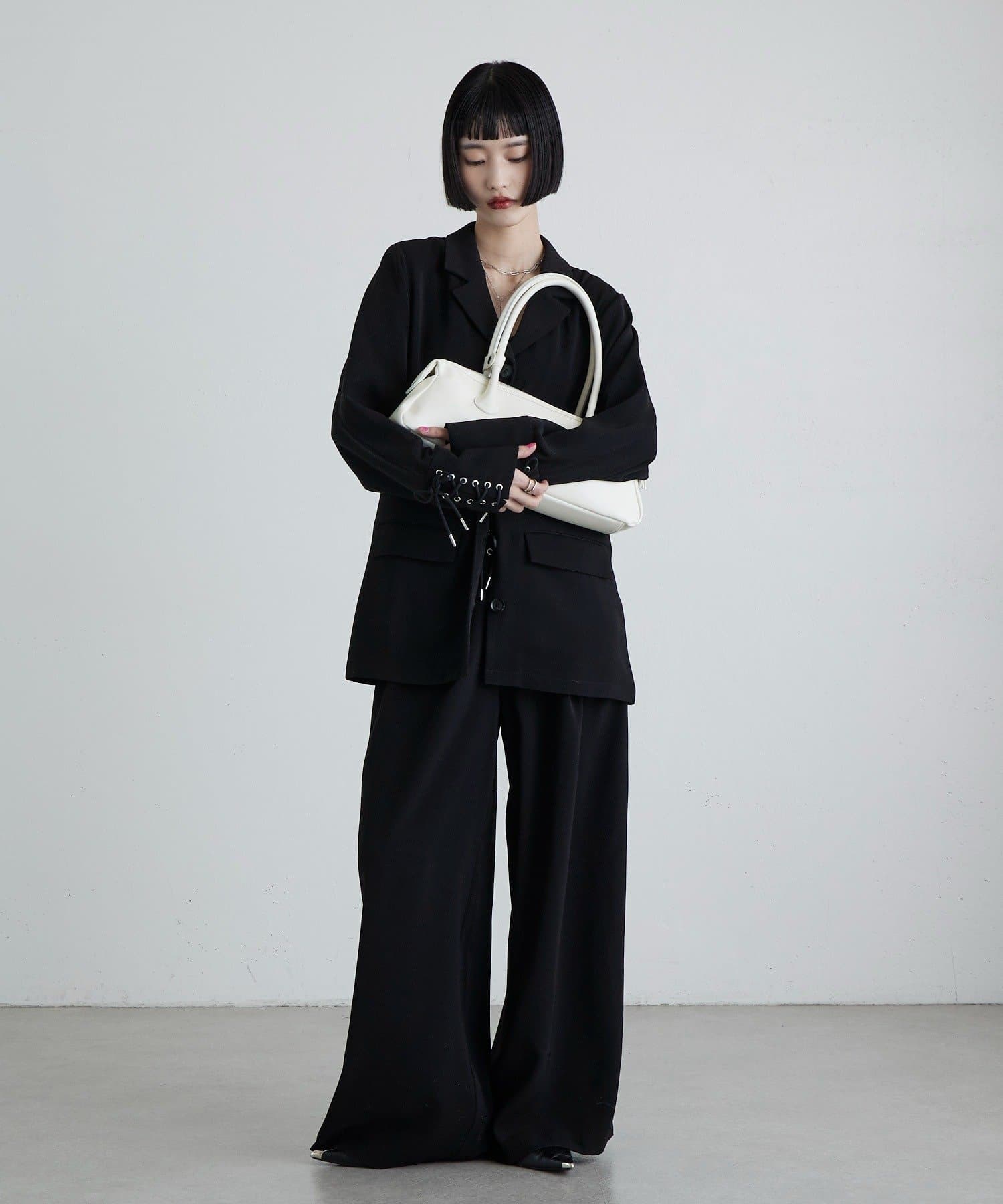 同素材のレースアップパンツと合わせたキレイめモードなスタイルにピッタリ。