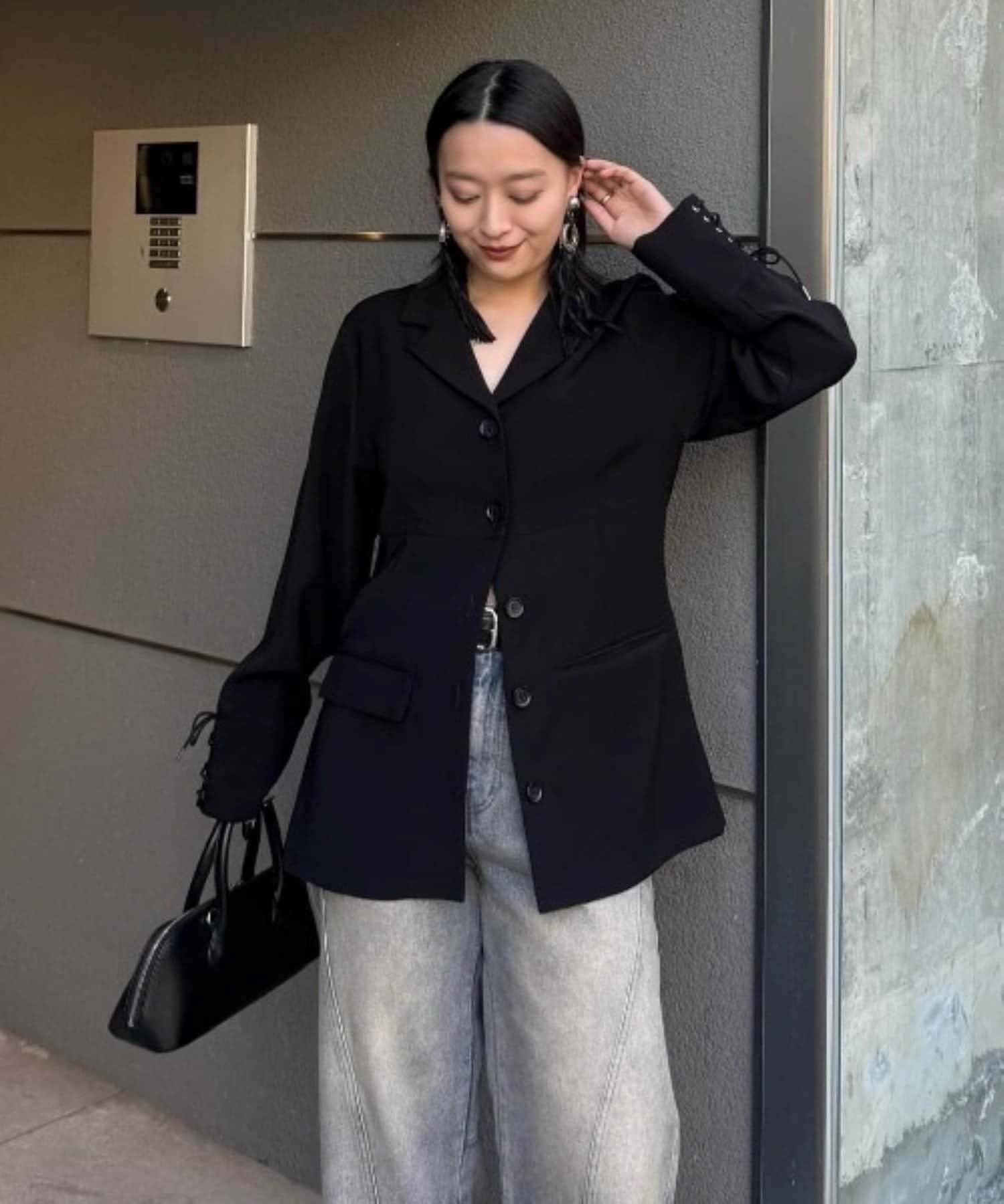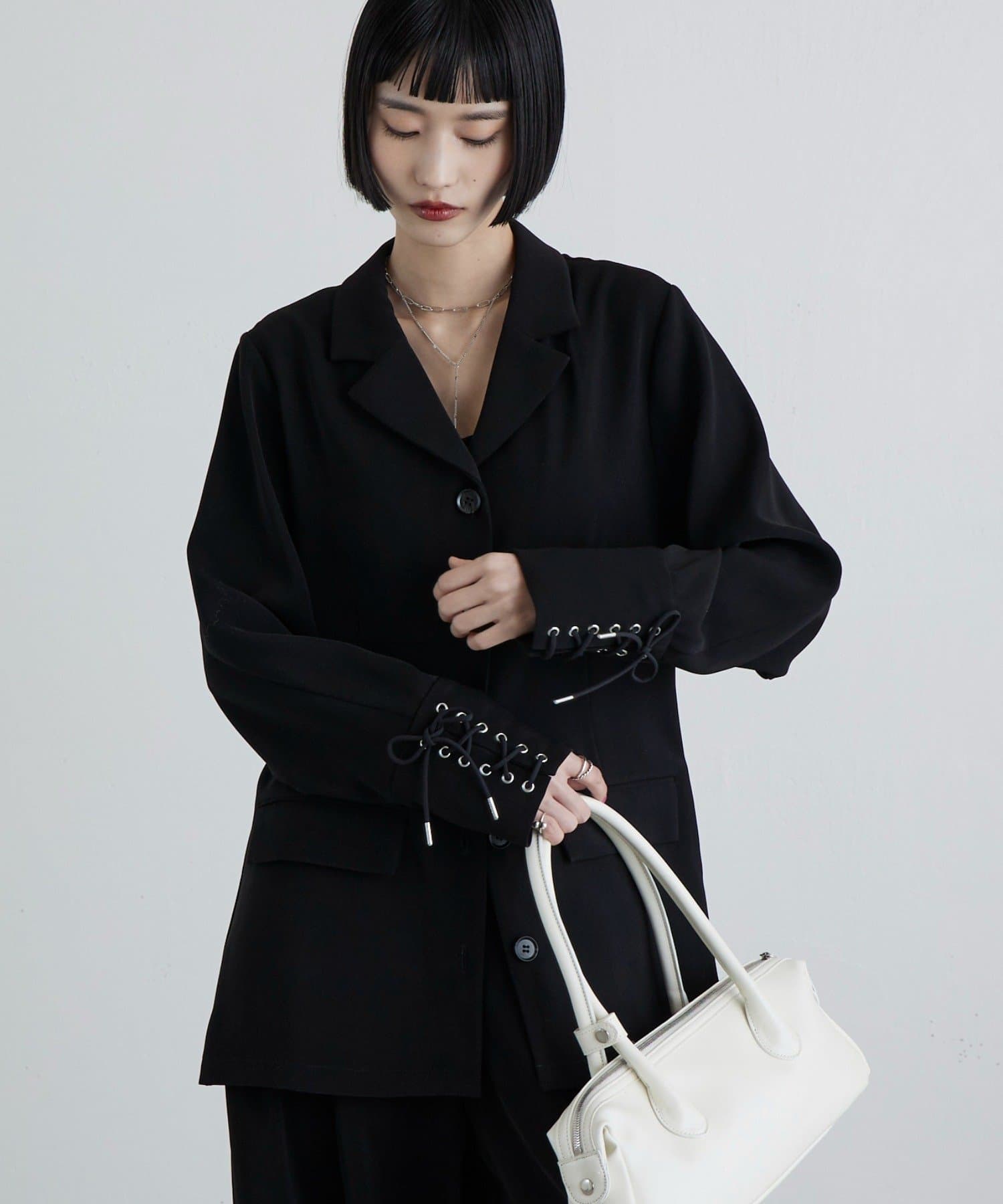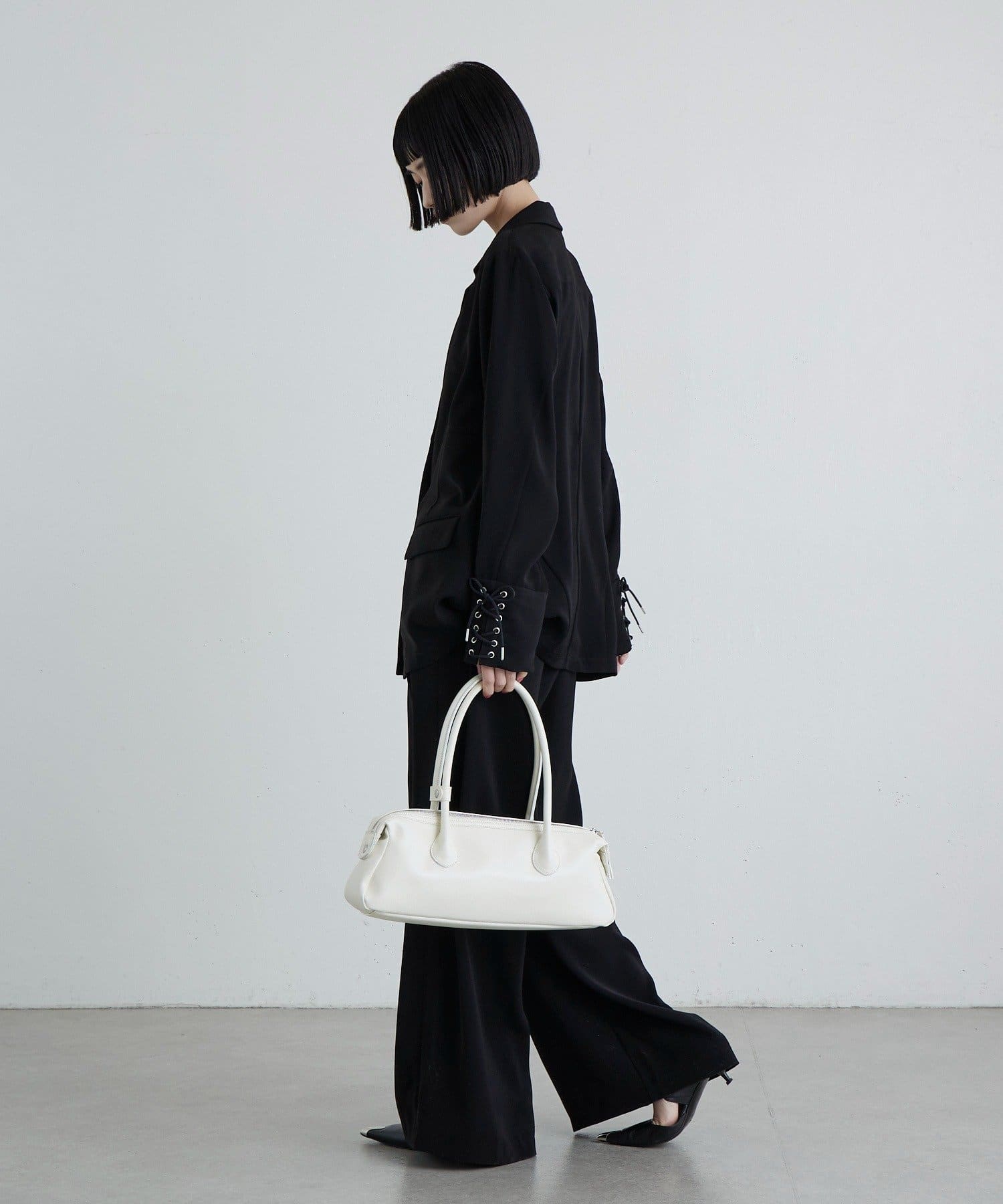 同素材のレースアップパンツと合わせたキレイめモードなスタイルにピッタリ。