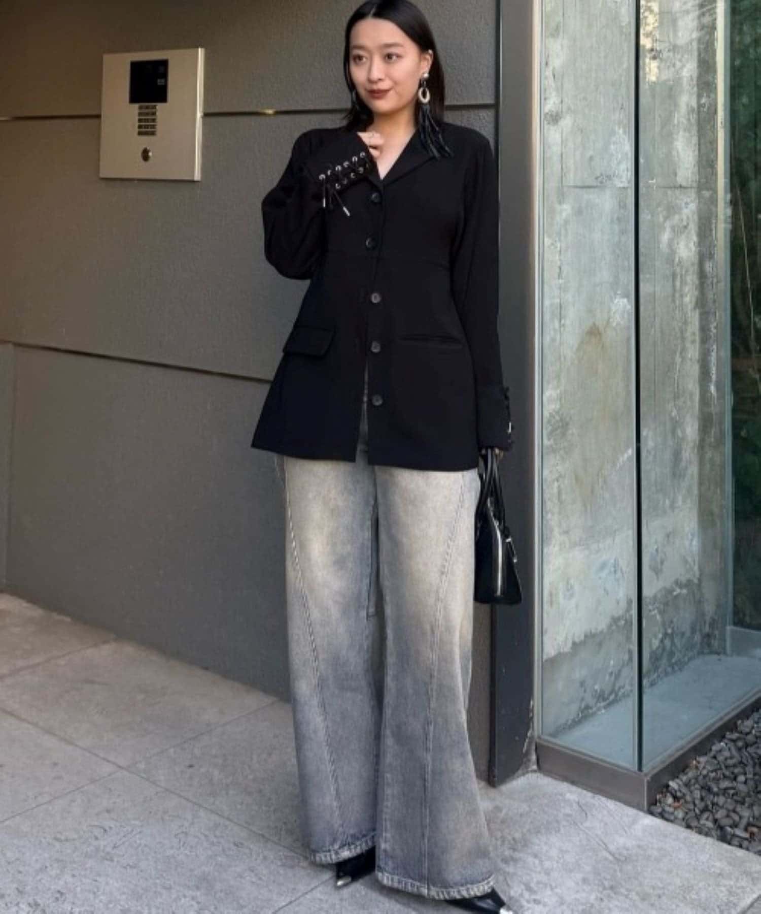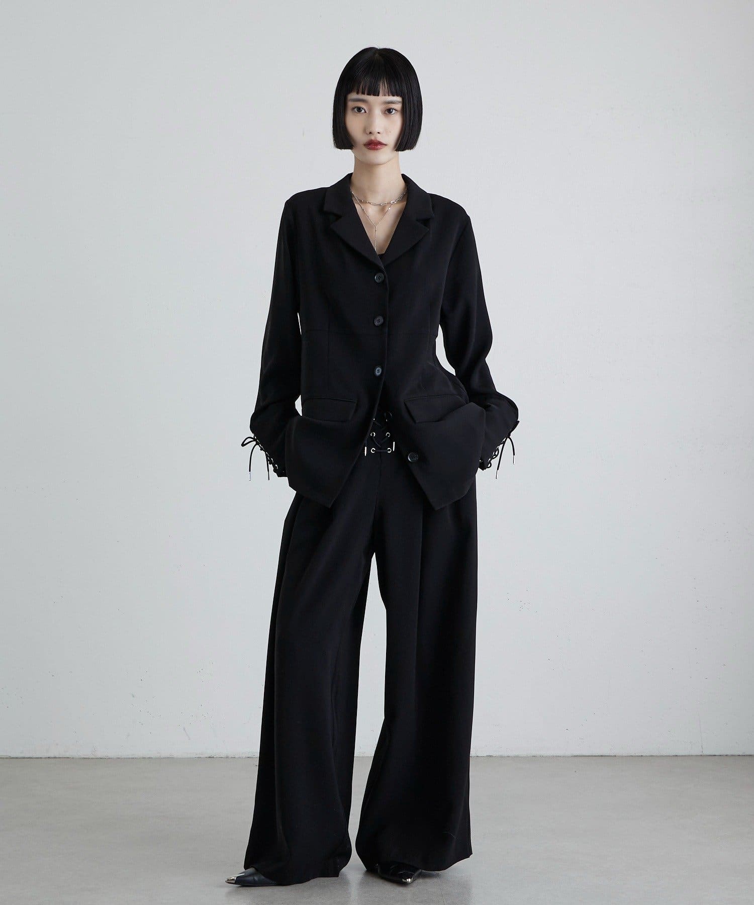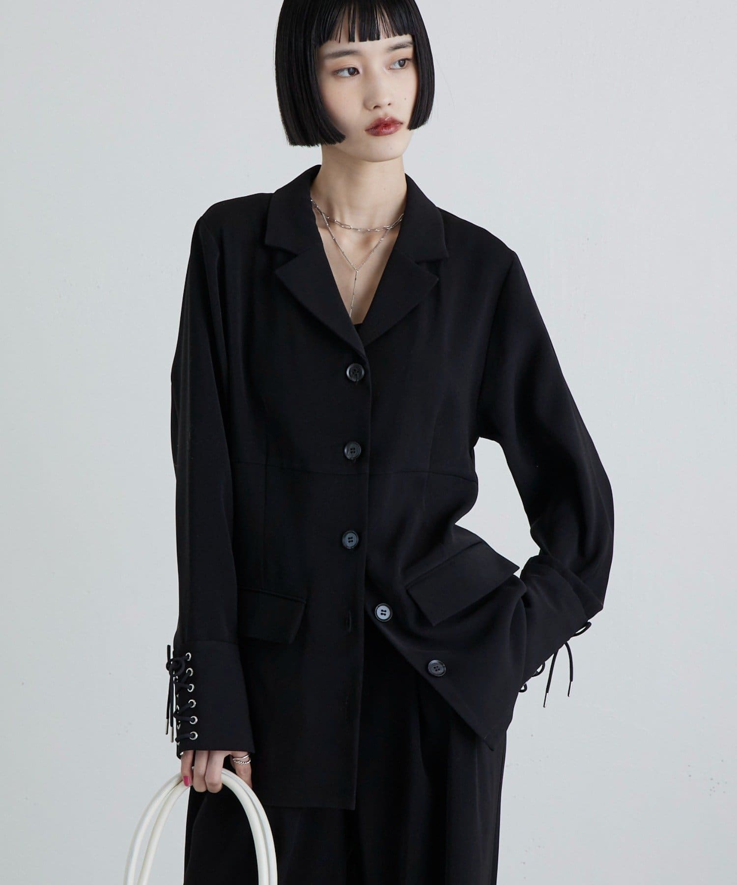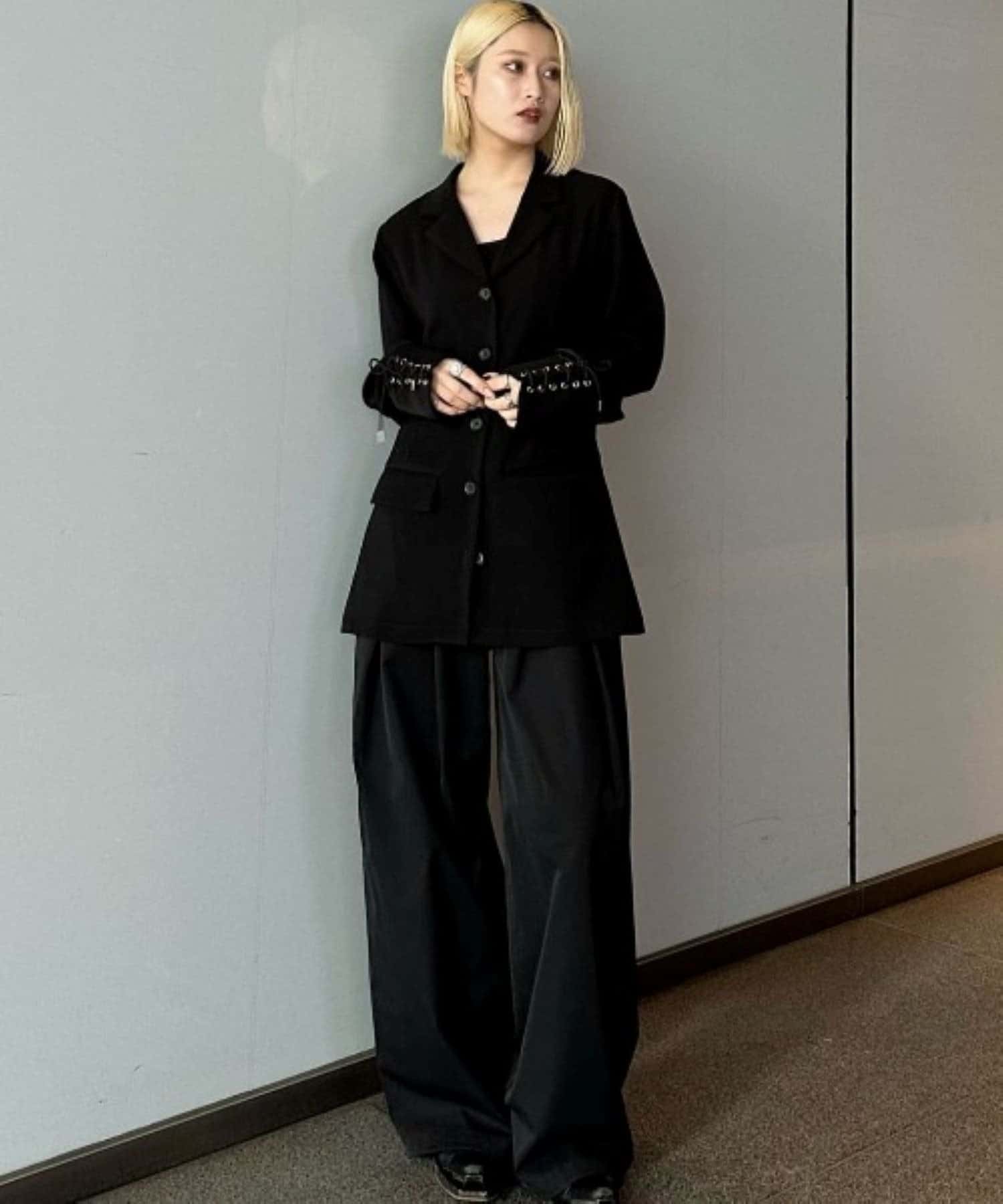 同素材のレースアップパンツと合わせたキレイめモードなスタイルにピッタリ。