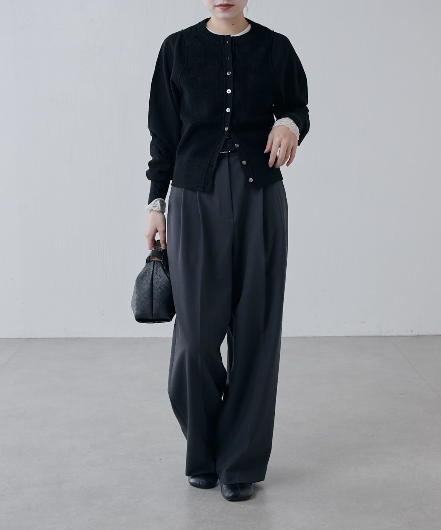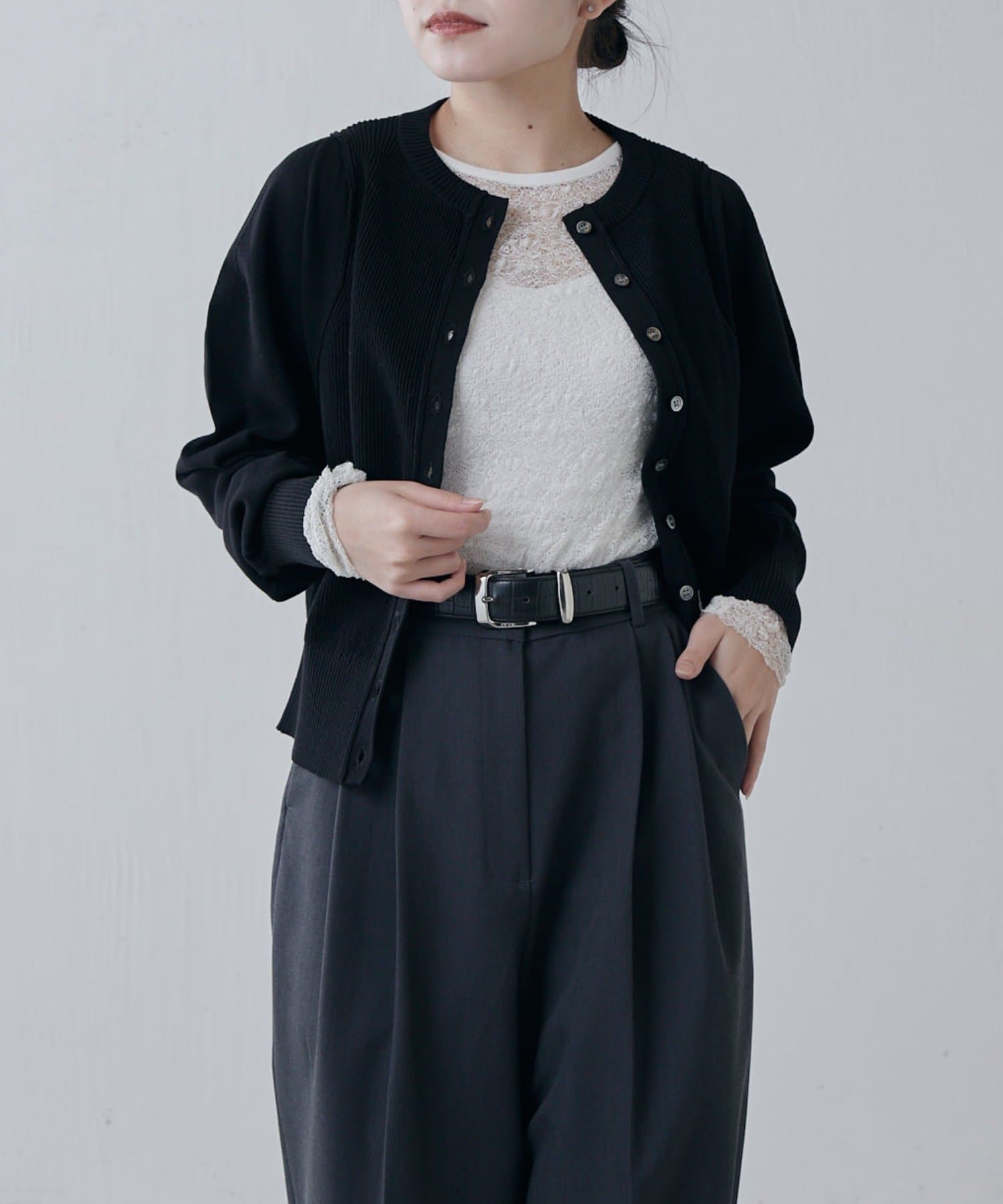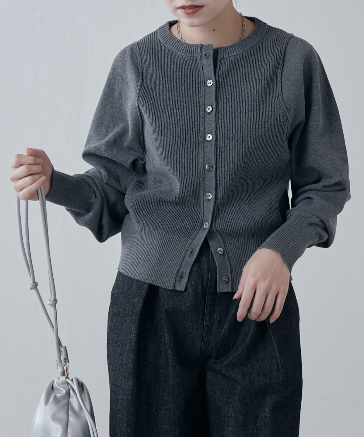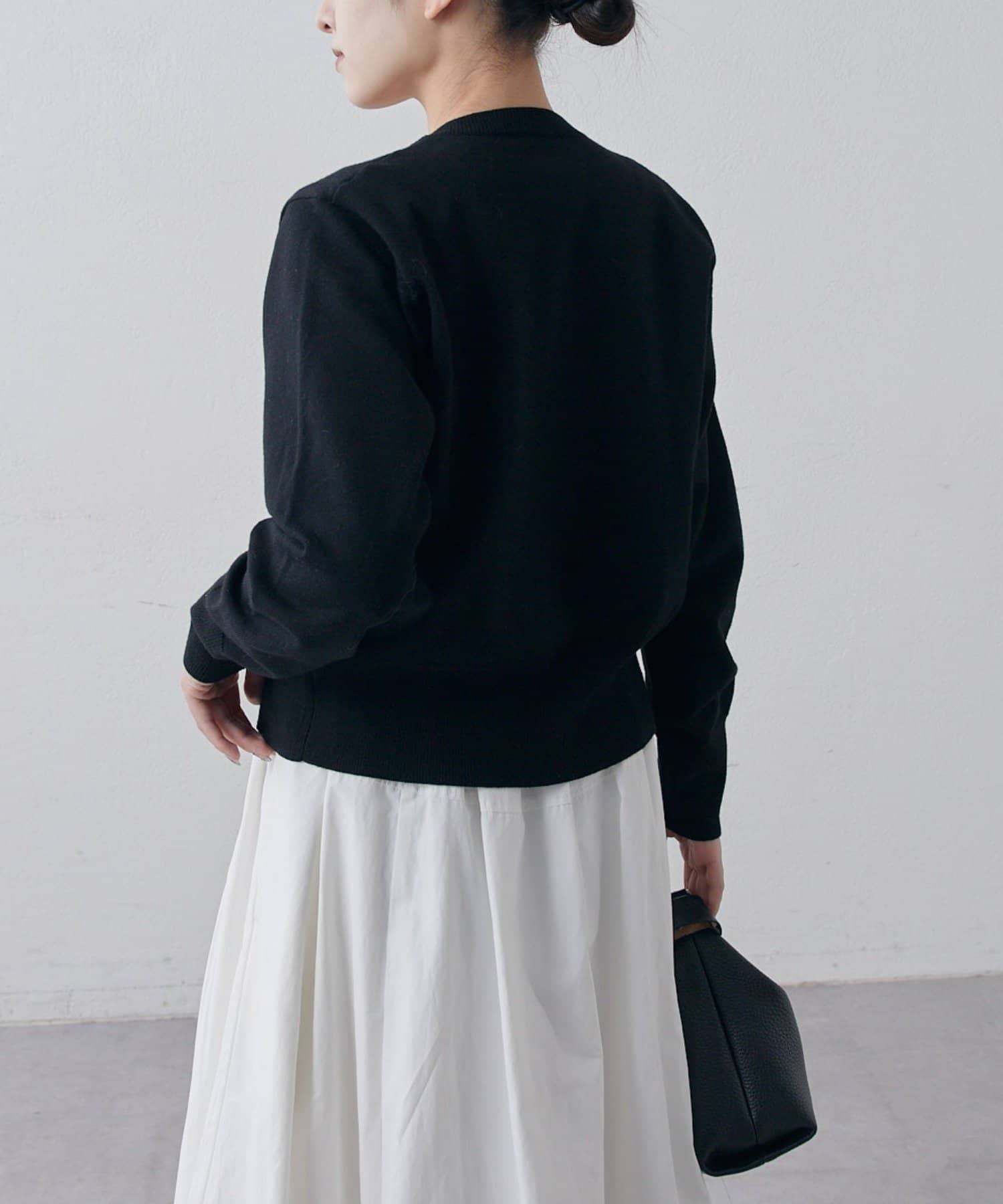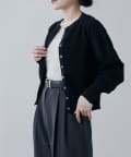 ジャストな着丈のカーディガンはボタンを閉めて、ニットトップスとしても着用が可能。
