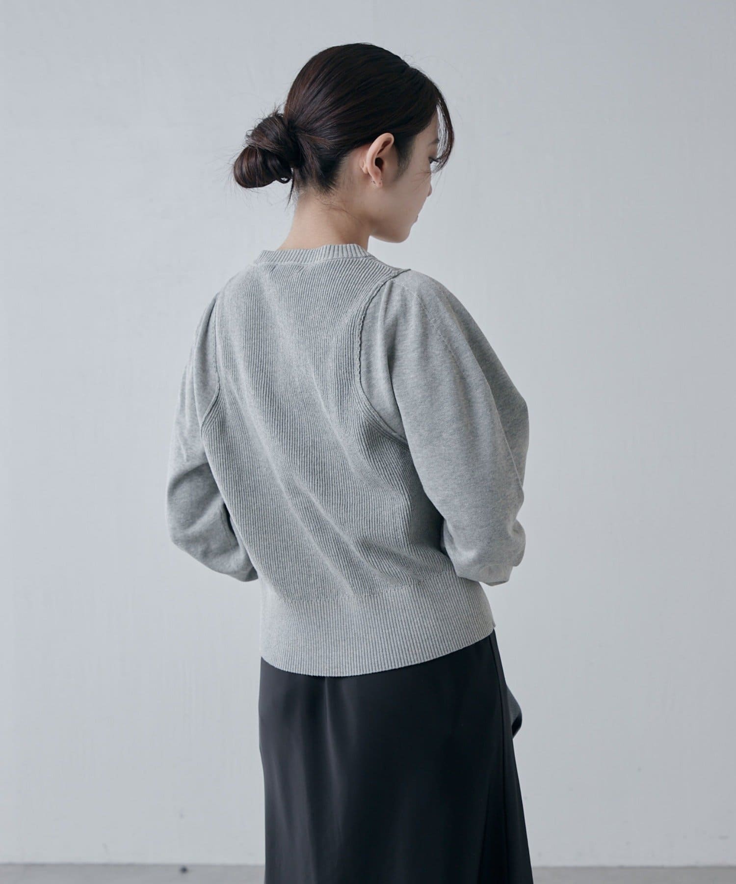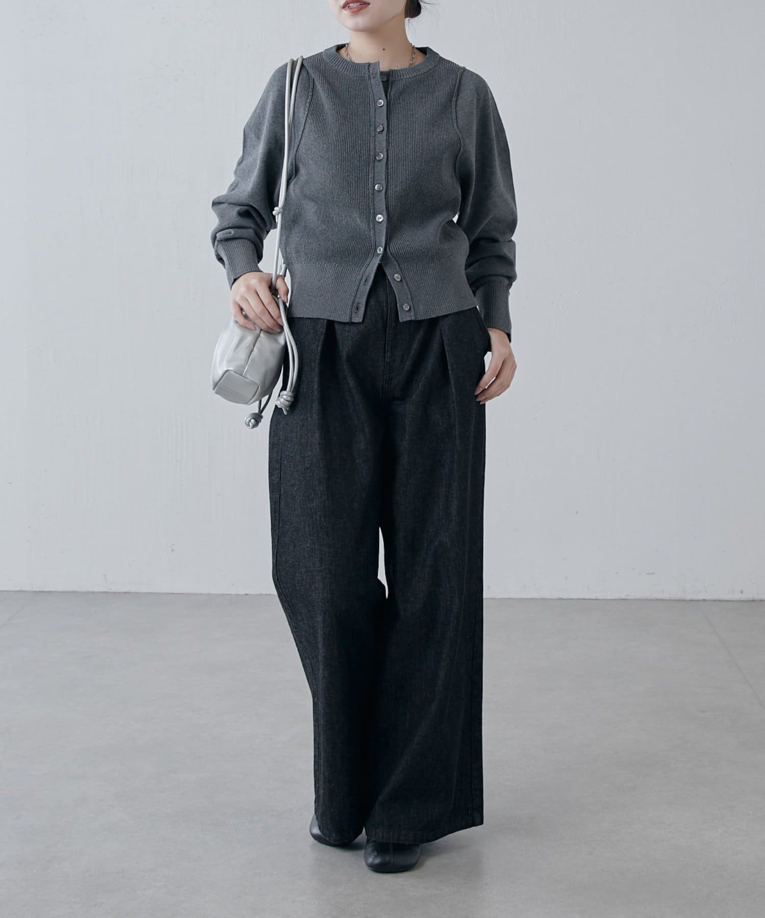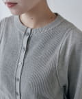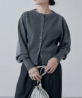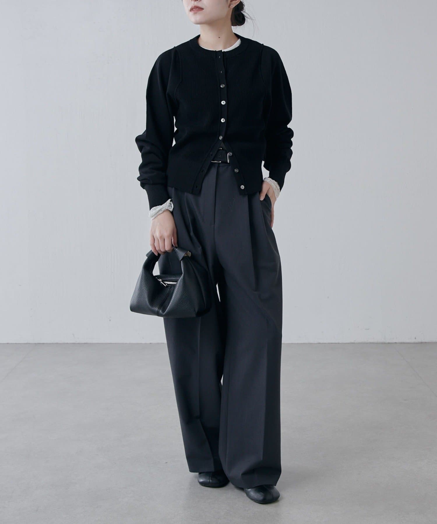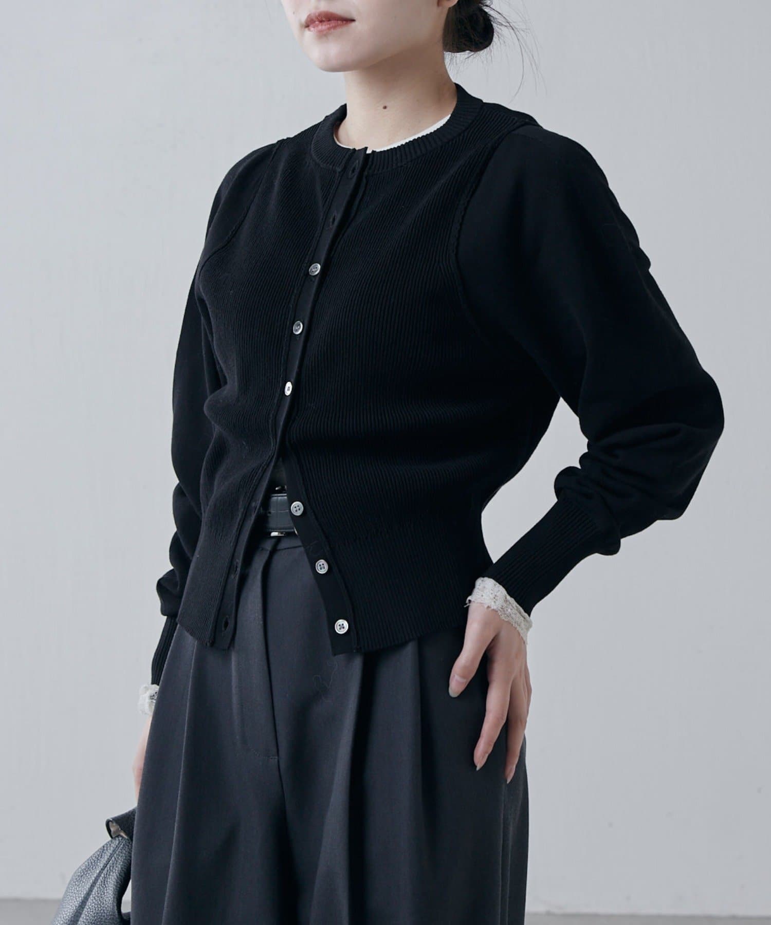 ジャストな着丈のカーディガンはボタンを閉めて、ニットトップスとしても着用が可能。