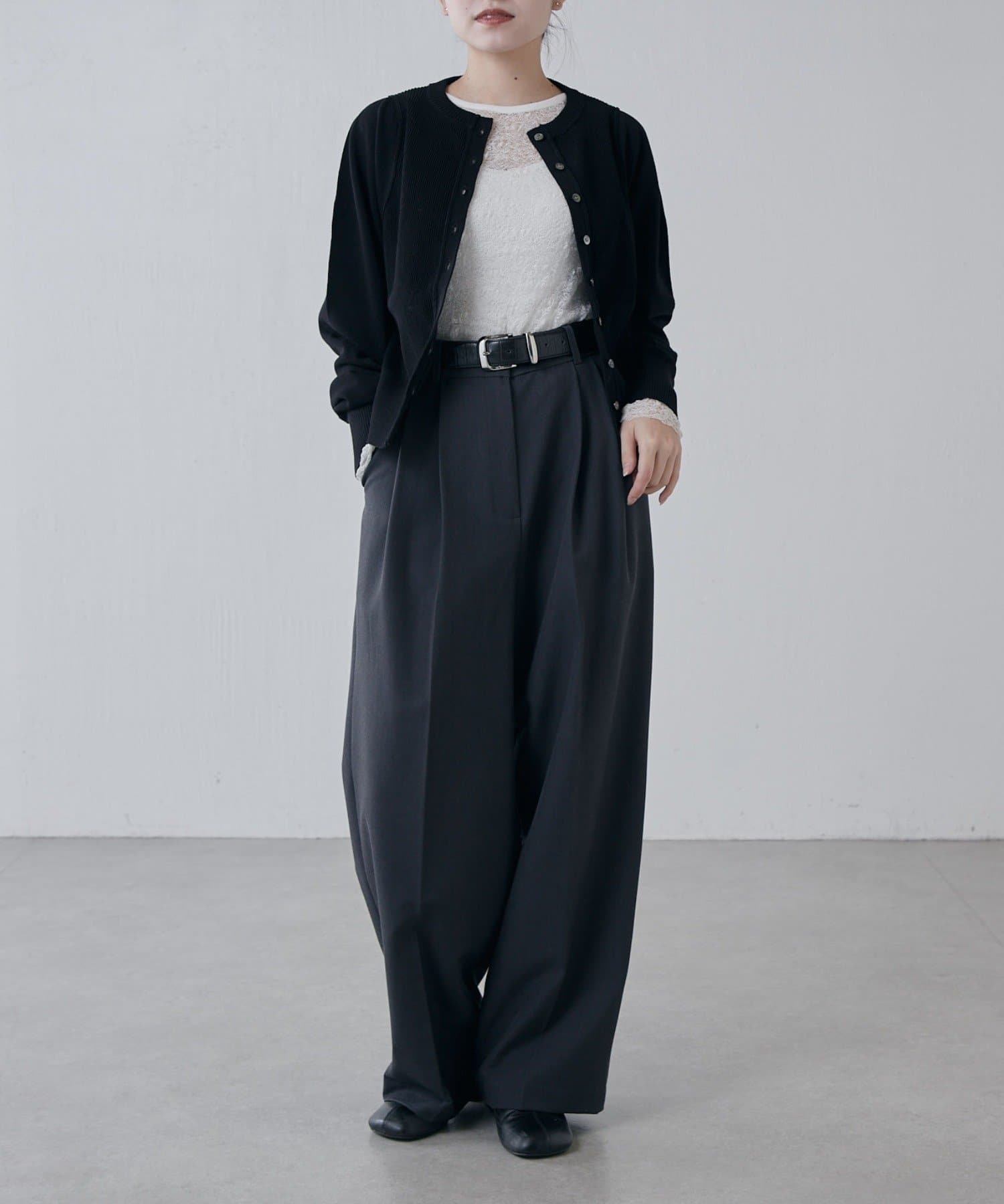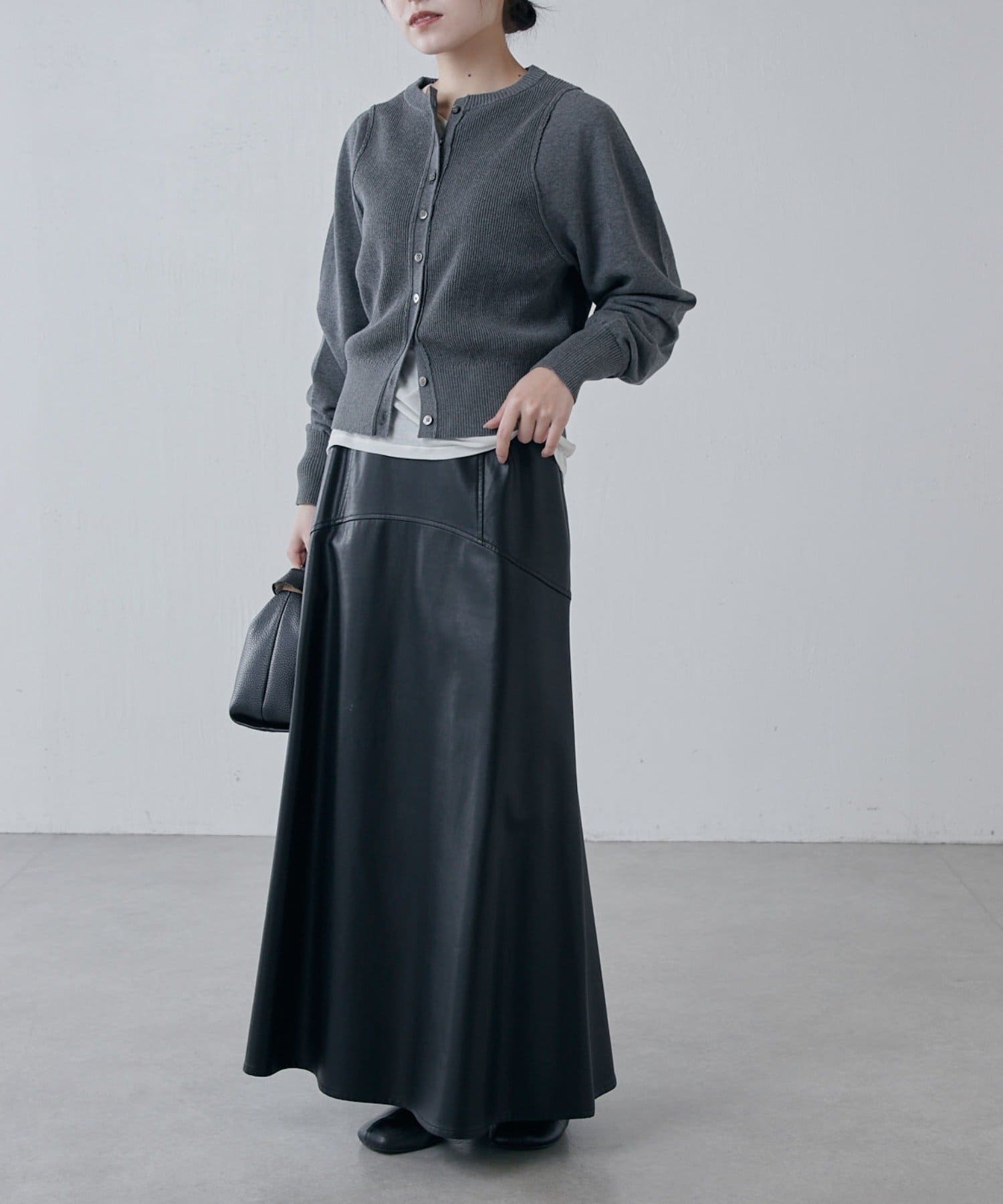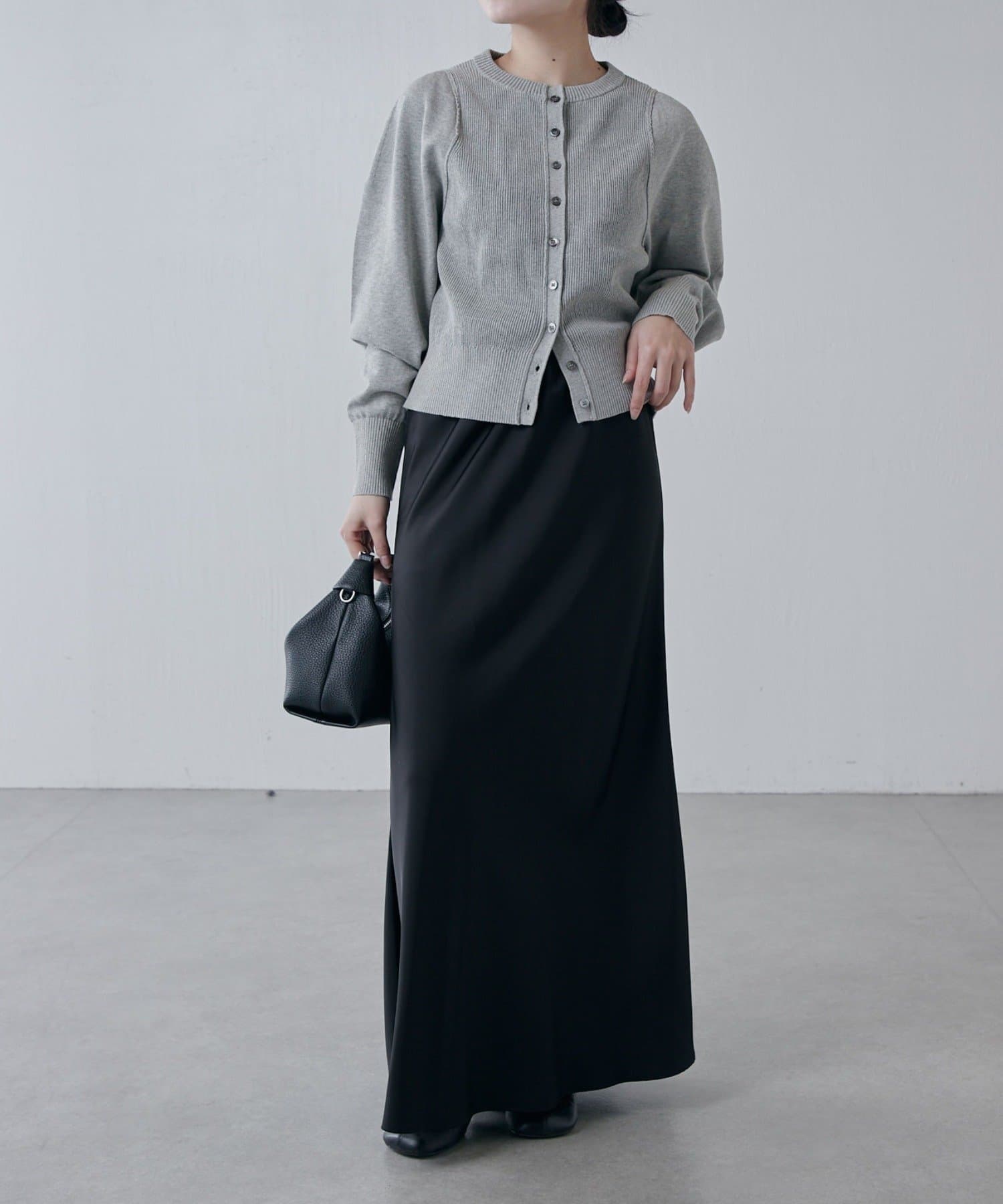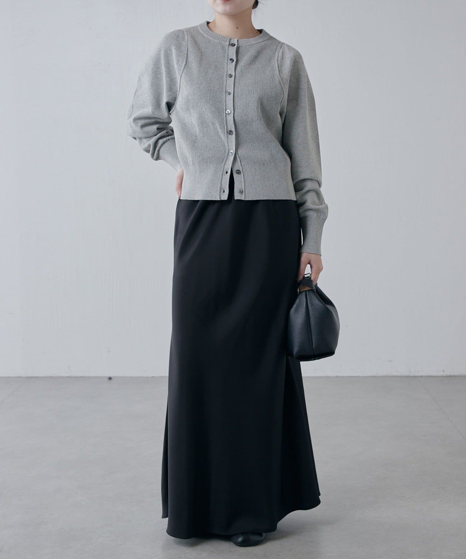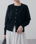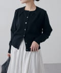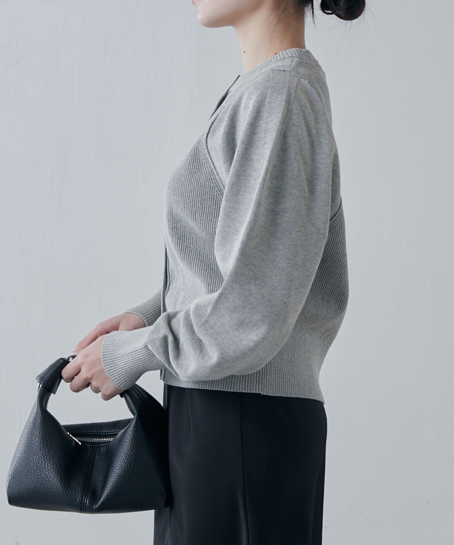 ジャストな着丈のカーディガンはボタンを閉めて、ニットトップスとしても着用が可能。