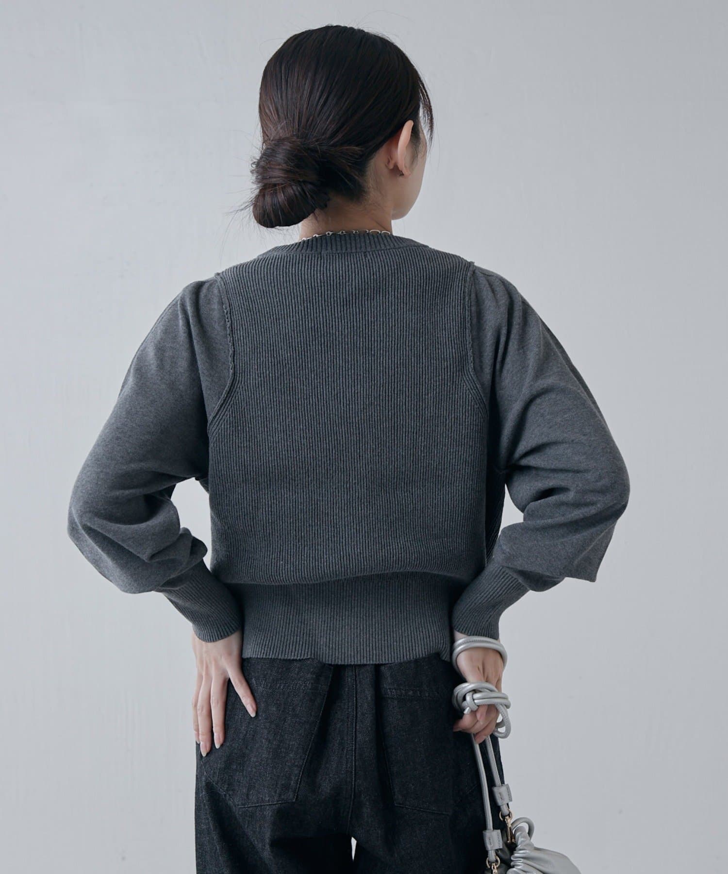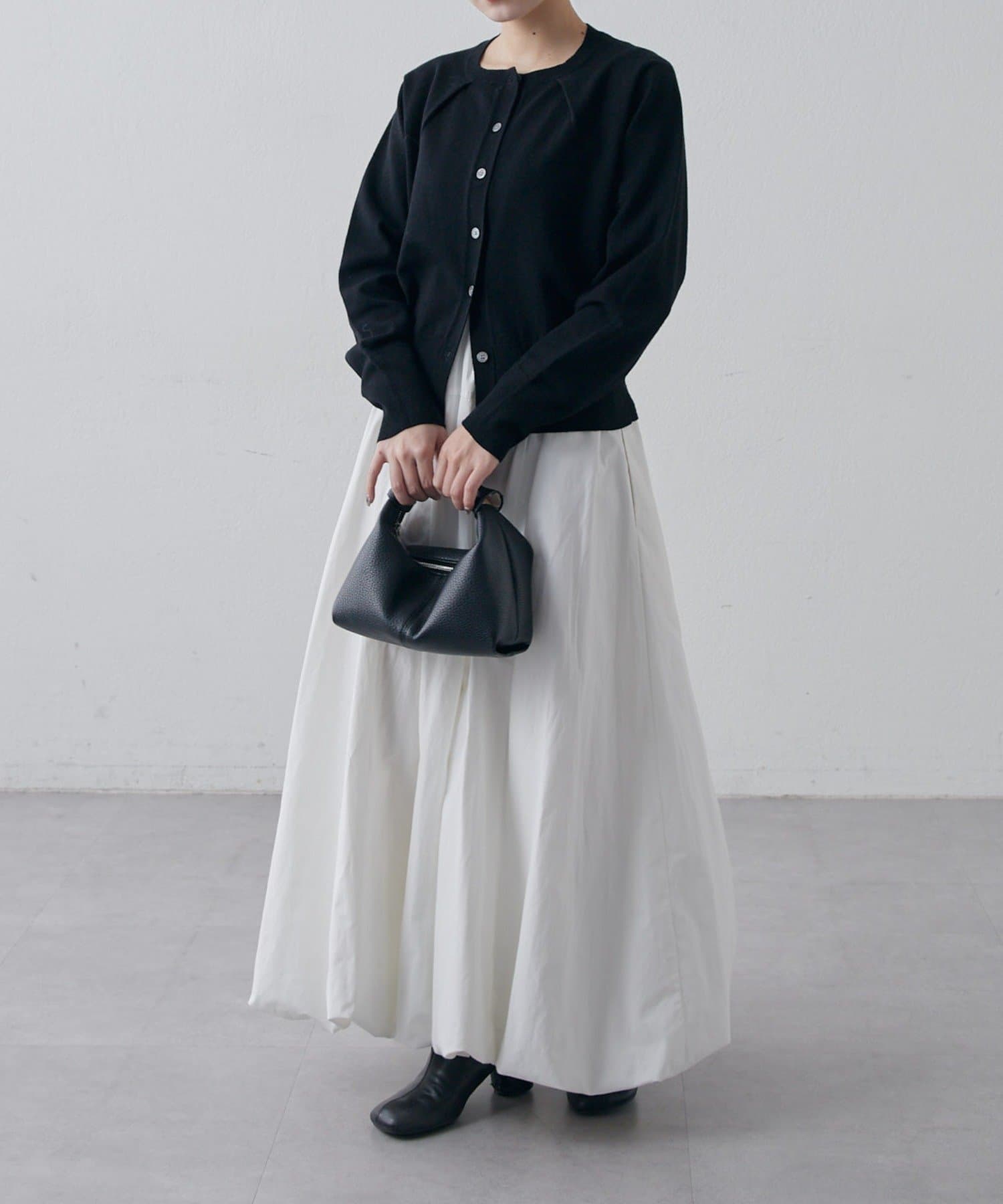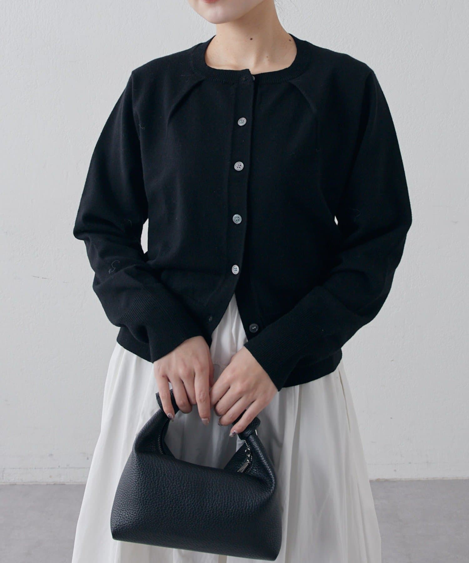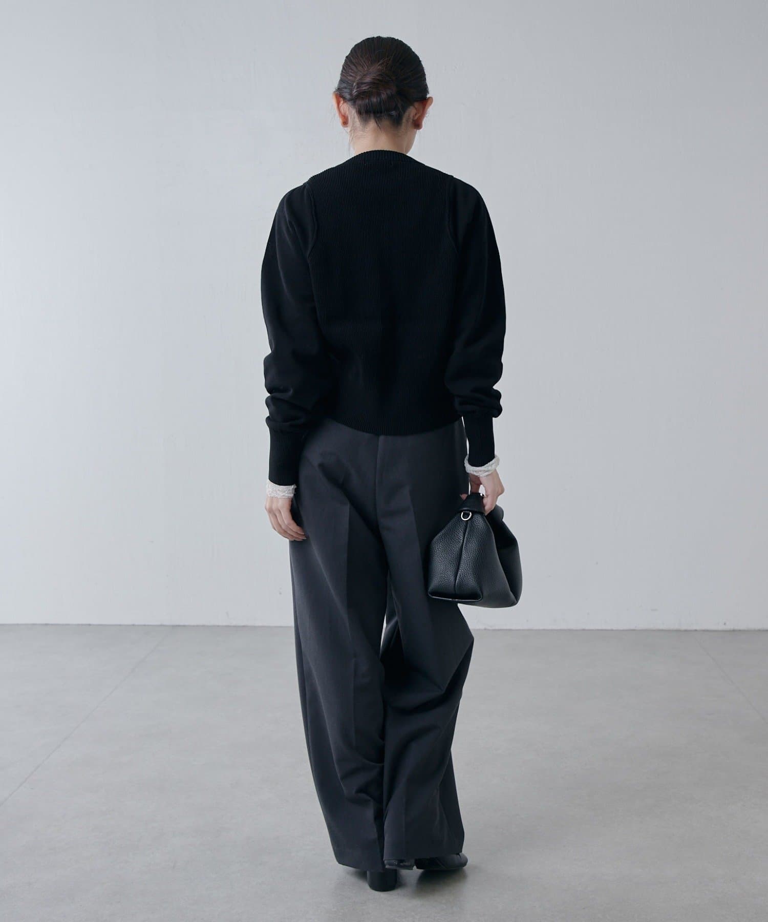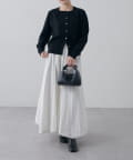 ジャストな着丈のカーディガンはボタンを閉めて、ニットトップスとしても着用が可能。