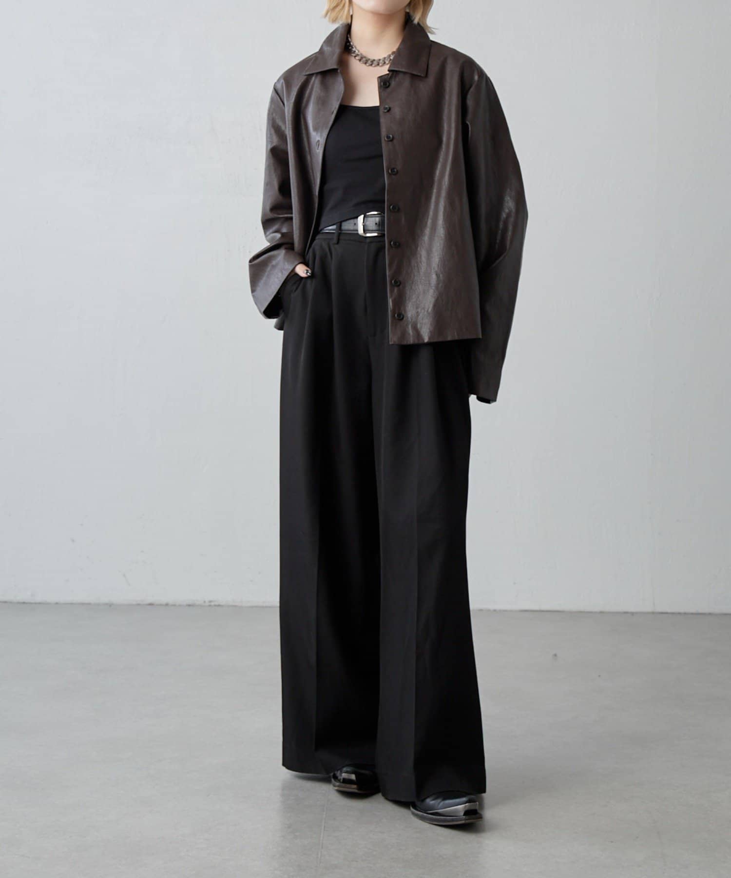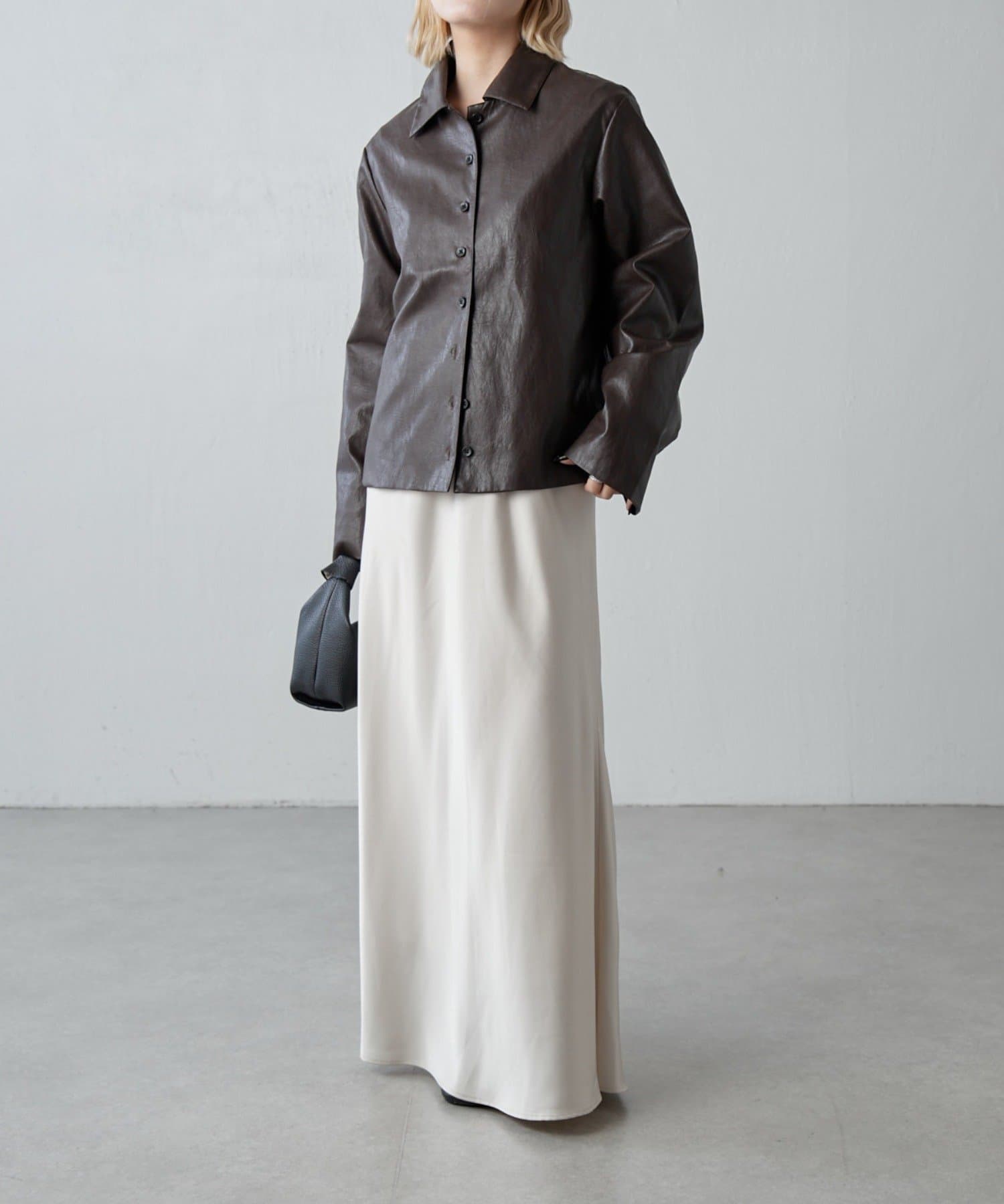 程よ艶感のフェイクレザーを使用したシャツ。