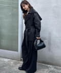 スッキリしたボトムスにはトレンチコートのベルトをローウエストでしめてシルエットに強弱をつけるのがポイント。