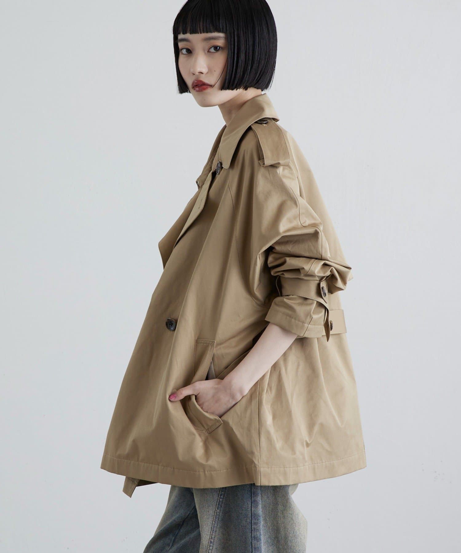 程よいハリとさりげなくナチュラルなムードのある綿ナイロン素材を使用したショートトレンチ。