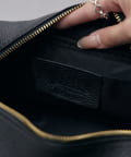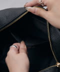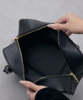 底鋲付きのマチがあり、ダブルジップで開閉も楽ちん。ショルダーストラップ付きの2WAY仕様です。