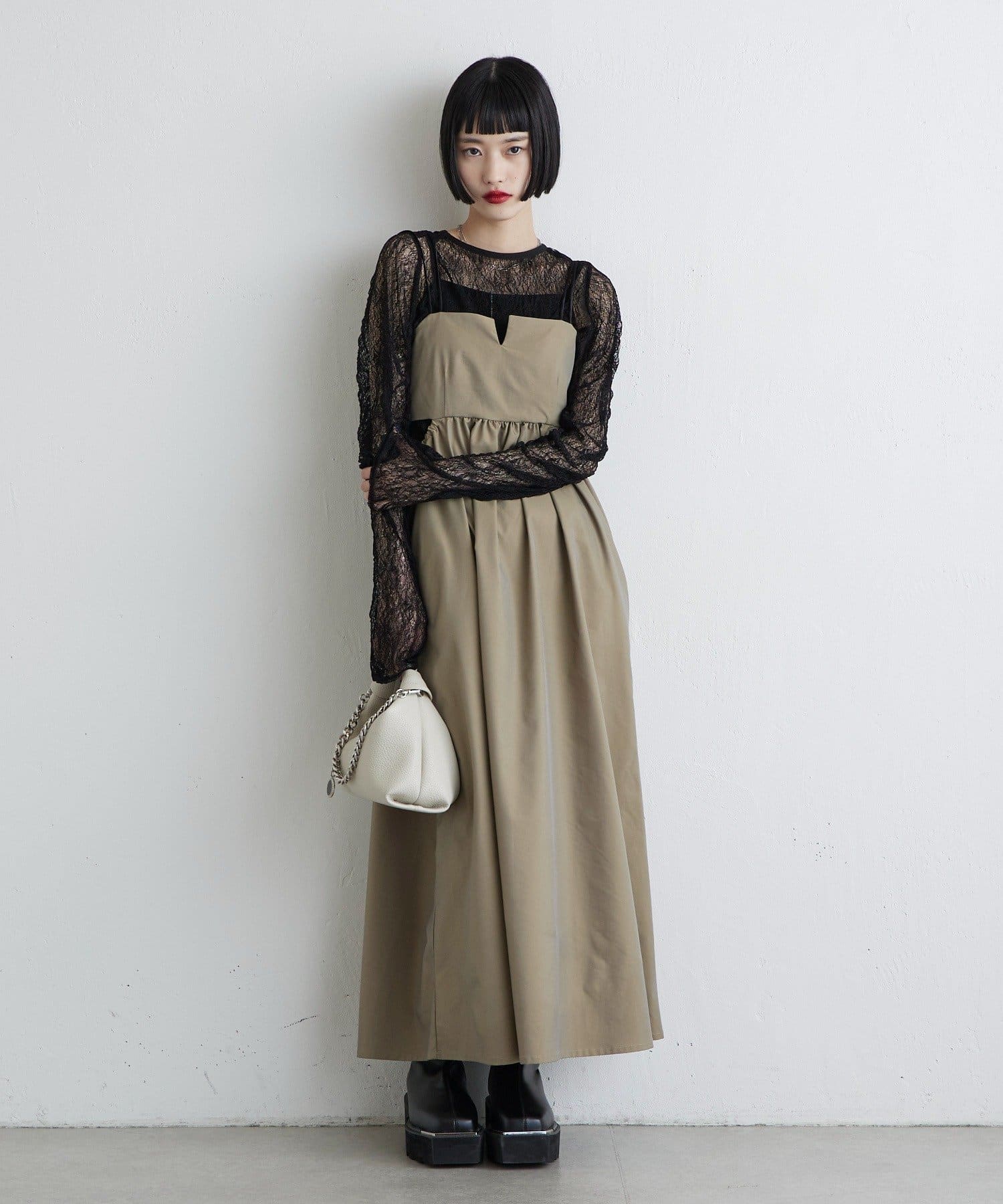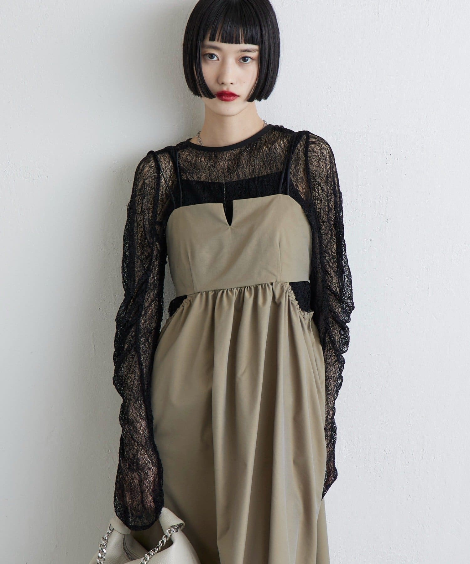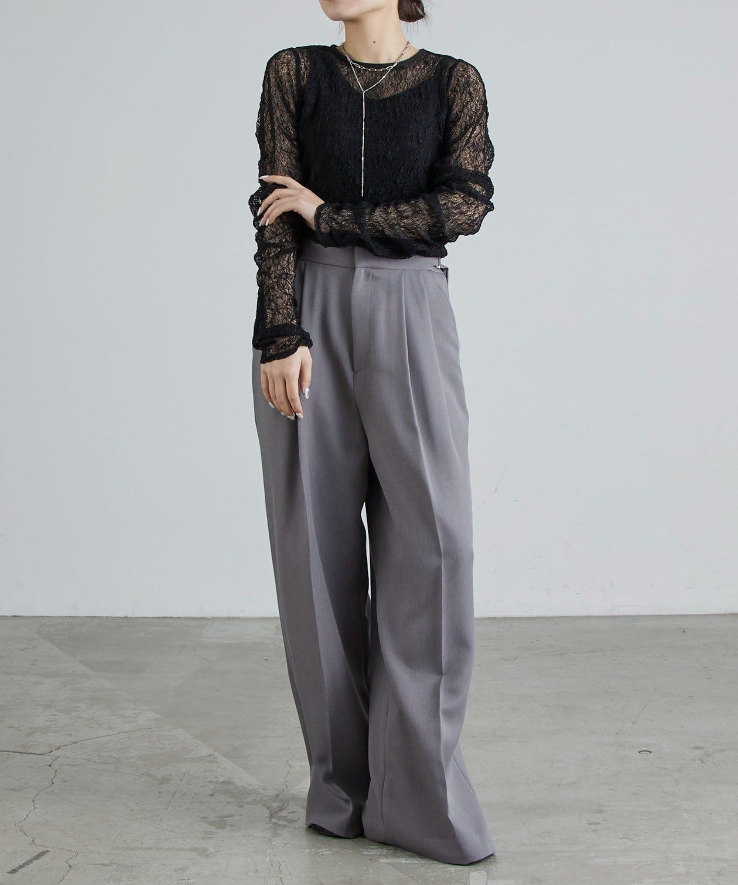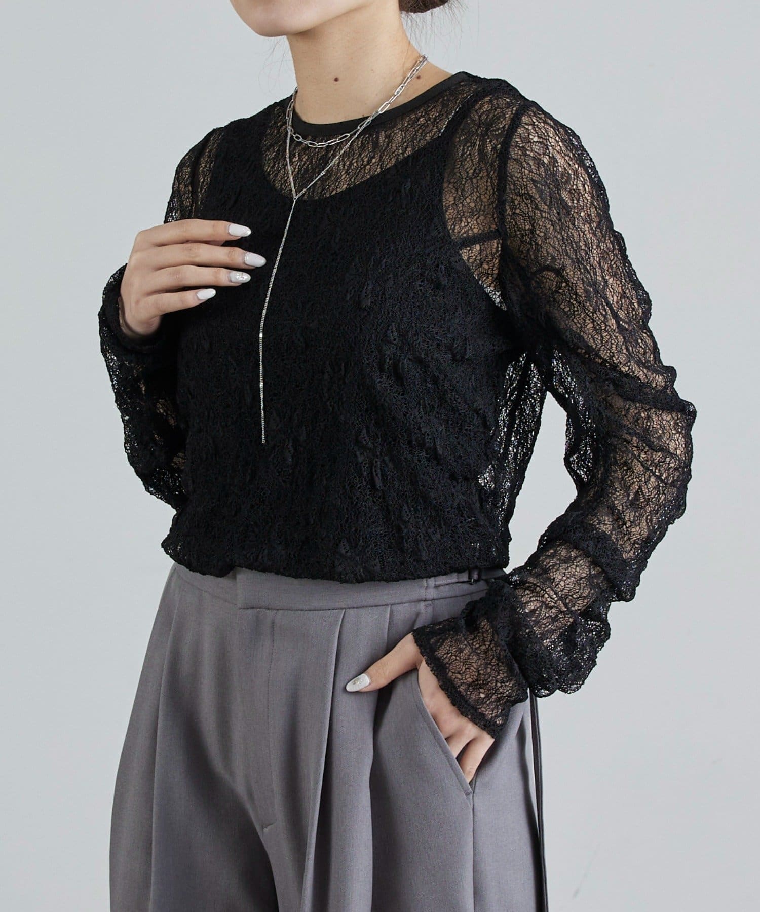 レースならではの透け感と柄が、女性らしく華やかな印象を演出。