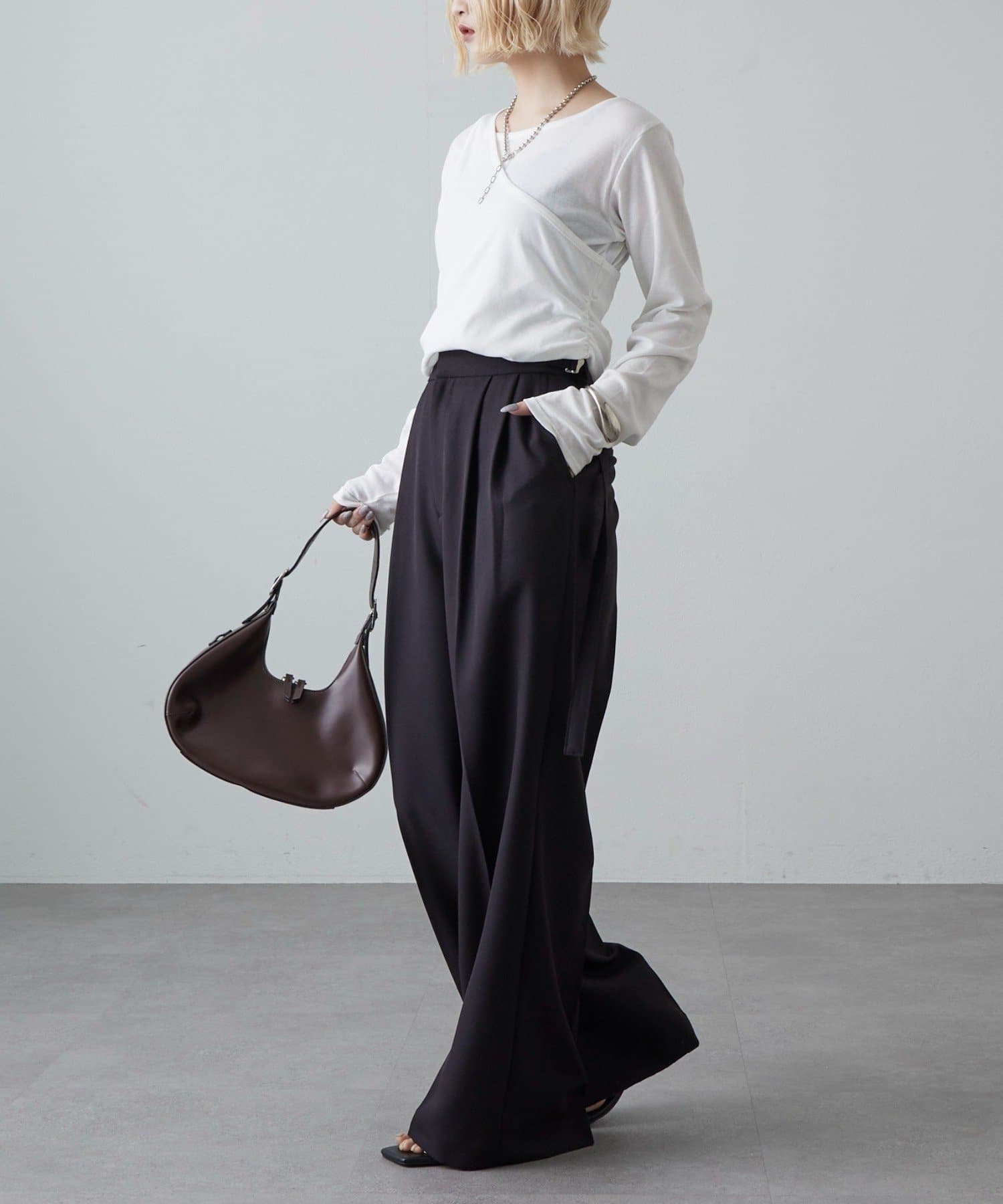 凛とした芯のある女性。 自立した、女性のワードローブをイメージ。洗練されたかっこよさの中に、女性らしさ・かわいさ・セクシーさを持つ。自分自身のスタイル(自分らしさ・個性・生き方・感覚...)を表現できるひとつの手段としての服。肩肘張らない、心地よいリラックス感のあるスタイルを上質な素材、優雅なシルエットで提案。