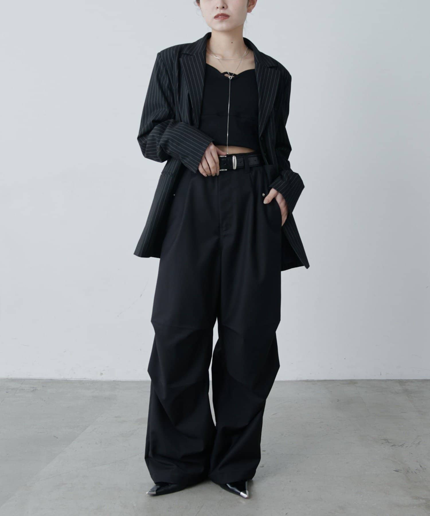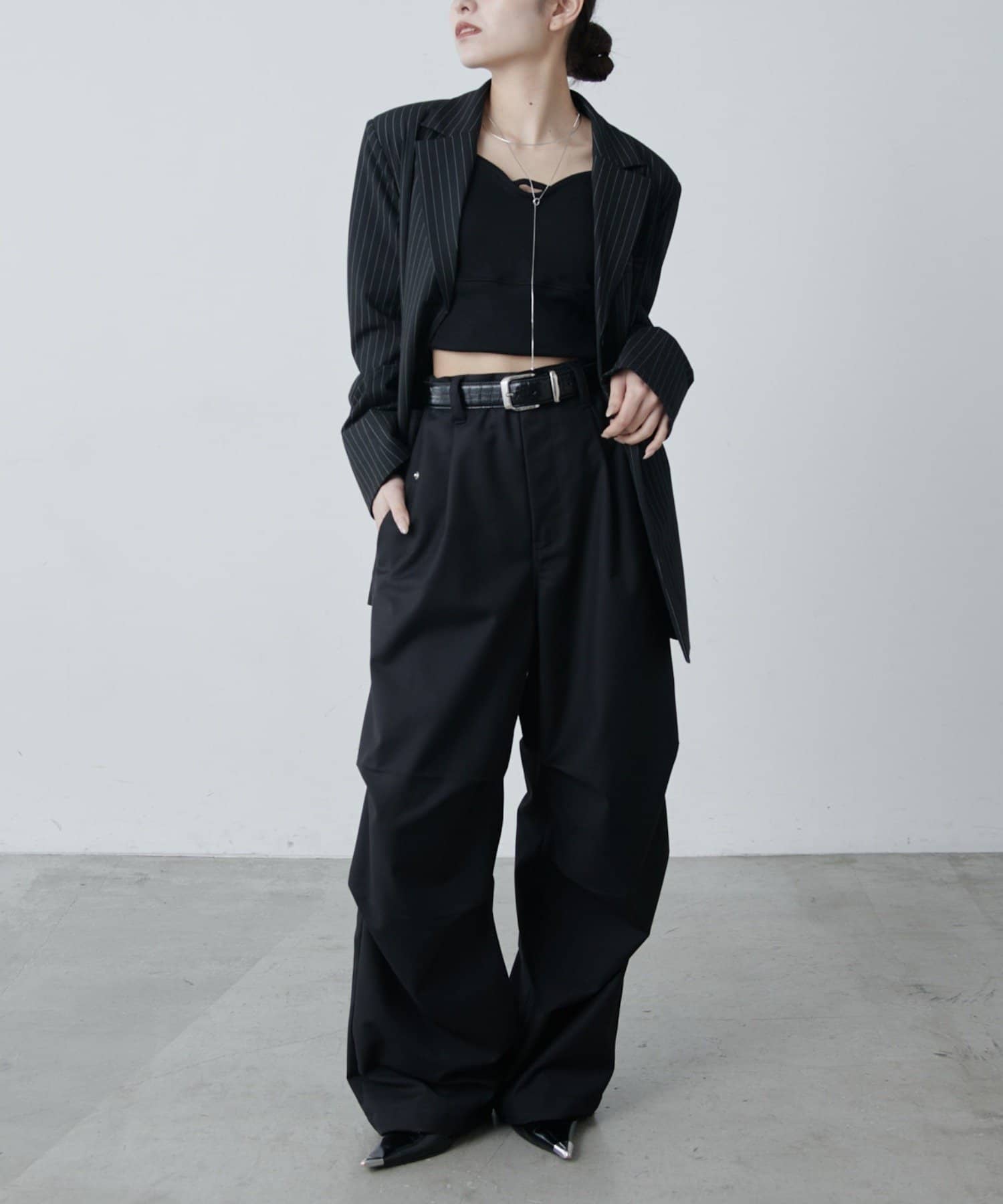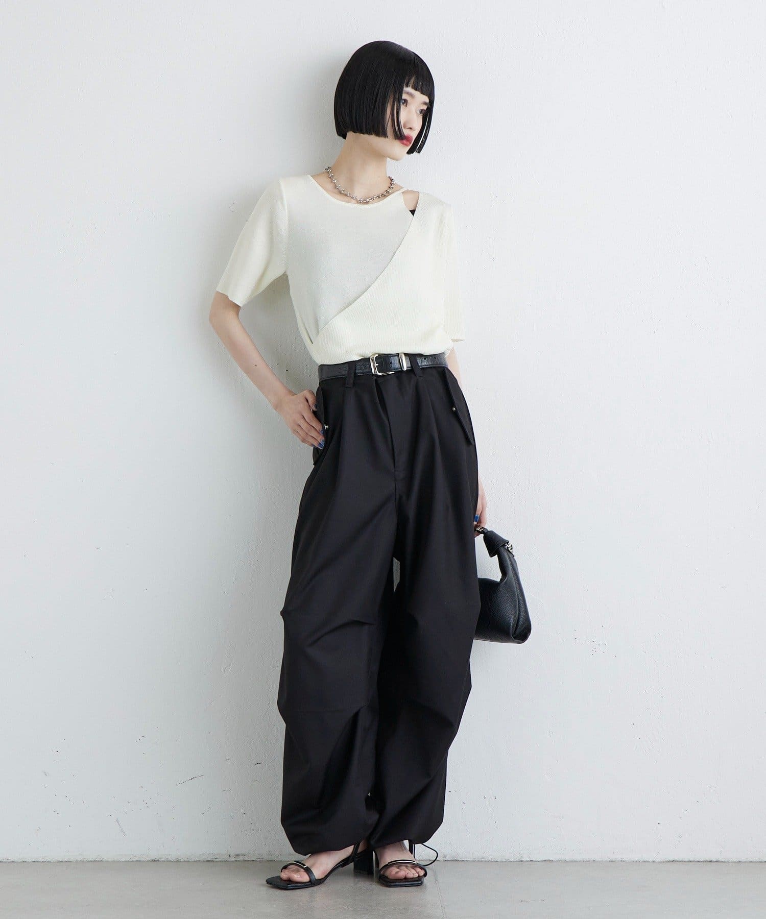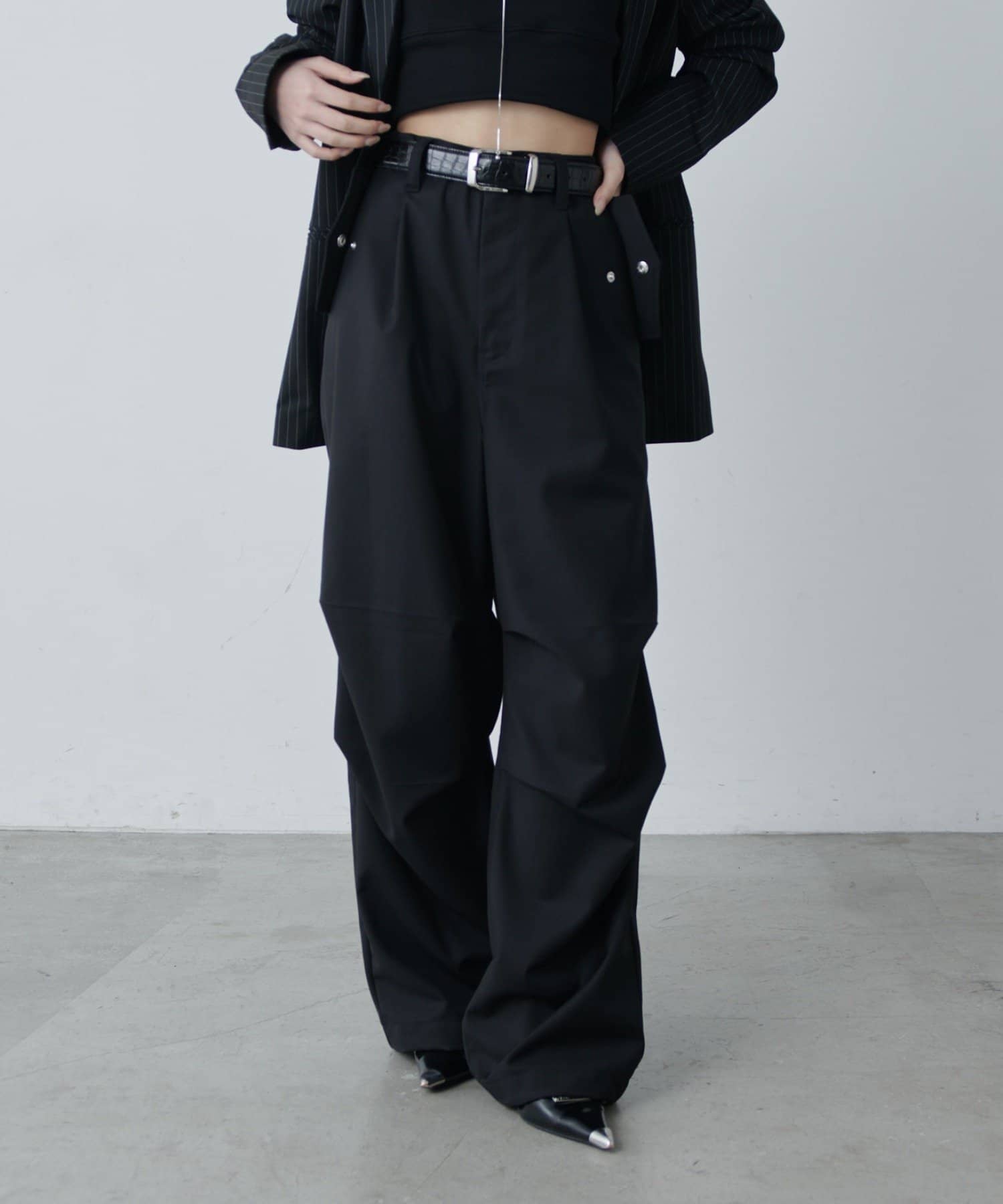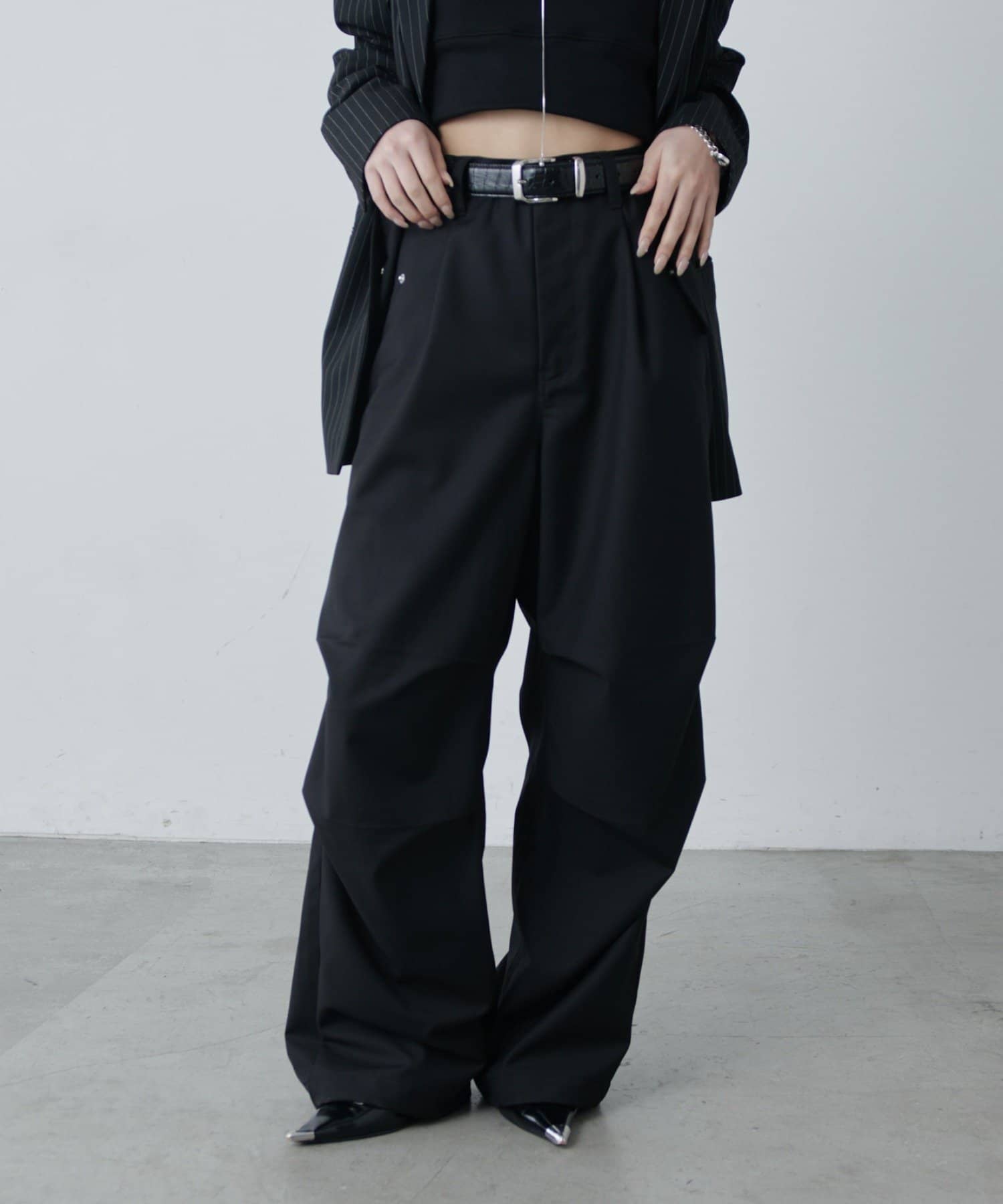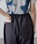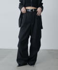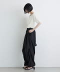 ・ウエストからストンと落ちるワイドシルエット。膝にはタックを施して立体的な見え方に。