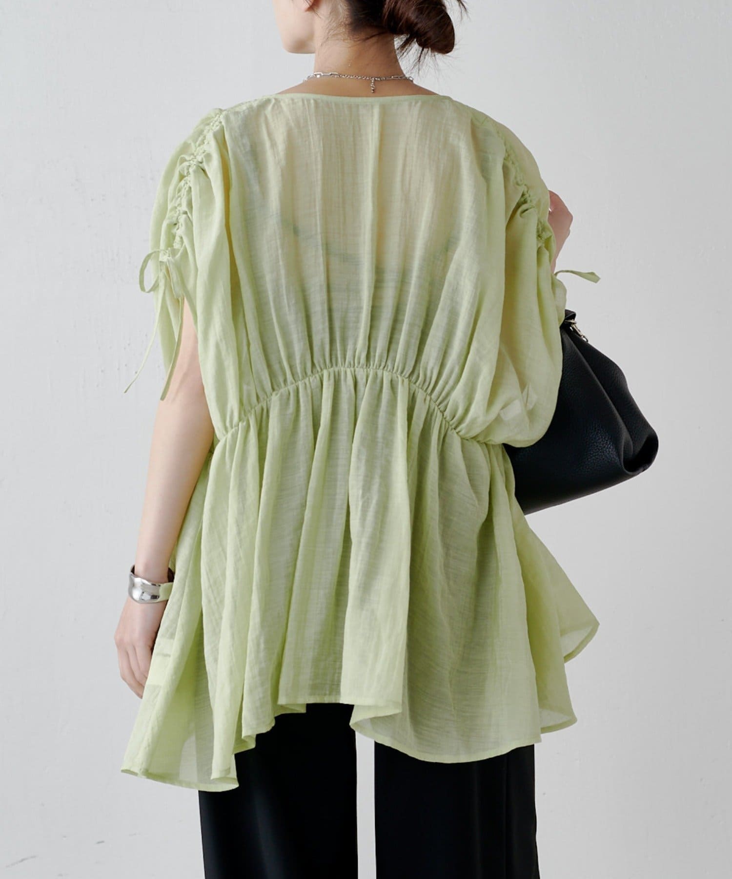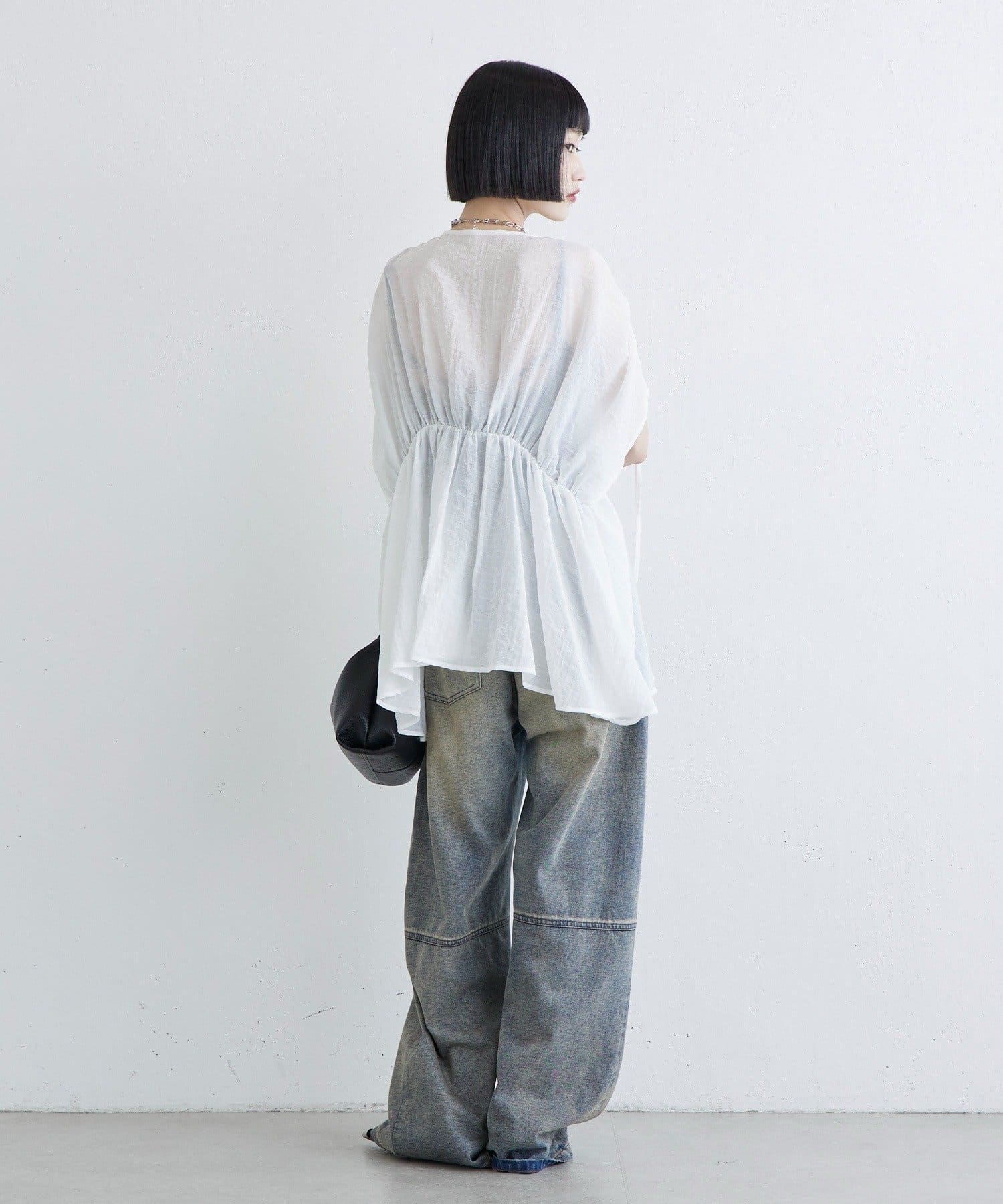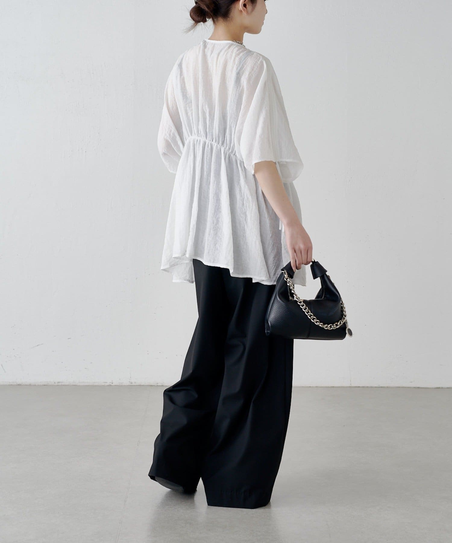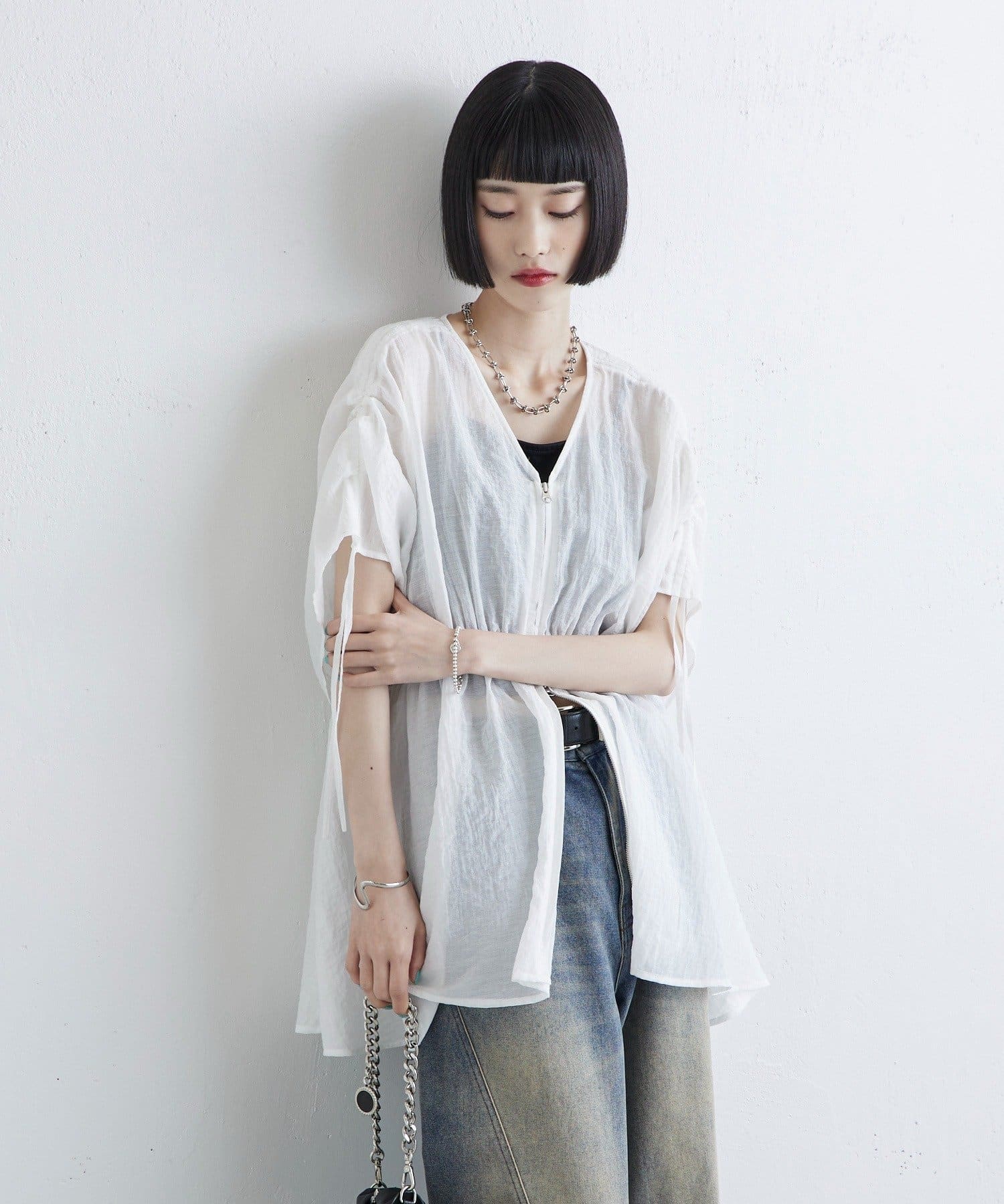 ほどよい透け感が女性らしい印象。さらっと肌あたりの良いシアー素材。軽くて柔らかいいので着心地も◎