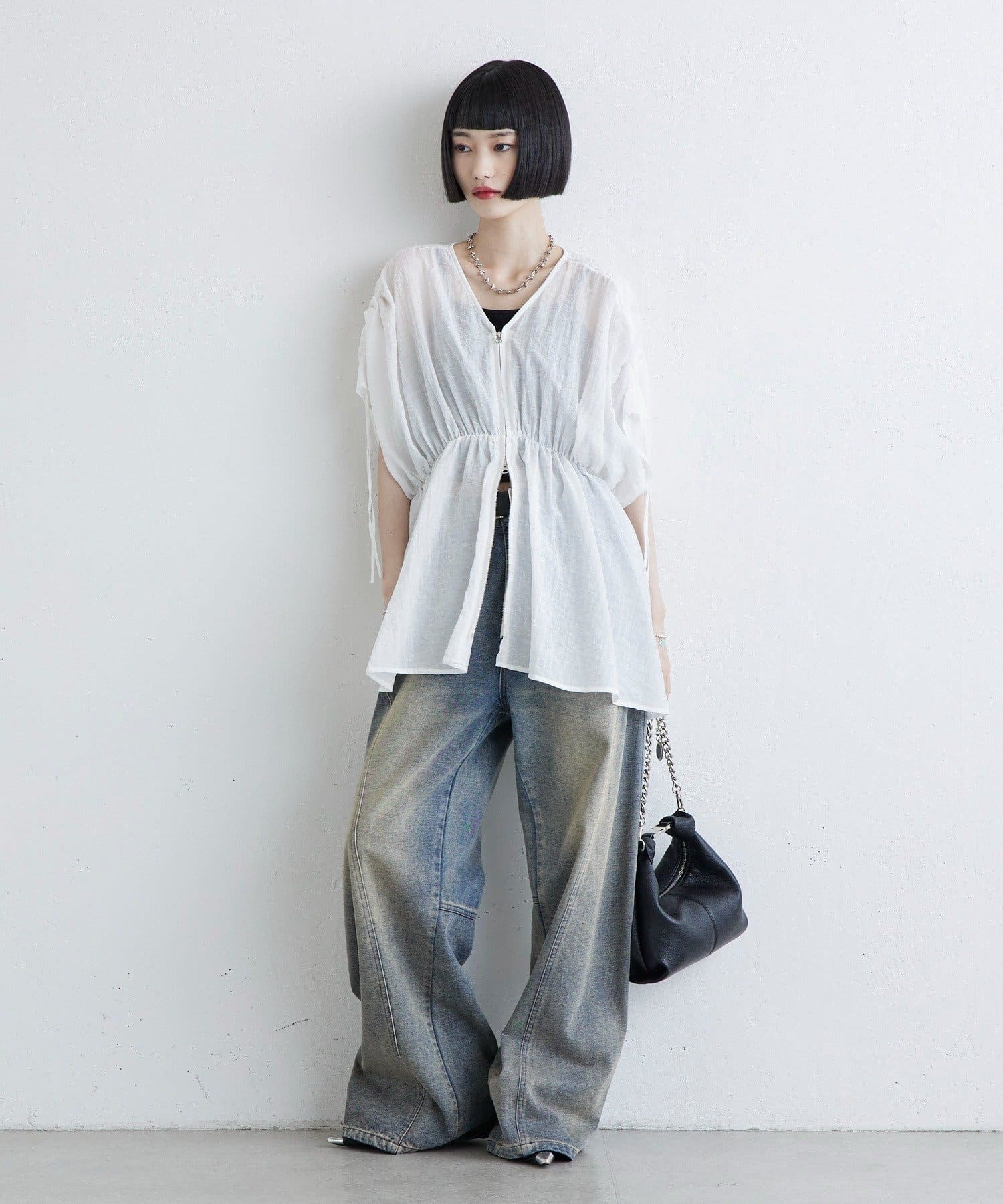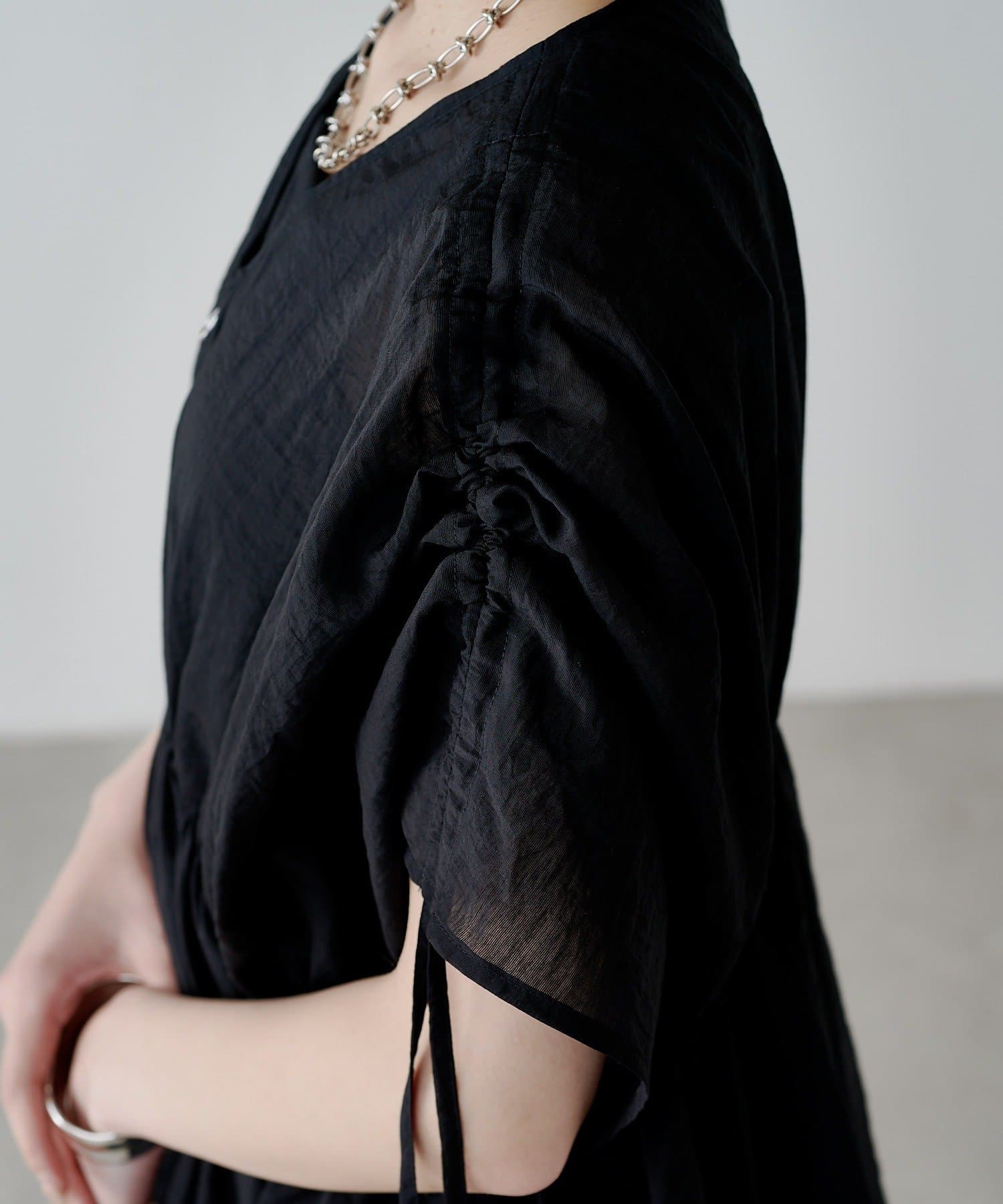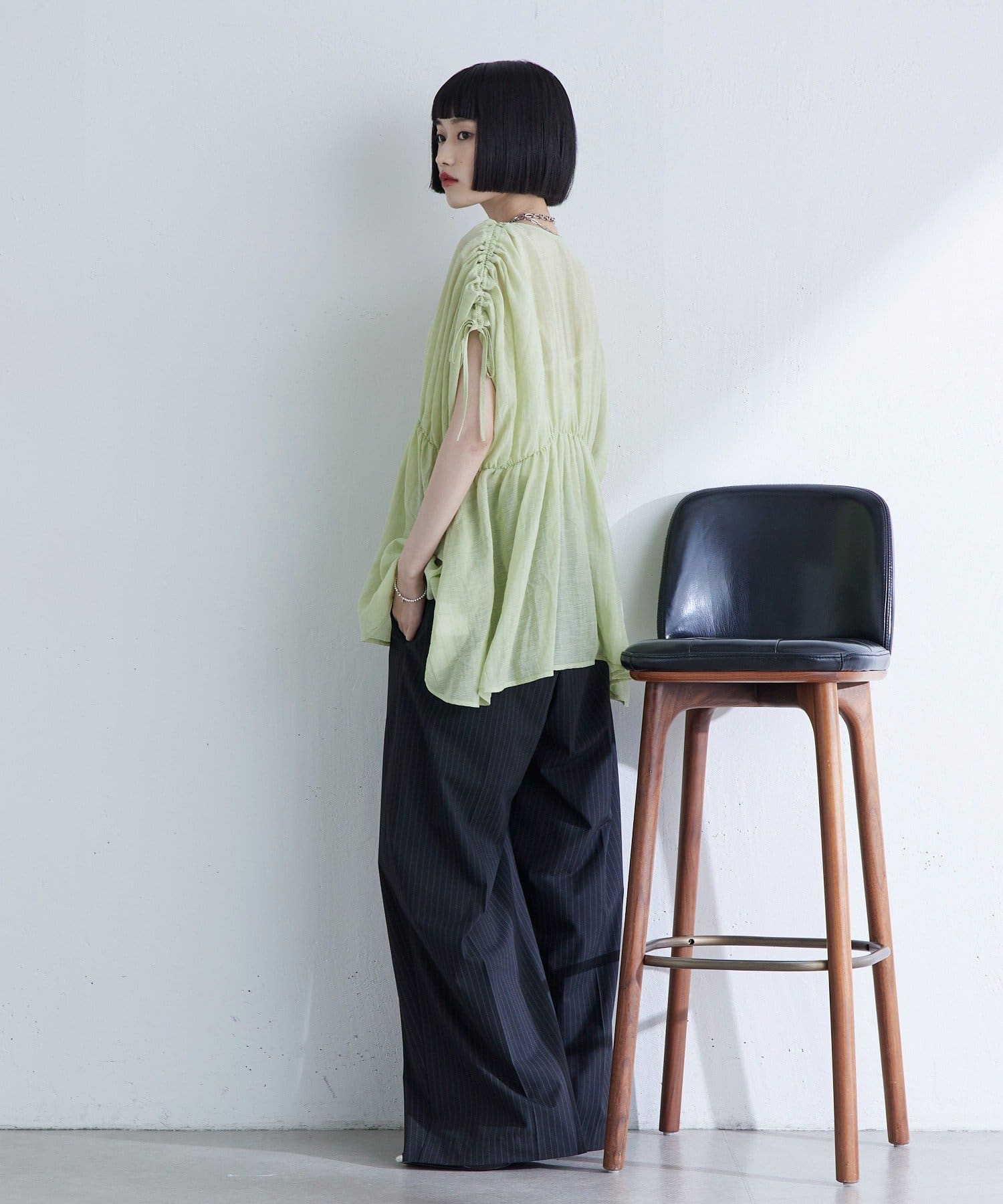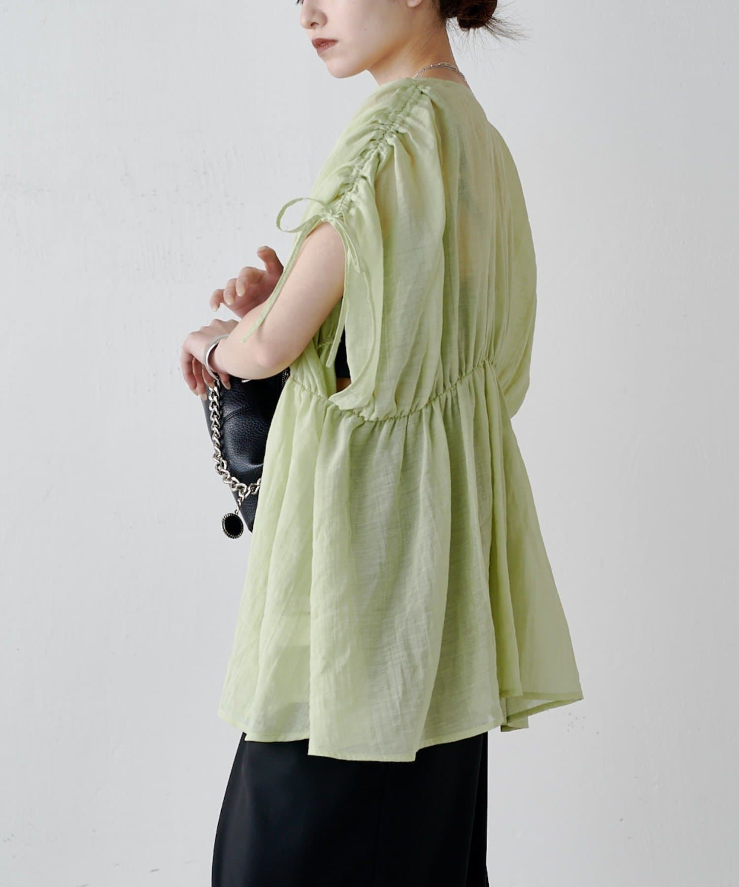 ほどよい透け感が女性らしい印象。さらっと肌あたりの良いシアー素材。軽くて柔らかいいので着心地も◎