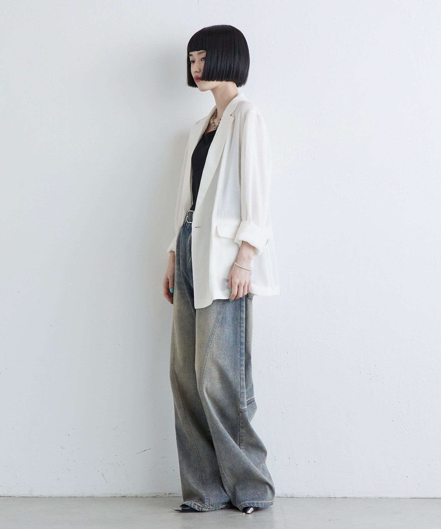 シンプルなインナーに合わせるとキレイ目コーデに。