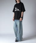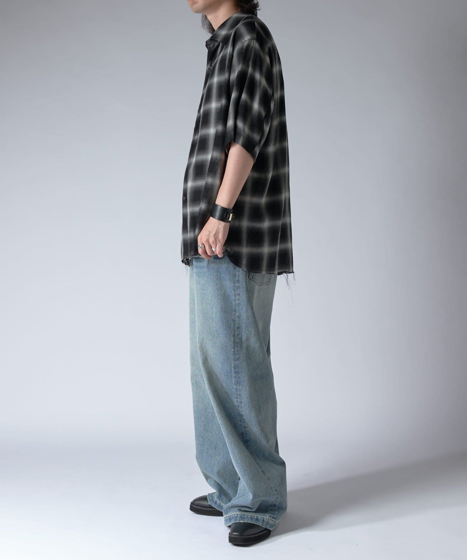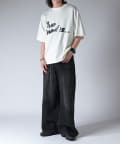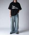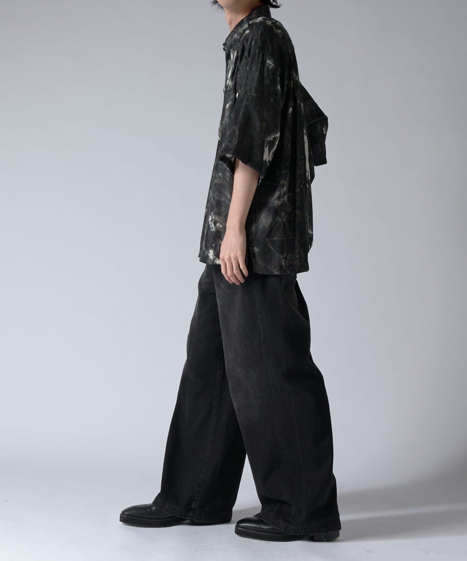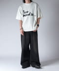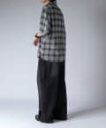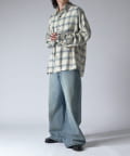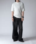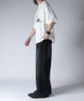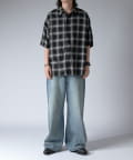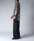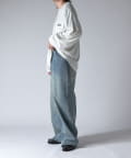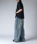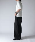 通常はゆったりとしたデニムを作る際には、膝下からややテーパードをかけており、ストレートシルエットに収まるように調整しますが、こちらのパンツは股上をより深めに取ることで、他にはないワイドシルエットを表現し、スラックスのワイドパンツのような見た目に仕上げました。
