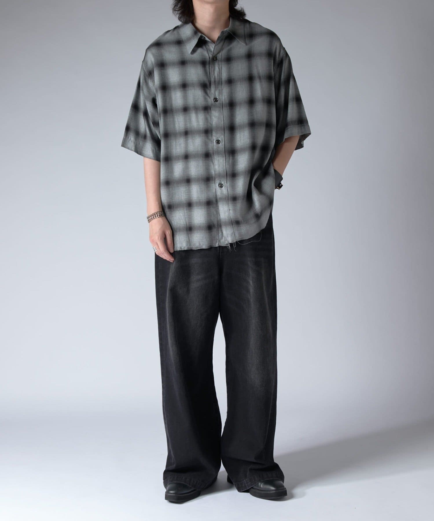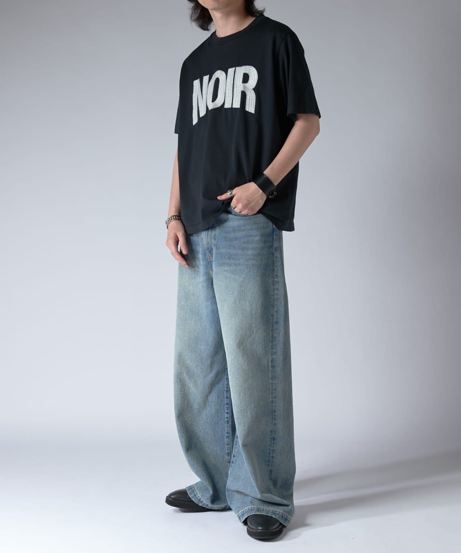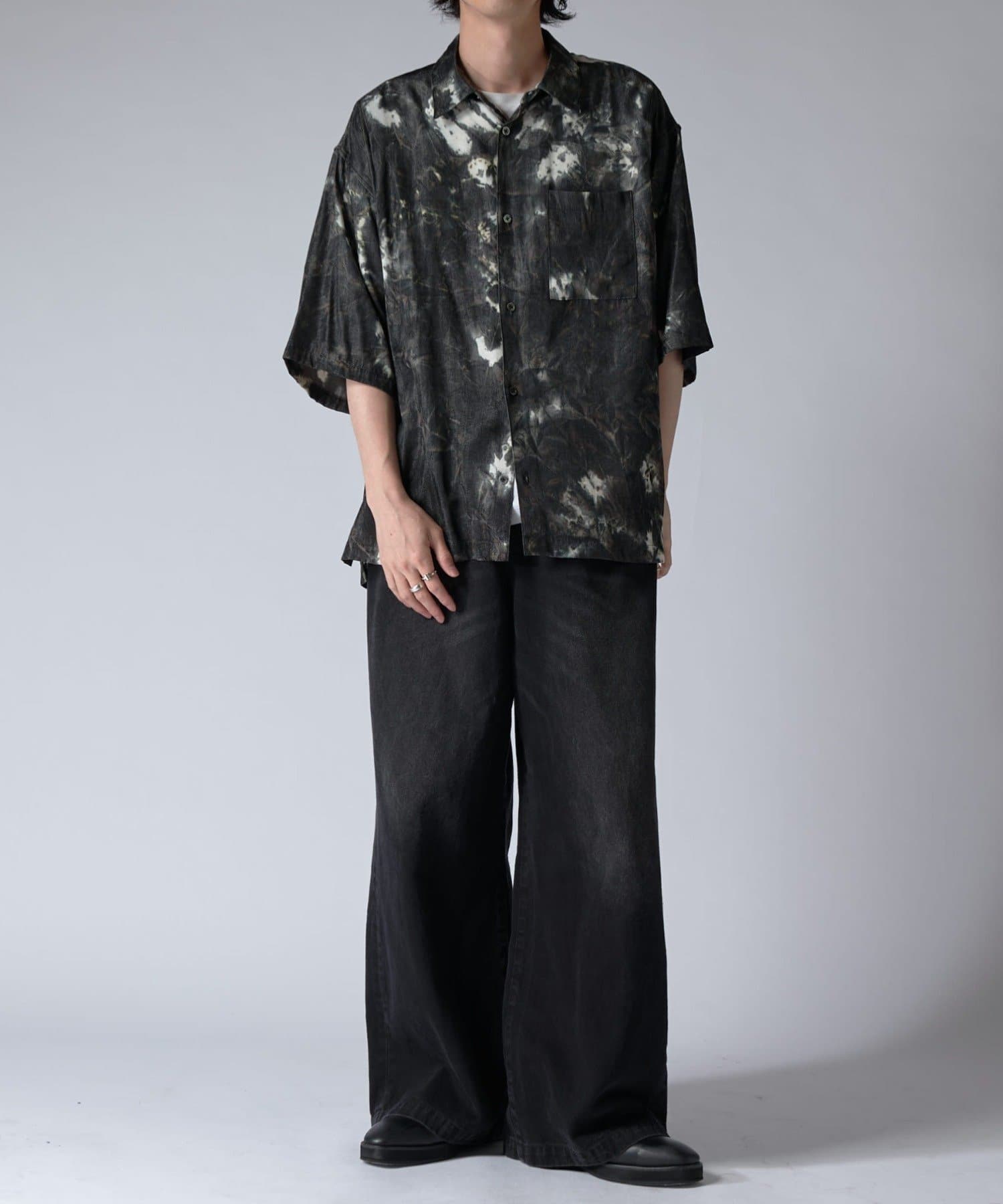通常はゆったりとしたデニムを作る際には、膝下からややテーパードをかけており、ストレートシルエットに収まるように調整しますが、こちらのパンツは股上をより深めに取ることで、他にはないワイドシルエットを表現し、スラックスのワイドパンツのような見た目に仕上げました。