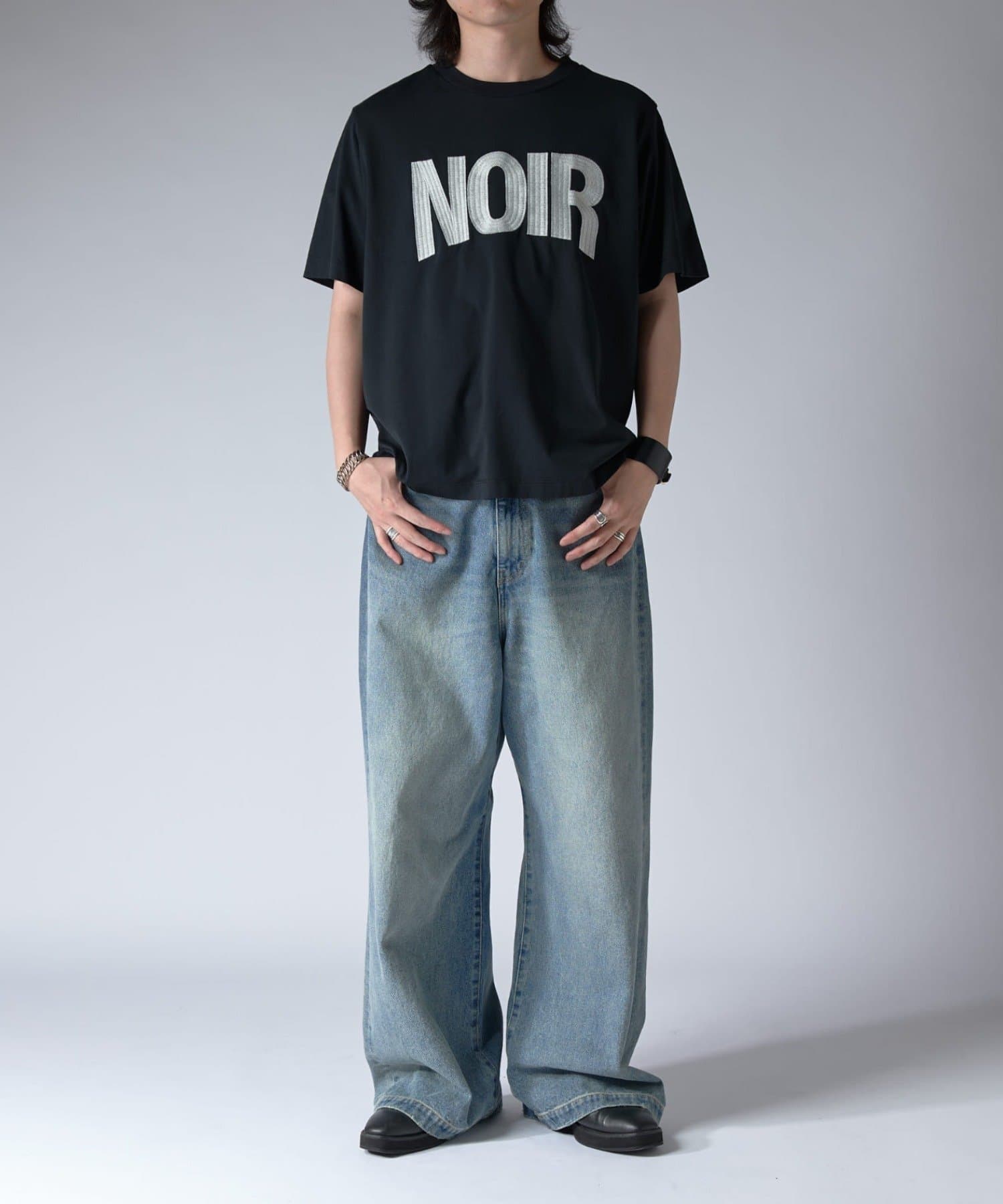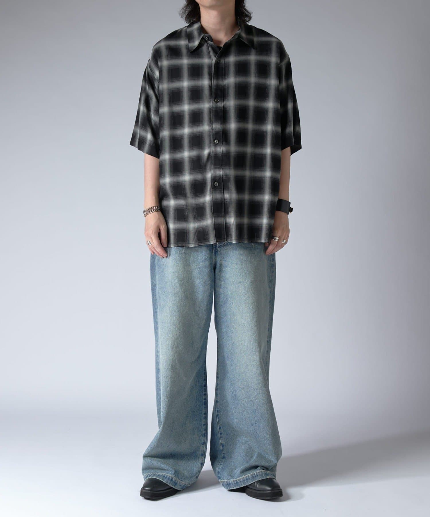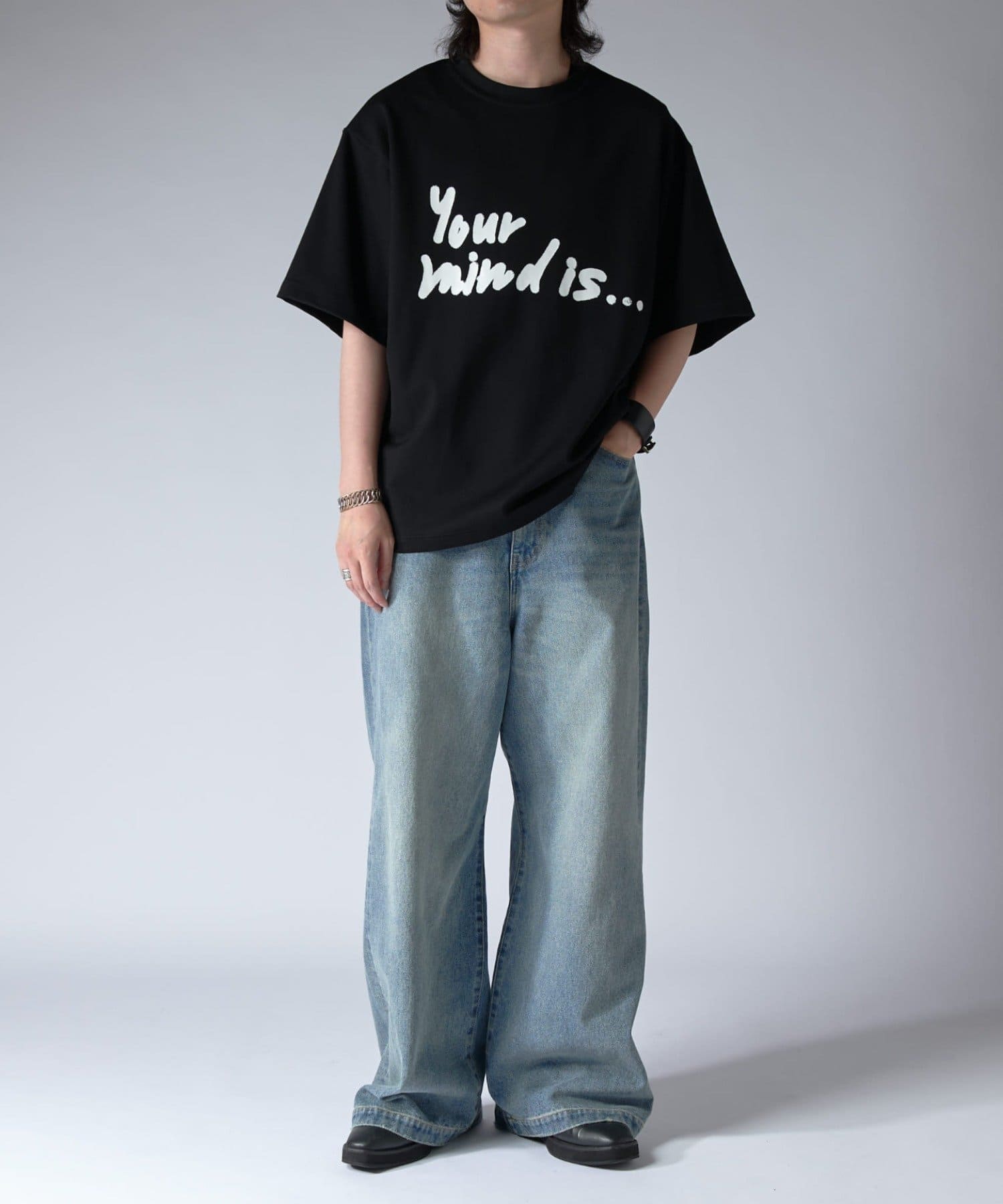 ワイドシルエットのデニムジーンズ。