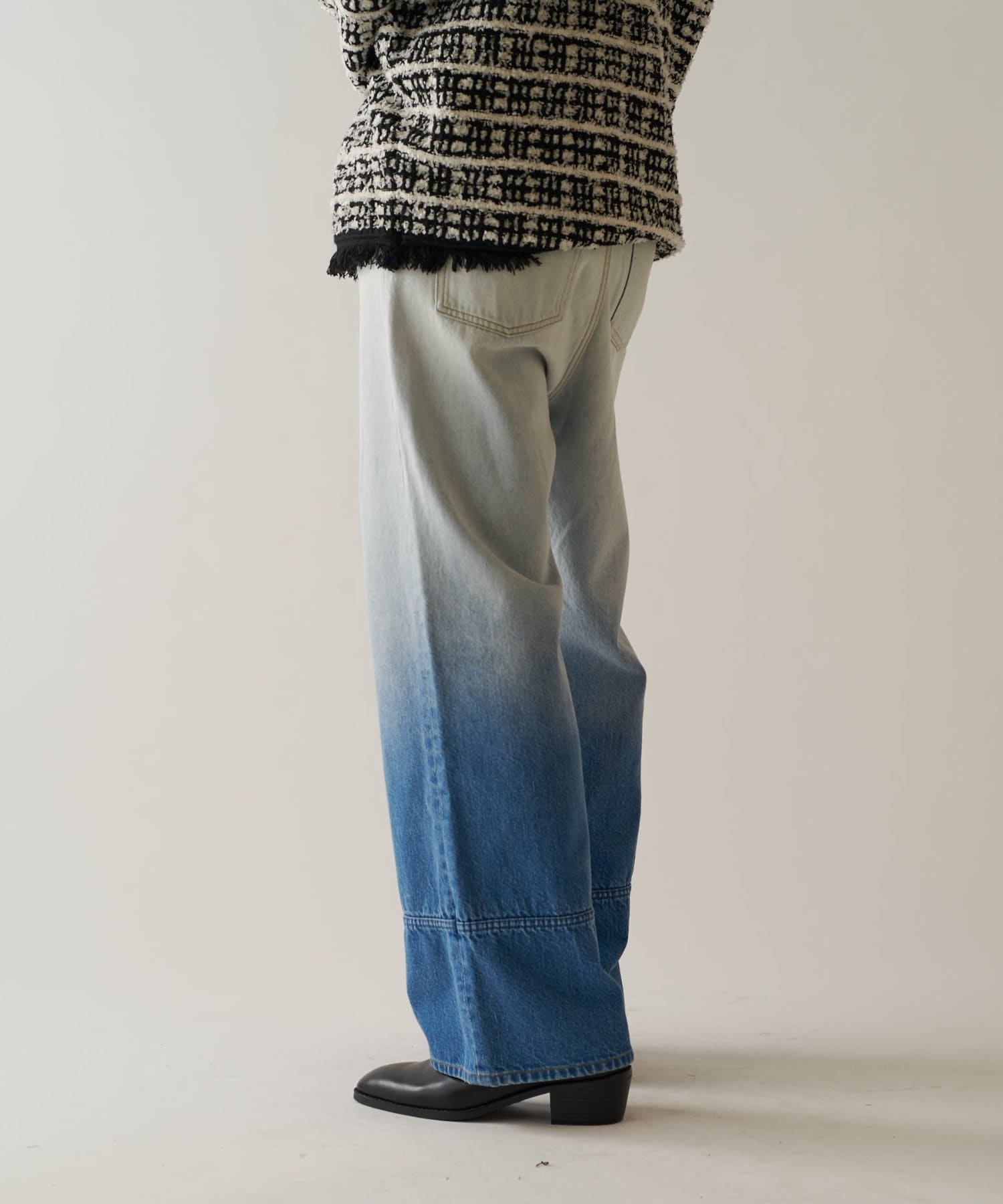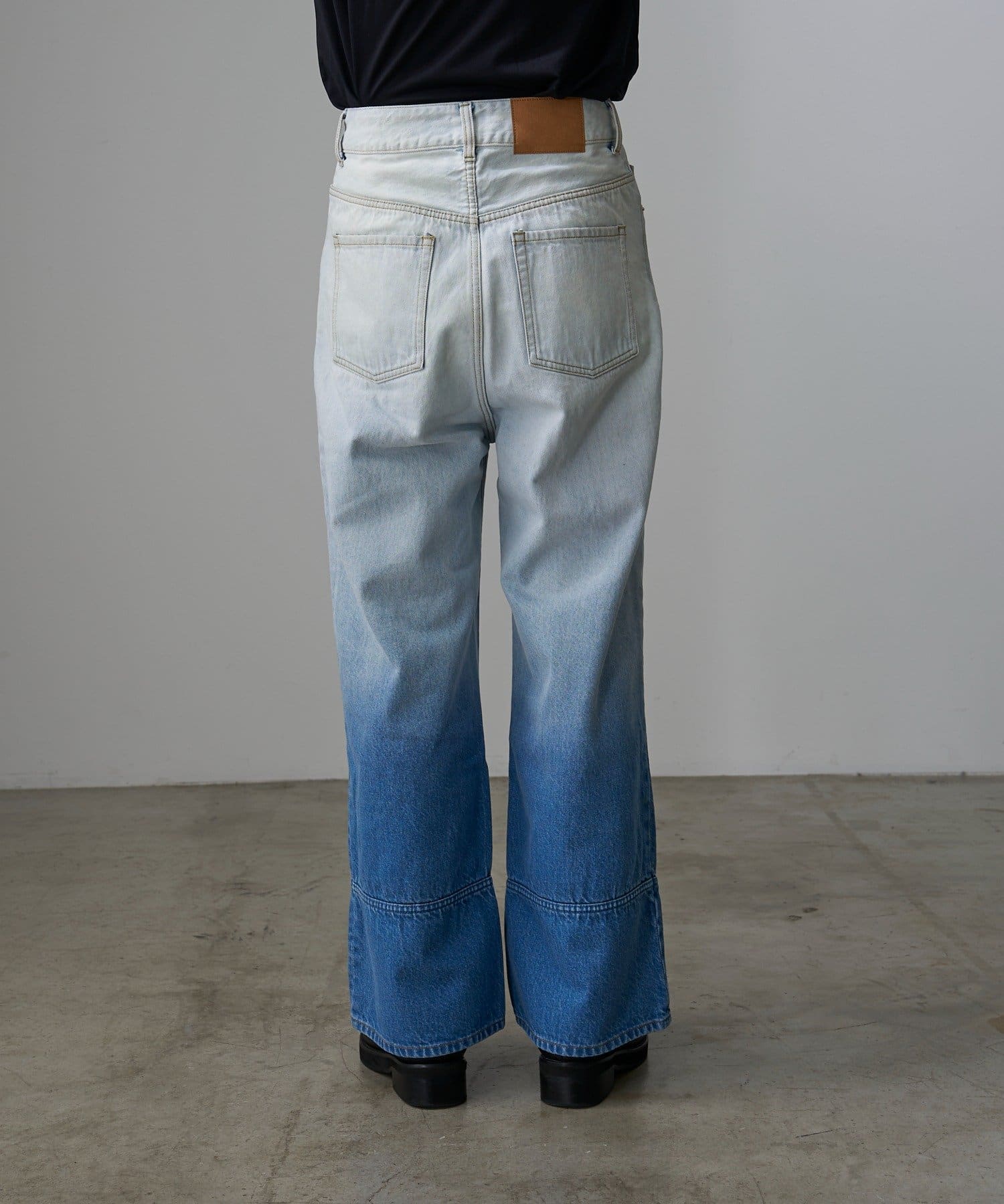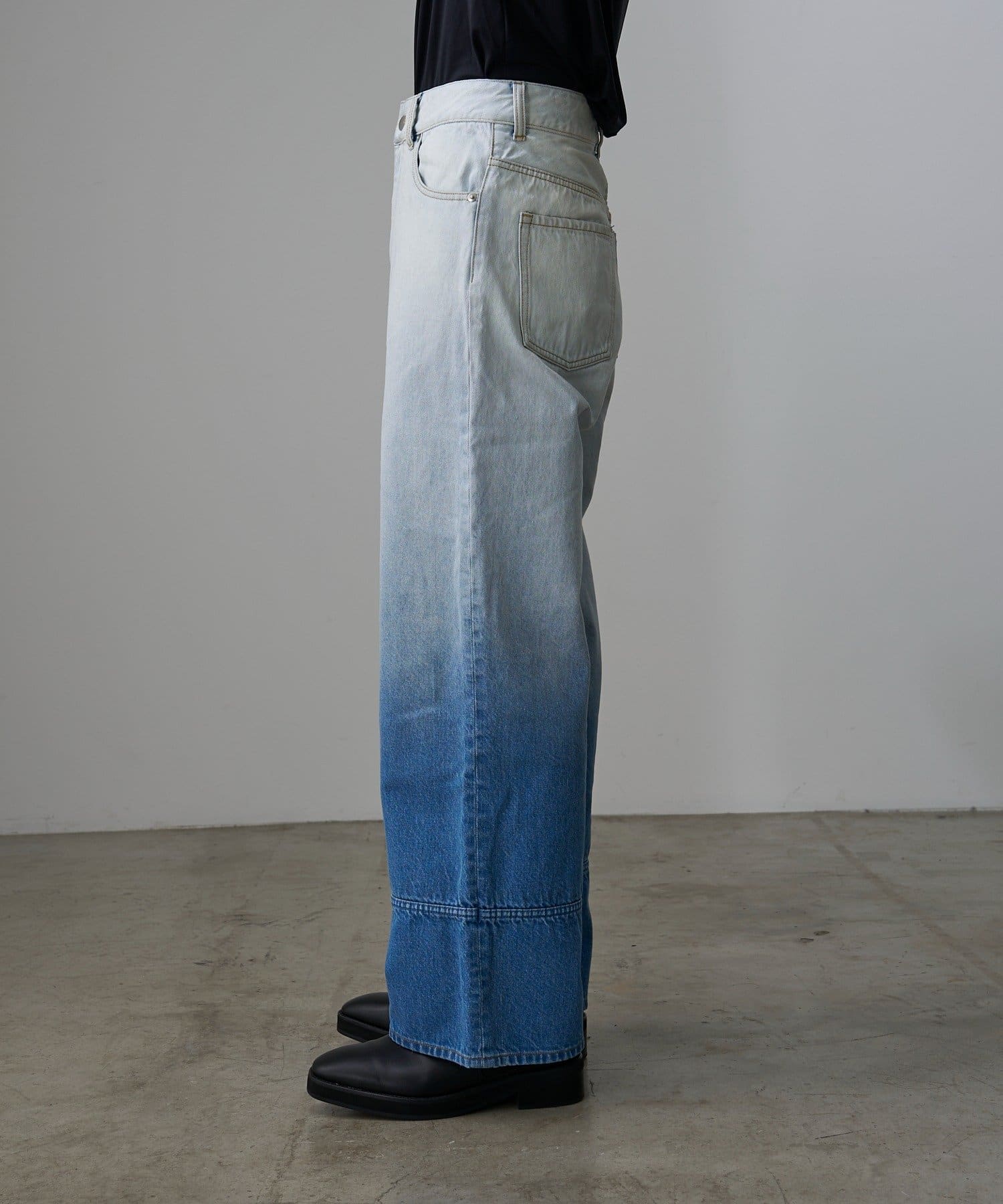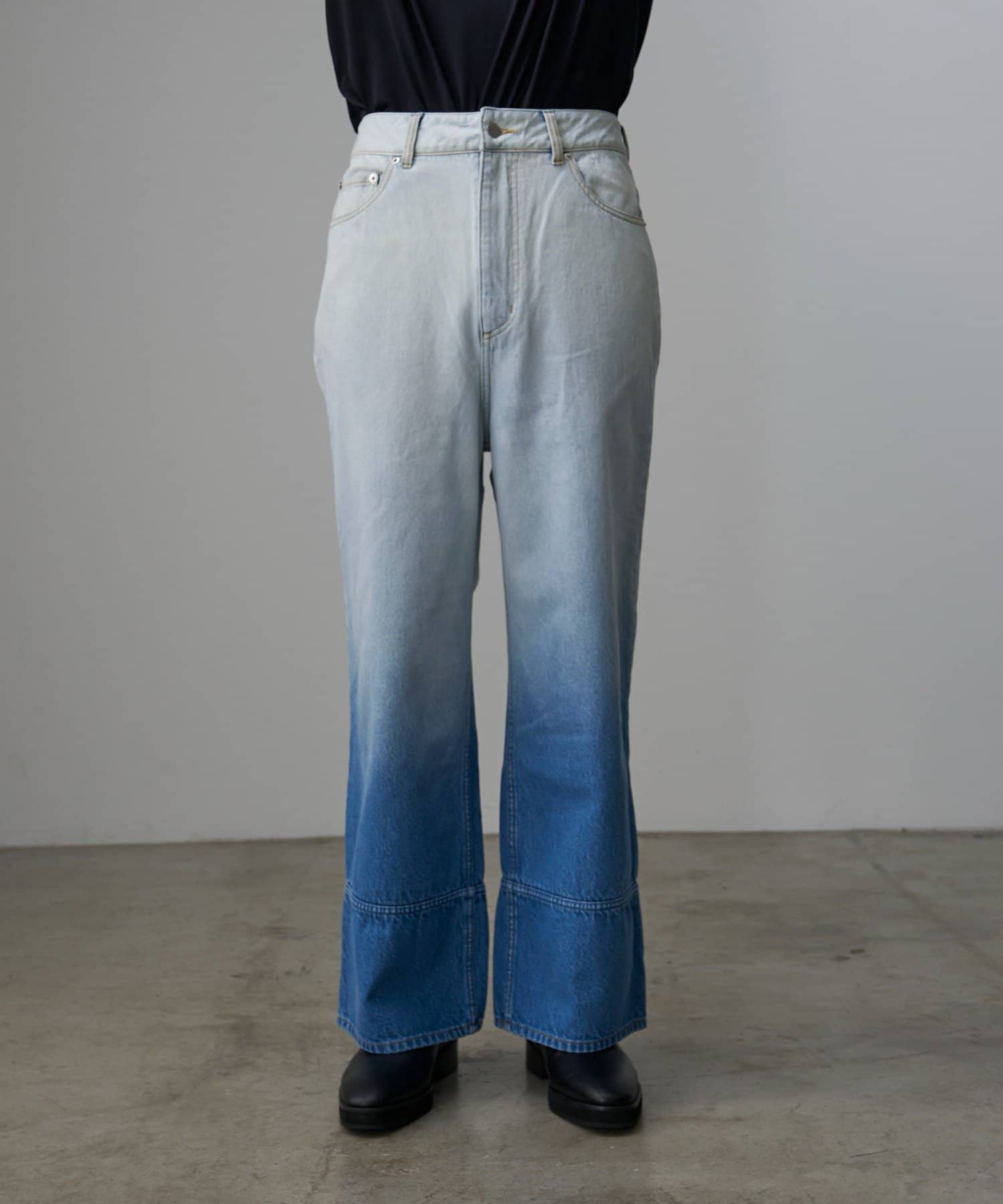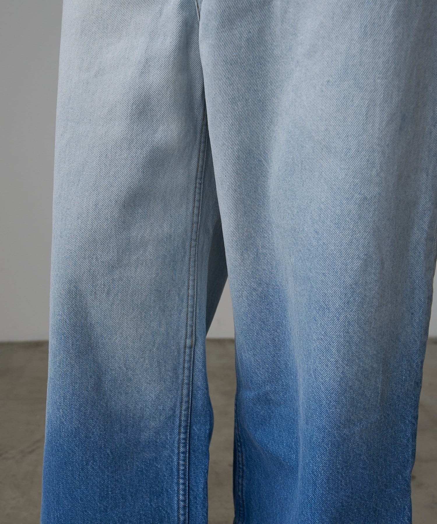 グラデーションのデザインがポイントのこちらのデニムパンツ。シルエットは、ウエストから裾にかけて、ストンと落ちたワイドストレートシルエット。ウエスト部から裾にかけて濃度が濃くなるグラデーションのカラーリングがポイント。裾に濃い色をもってくることによって、スタイルがキレイに見える様になっております。