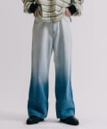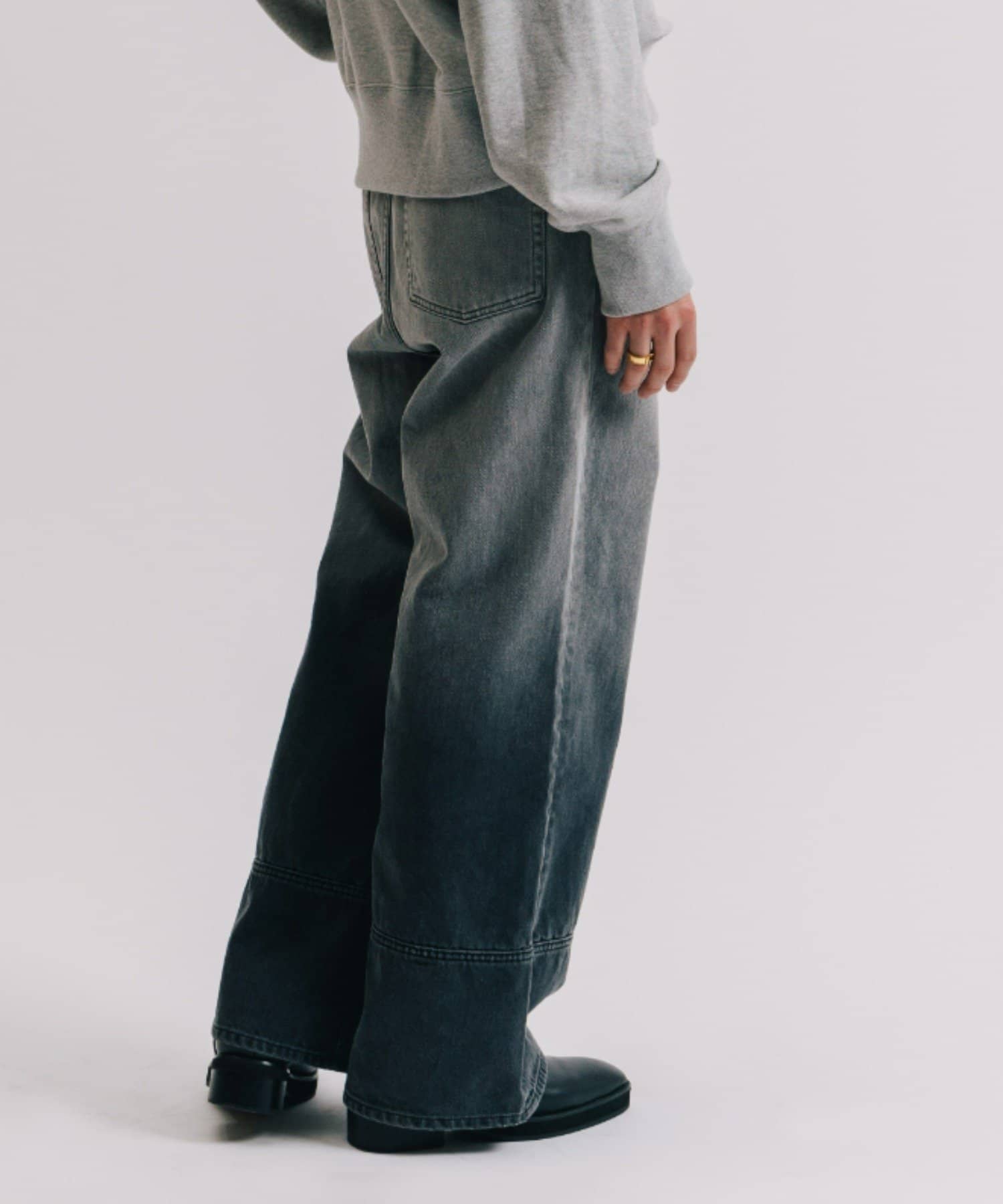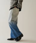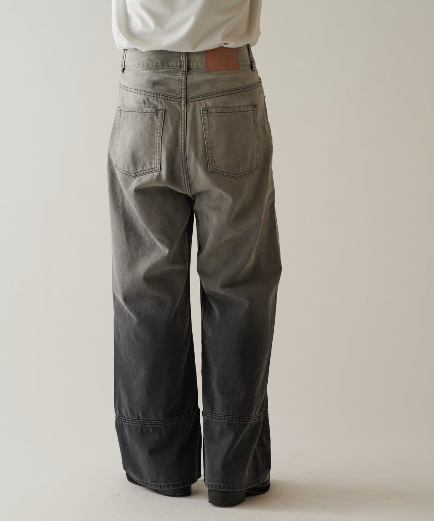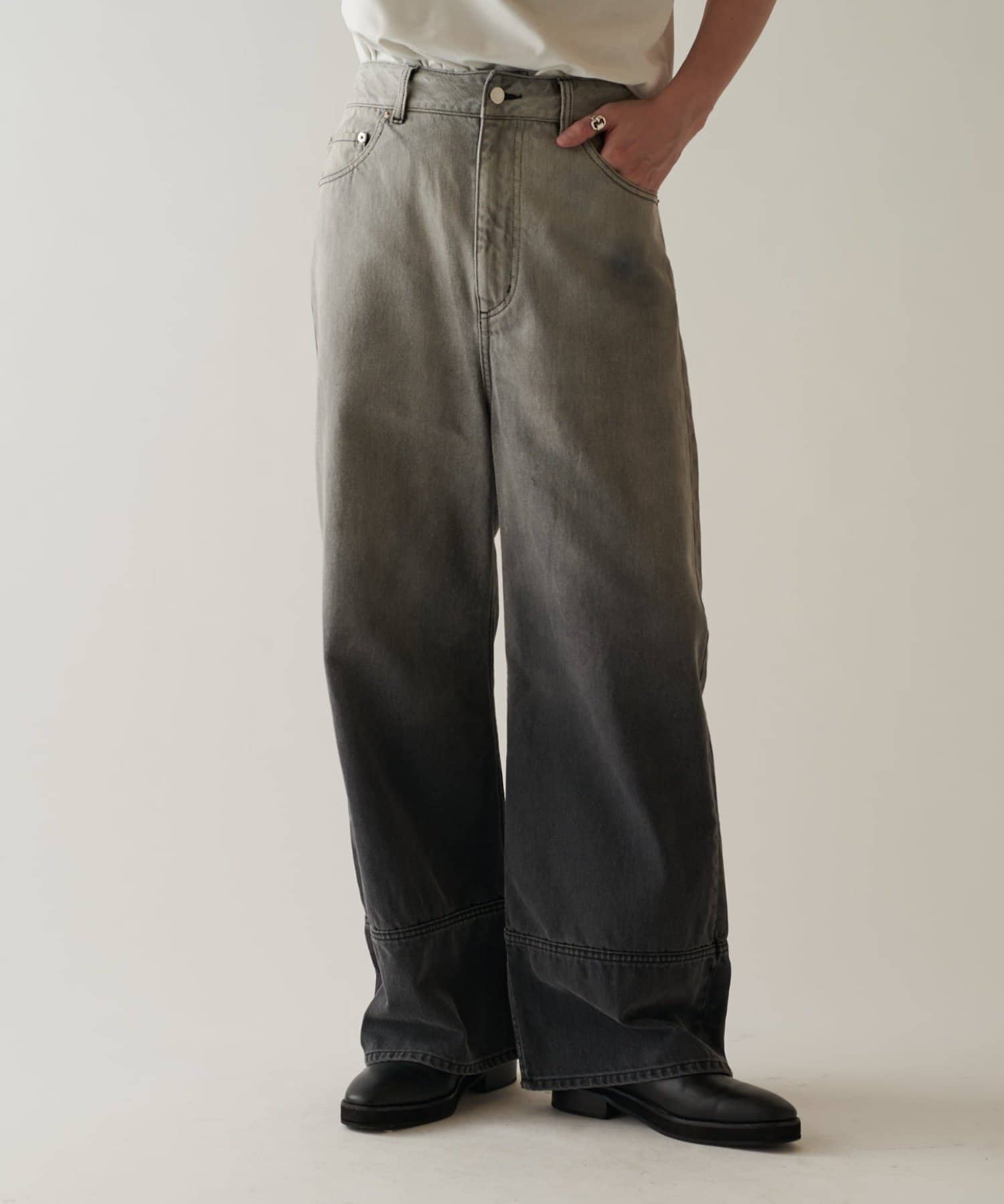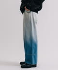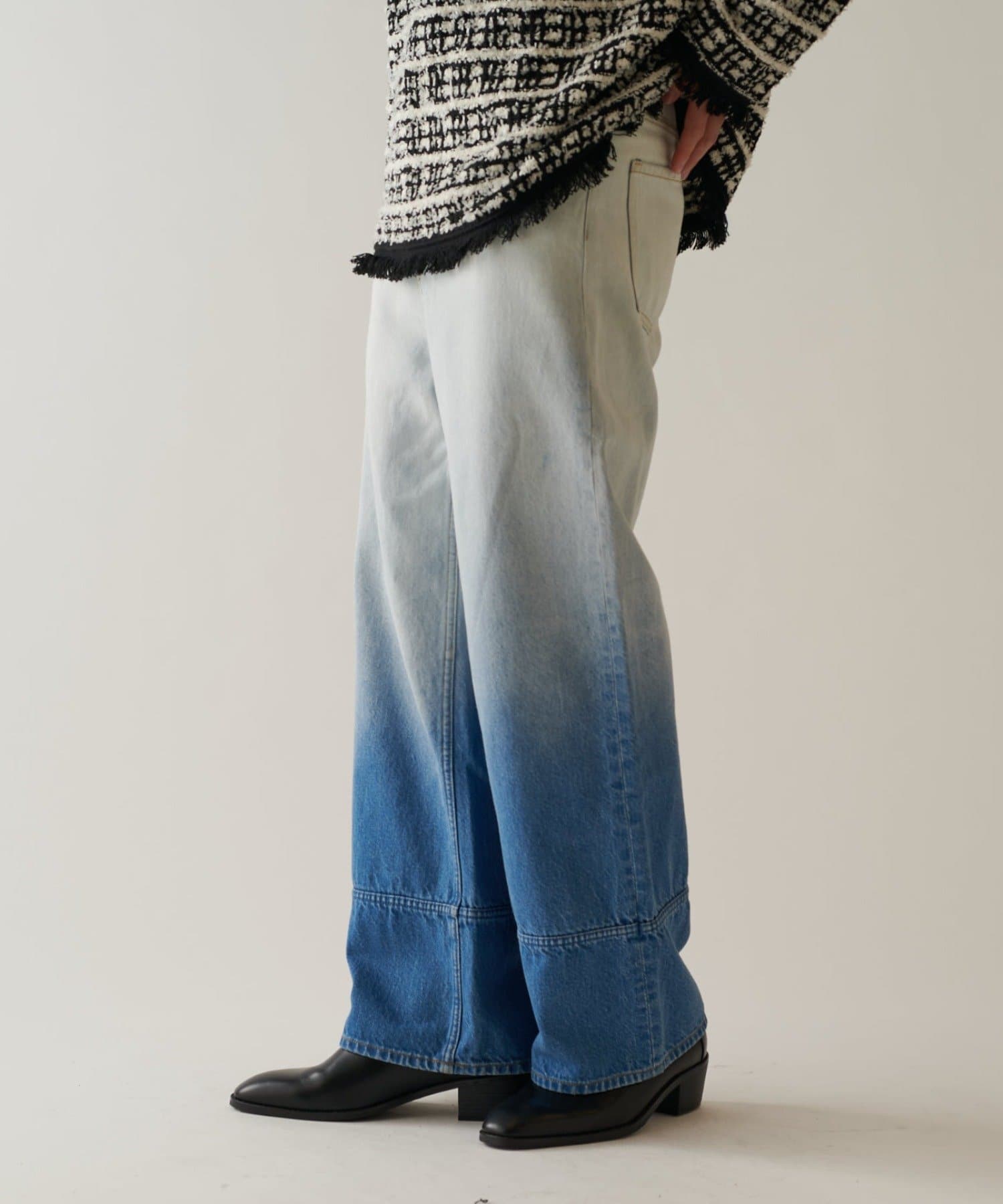 グラデーションのデザインがポイントのこちらのデニムパンツ。シルエットは、ウエストから裾にかけて、ストンと落ちたワイドストレートシルエット。ウエスト部から裾にかけて濃度が濃くなるグラデーションのカラーリングがポイント。裾に濃い色をもってくることによって、スタイルがキレイに見える様になっております。