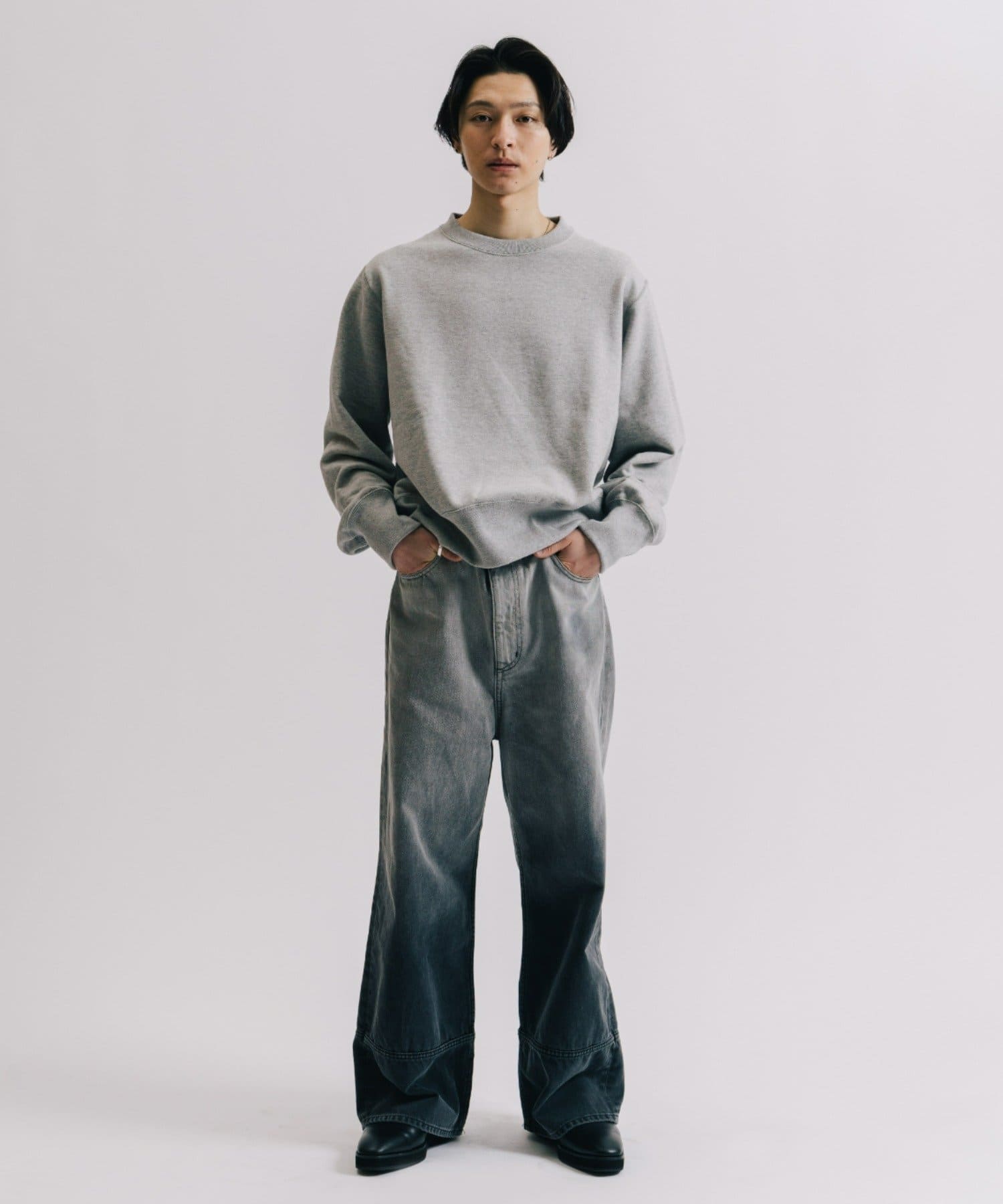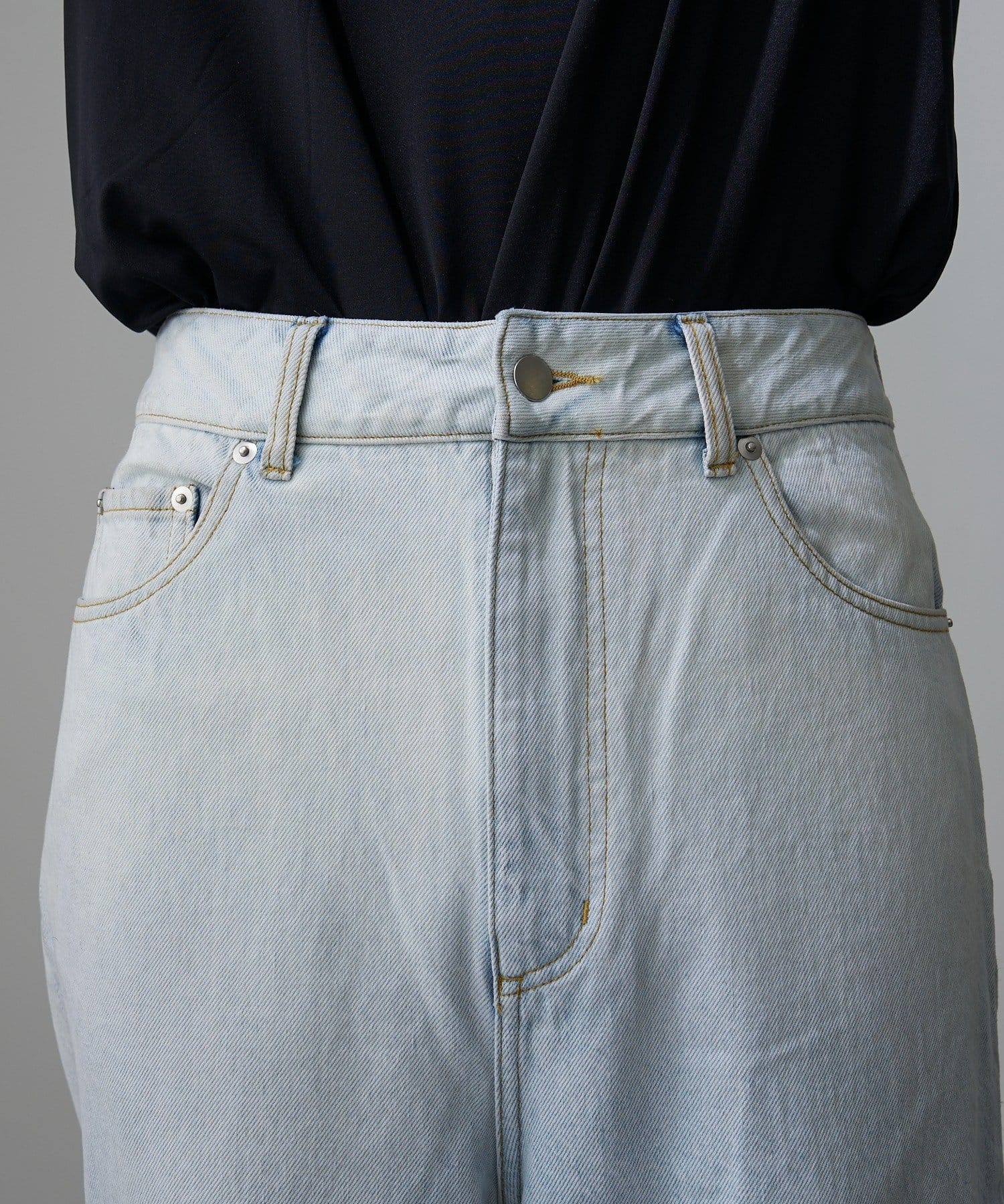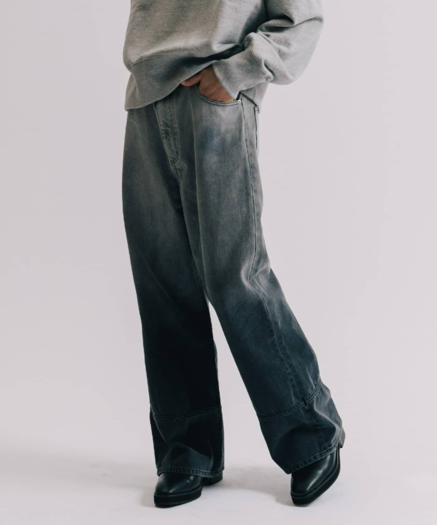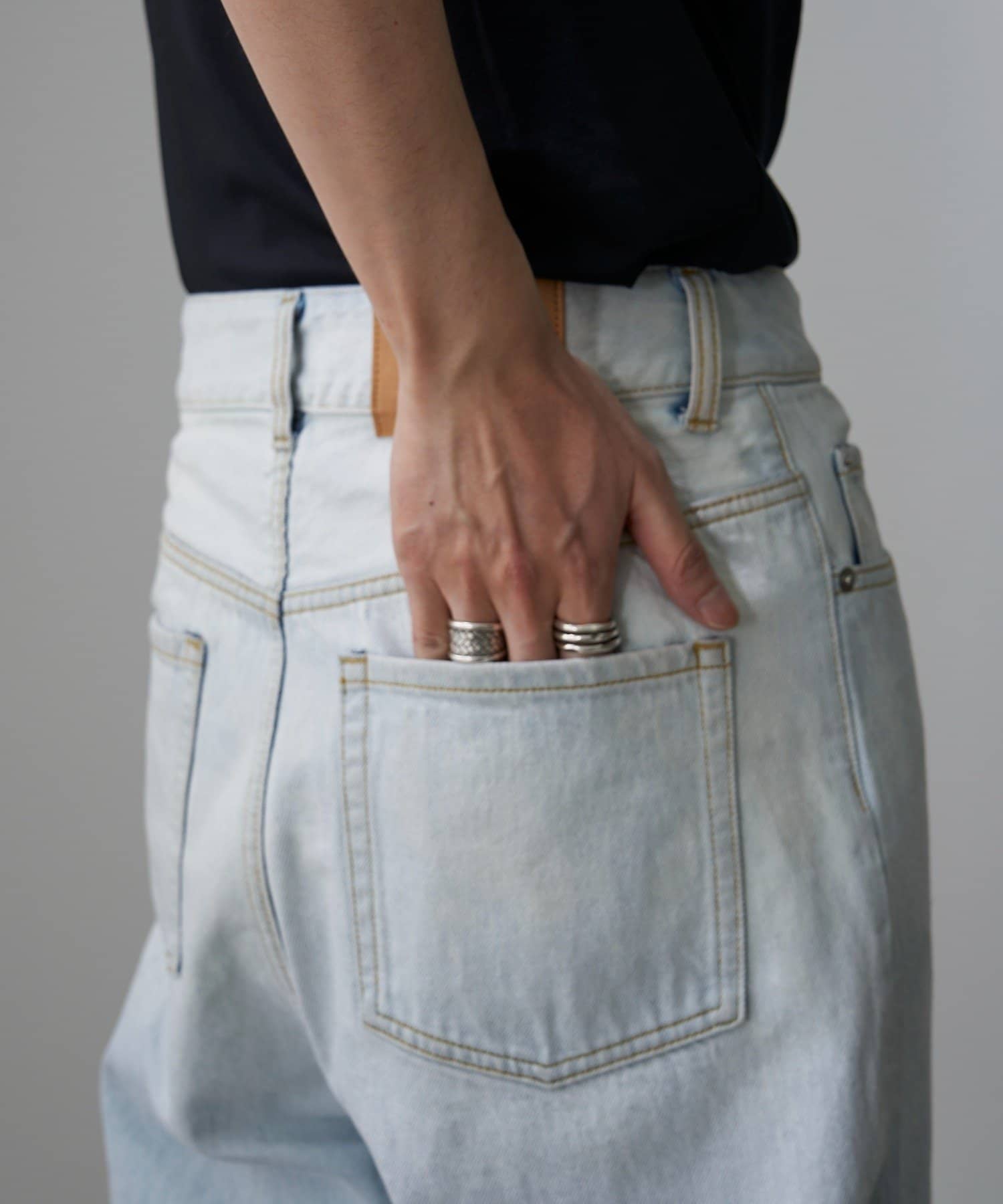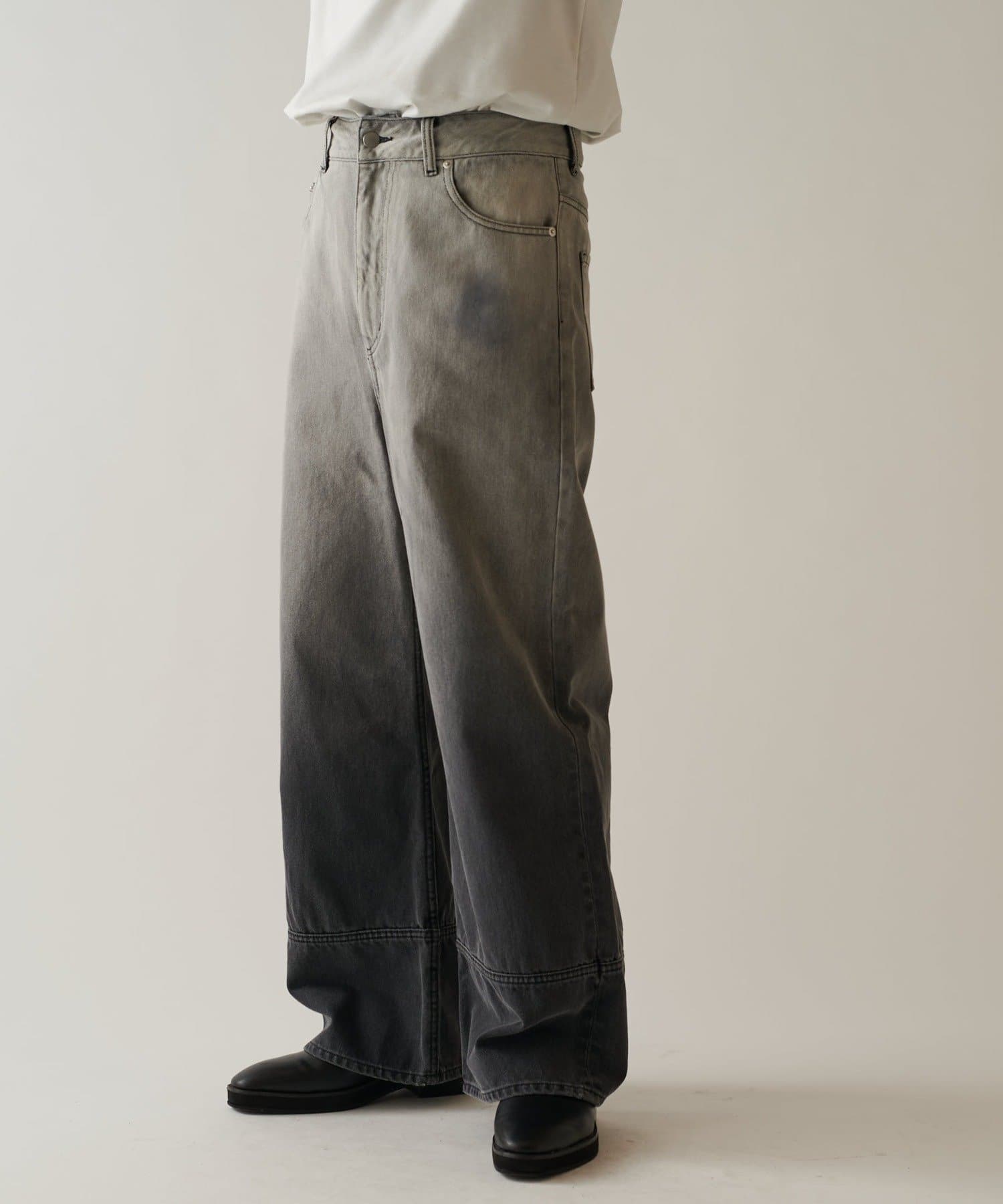 グラデーションのデザインがポイントのこちらのデニムパンツ。シルエットは、ウエストから裾にかけて、ストンと落ちたワイドストレートシルエット。ウエスト部から裾にかけて濃度が濃くなるグラデーションのカラーリングがポイント。裾に濃い色をもってくることによって、スタイルがキレイに見える様になっております。