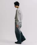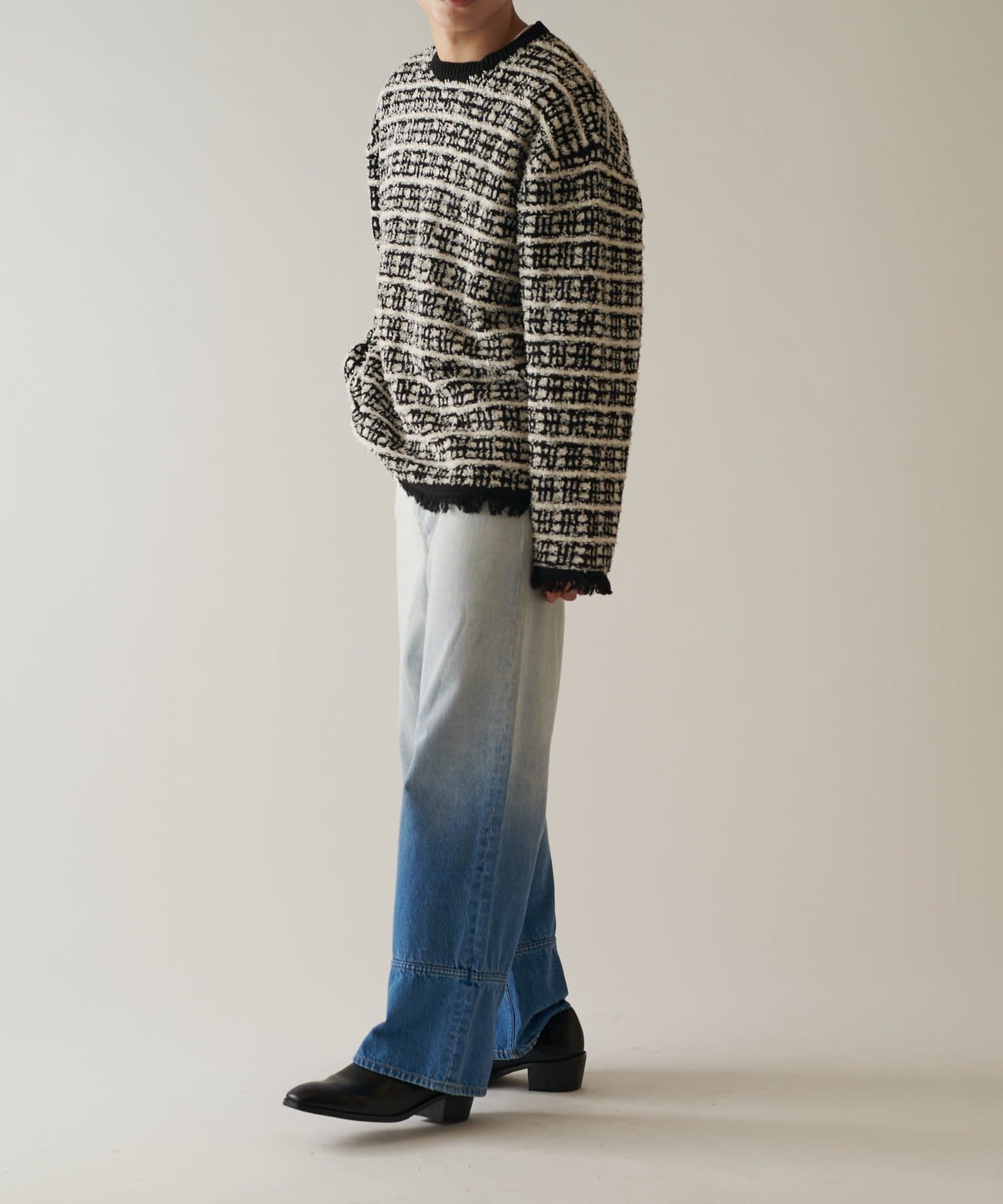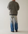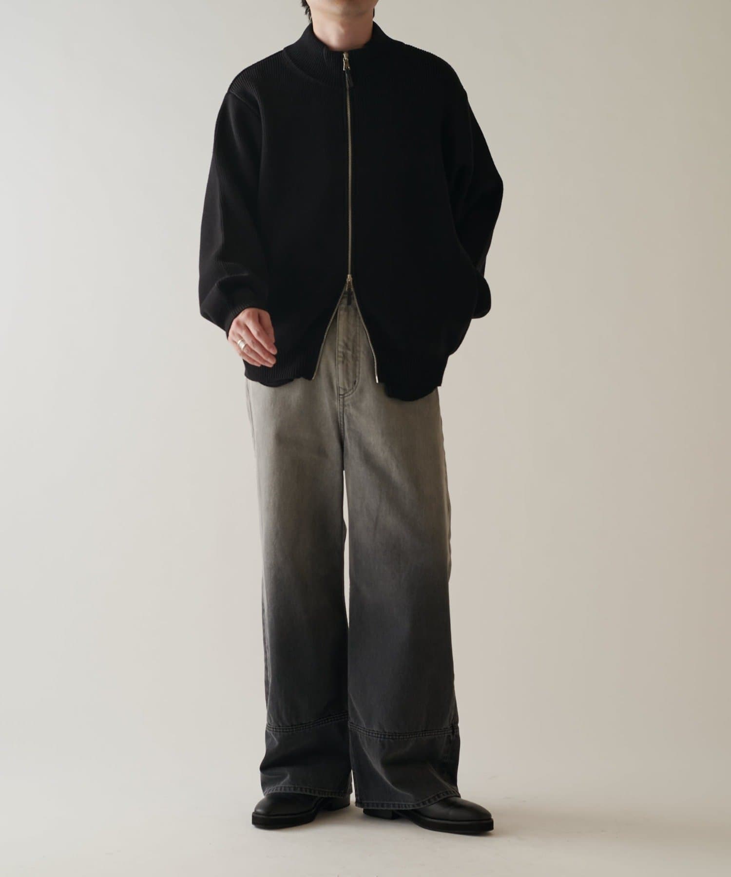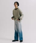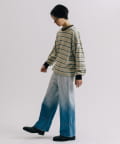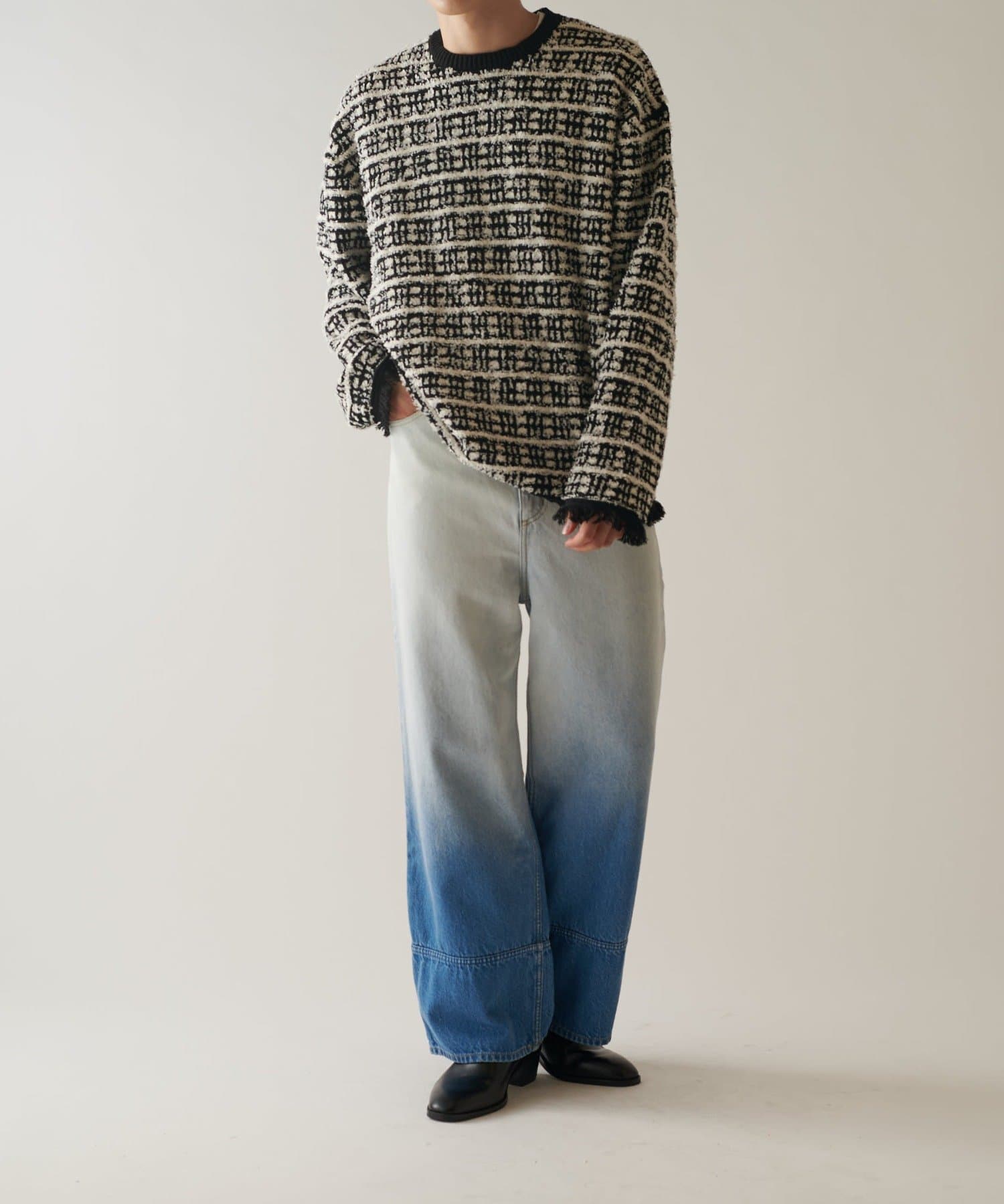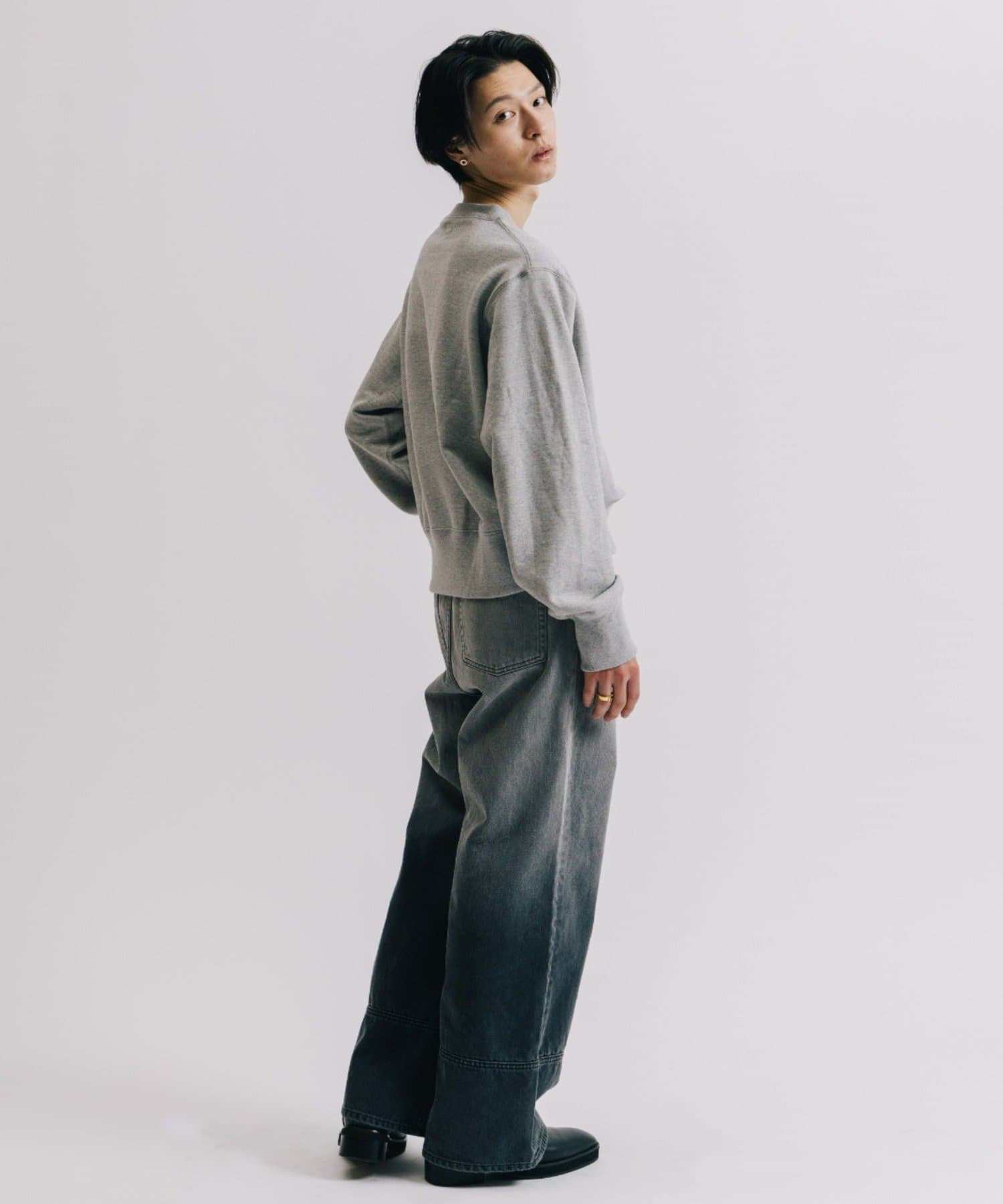 グラデーションのデザインがポイントのこちらのデニムパンツ。シルエットは、ウエストから裾にかけて、ストンと落ちたワイドストレートシルエット。ウエスト部から裾にかけて濃度が濃くなるグラデーションのカラーリングがポイント。裾に濃い色をもってくることによって、スタイルがキレイに見える様になっております。