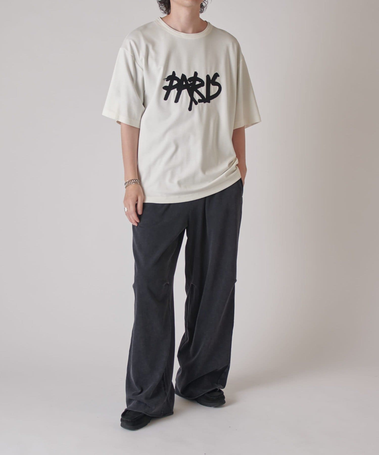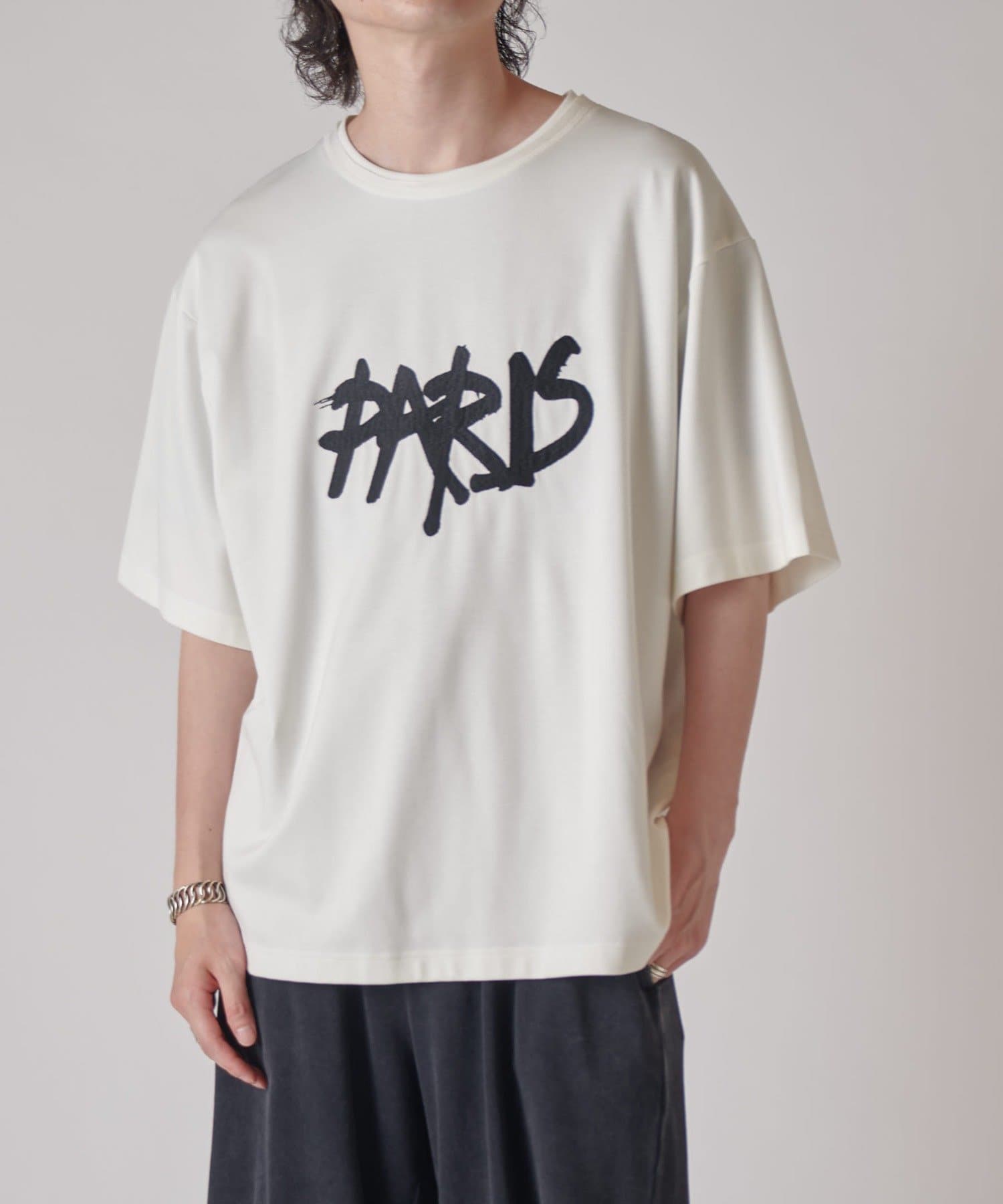 フロントにスプレーペイントのような刺繡が施されたTシャツ。大きすぎず、小さすぎずの程よいサイズ感。PARISの文字間隔をあえて狭くし、ニュアンスなデザインに。