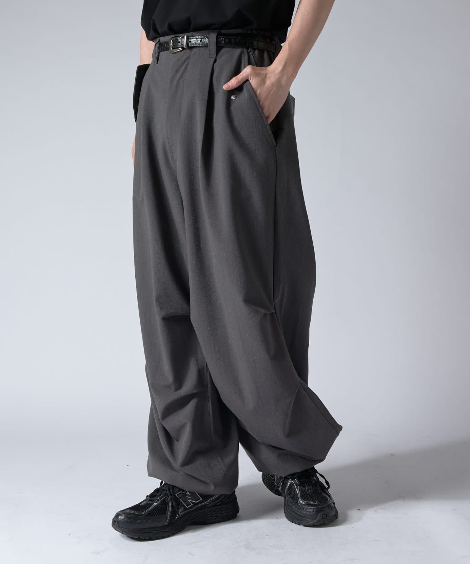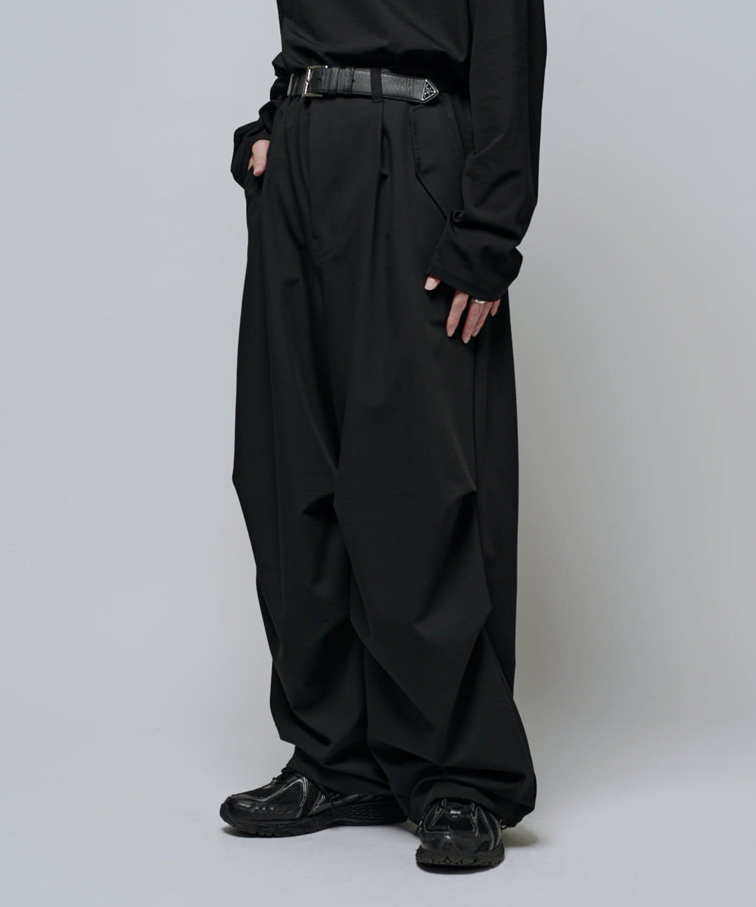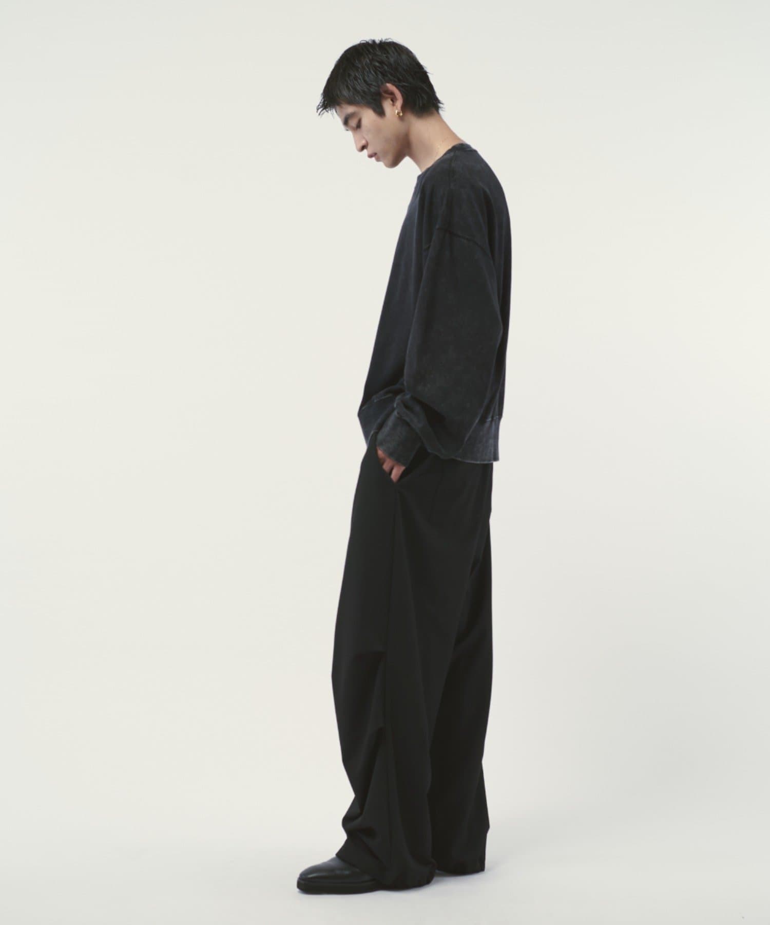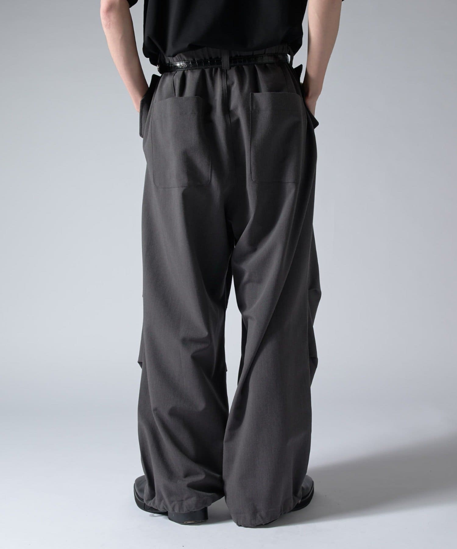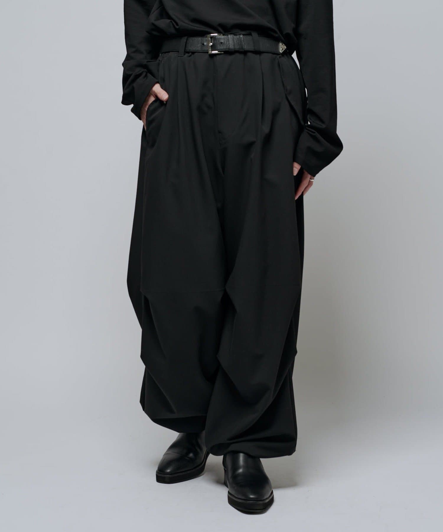ミリタリーパンツをキレイな素材で表現したこちらのパンツ。ウエストからストンと落ちるワイドシルエット。膝にはタックを施して立体的な見え方に。