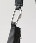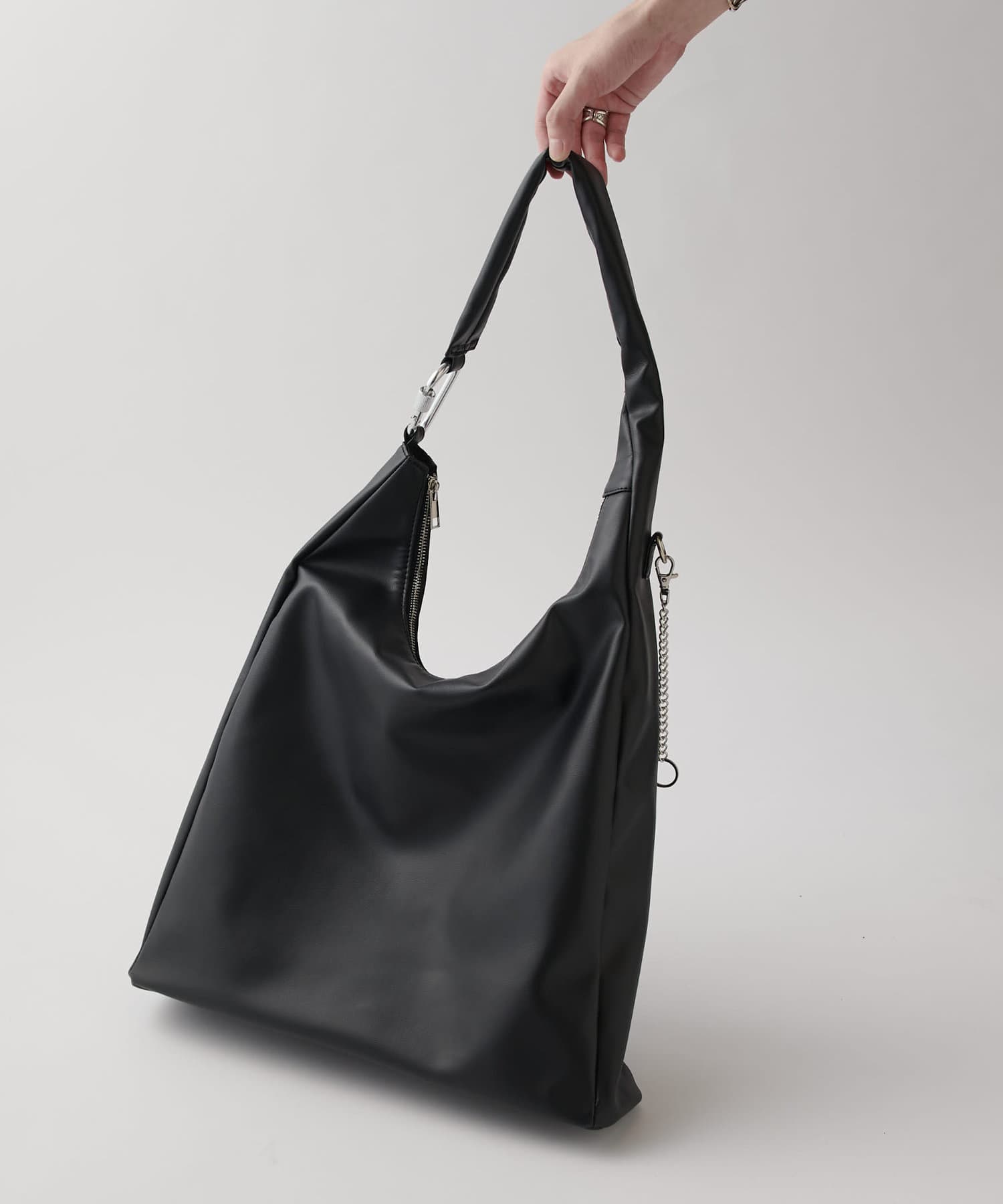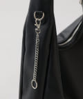 メタルチェーンのアクセントが特徴的なこちらのバッグ。ショルダー部分の一部をチェーンとカラビナのアクセントで仕上げたユニークなデザイン。