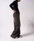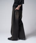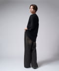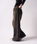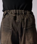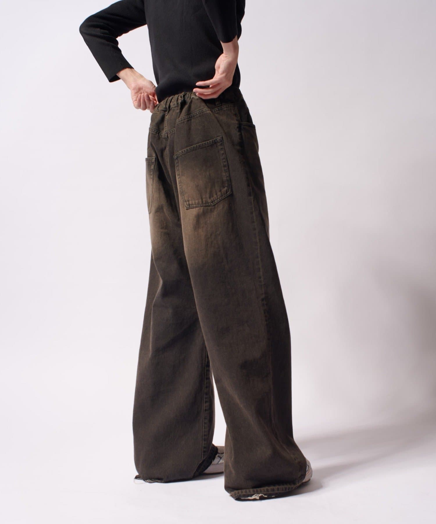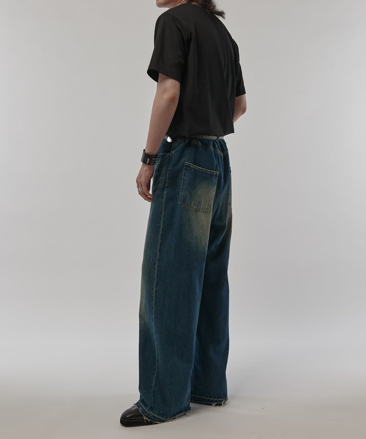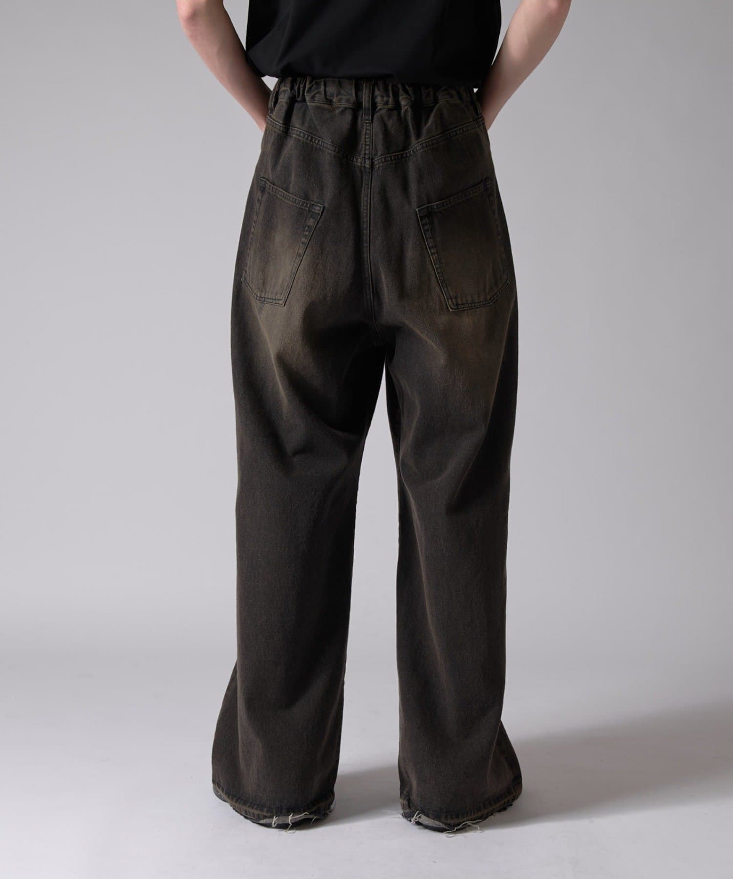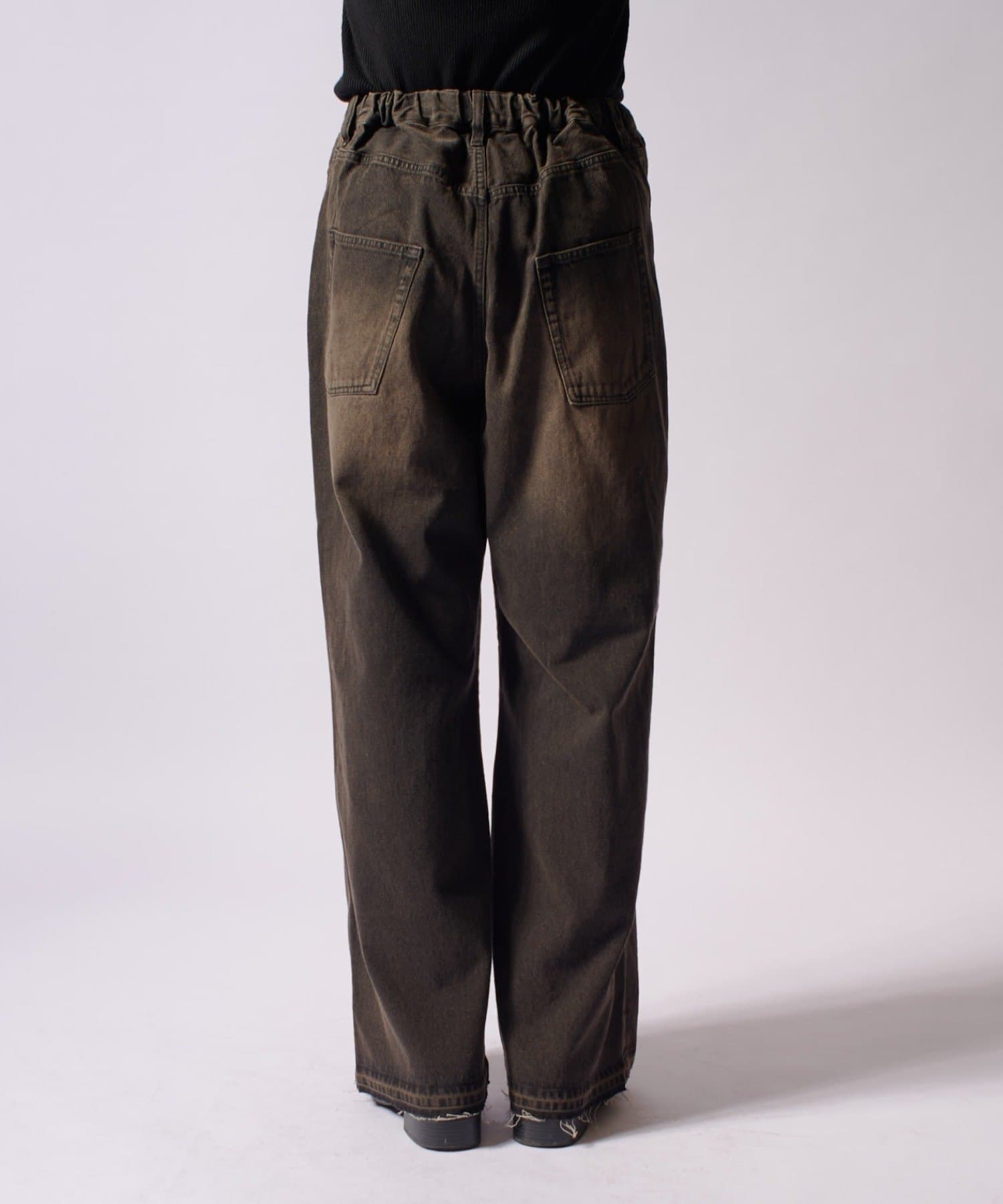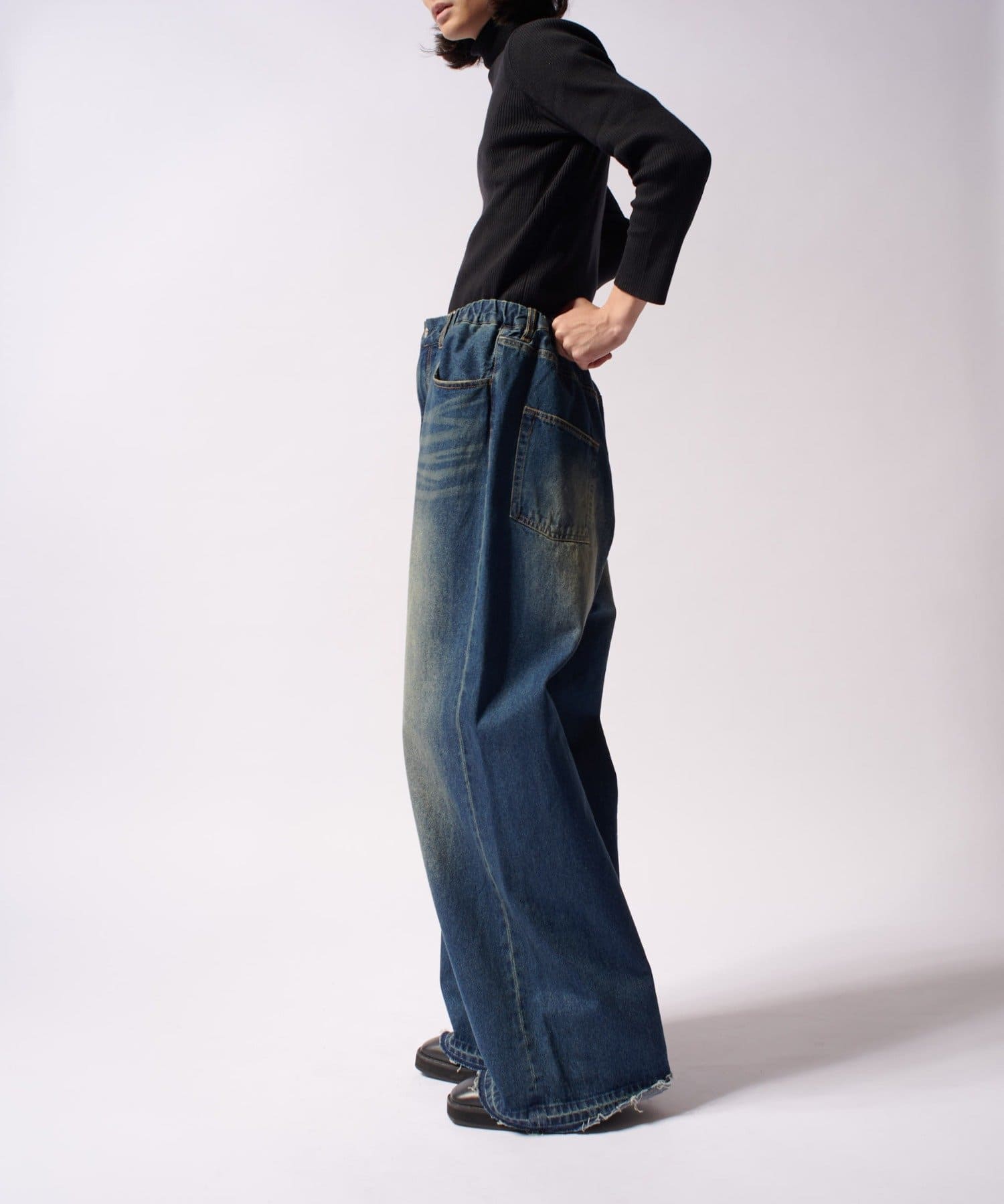 ウエストにはゴムを入れて、さらに紐を通しており、調節可能。裾はデニムの裾をほどいたかのような、アタリのデザインに。デニムなのにイージーに穿ける新しいデニムです。