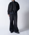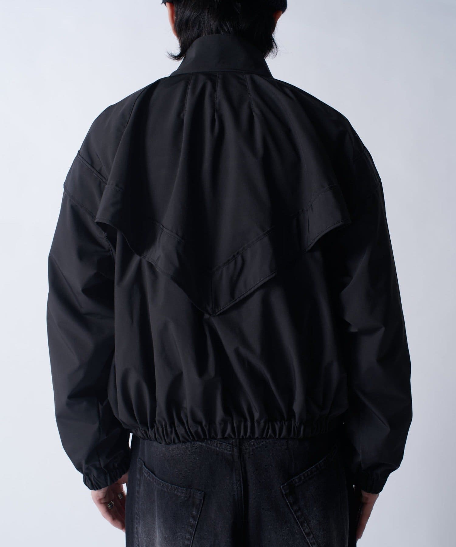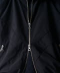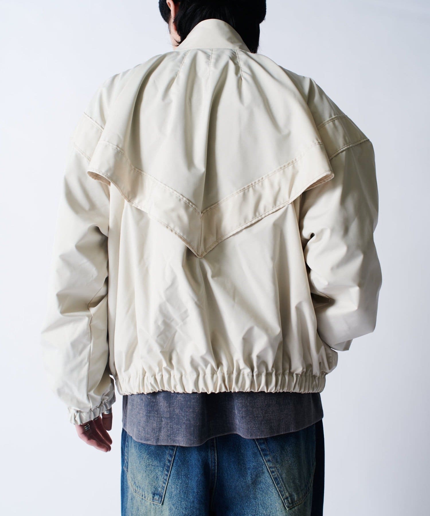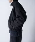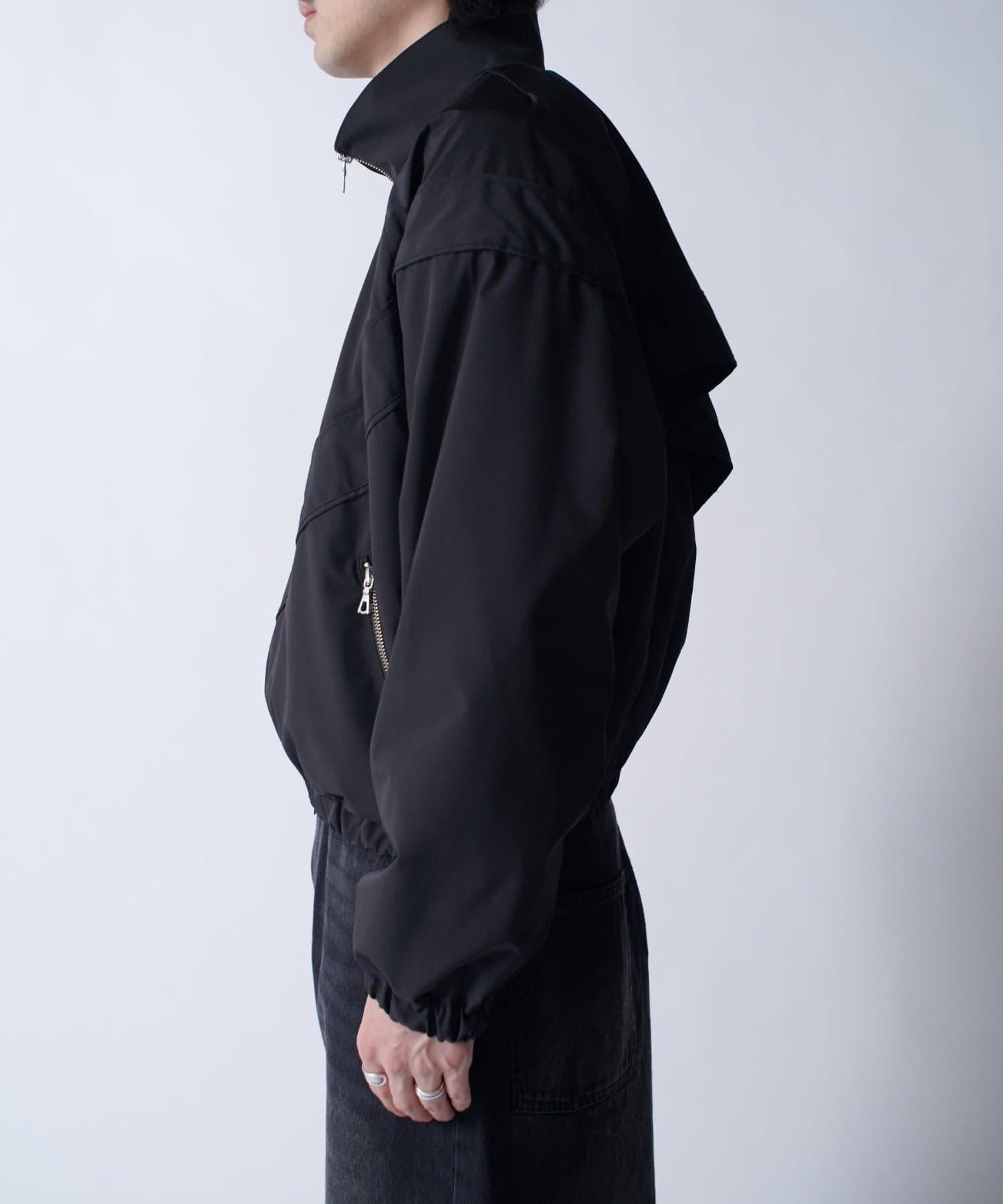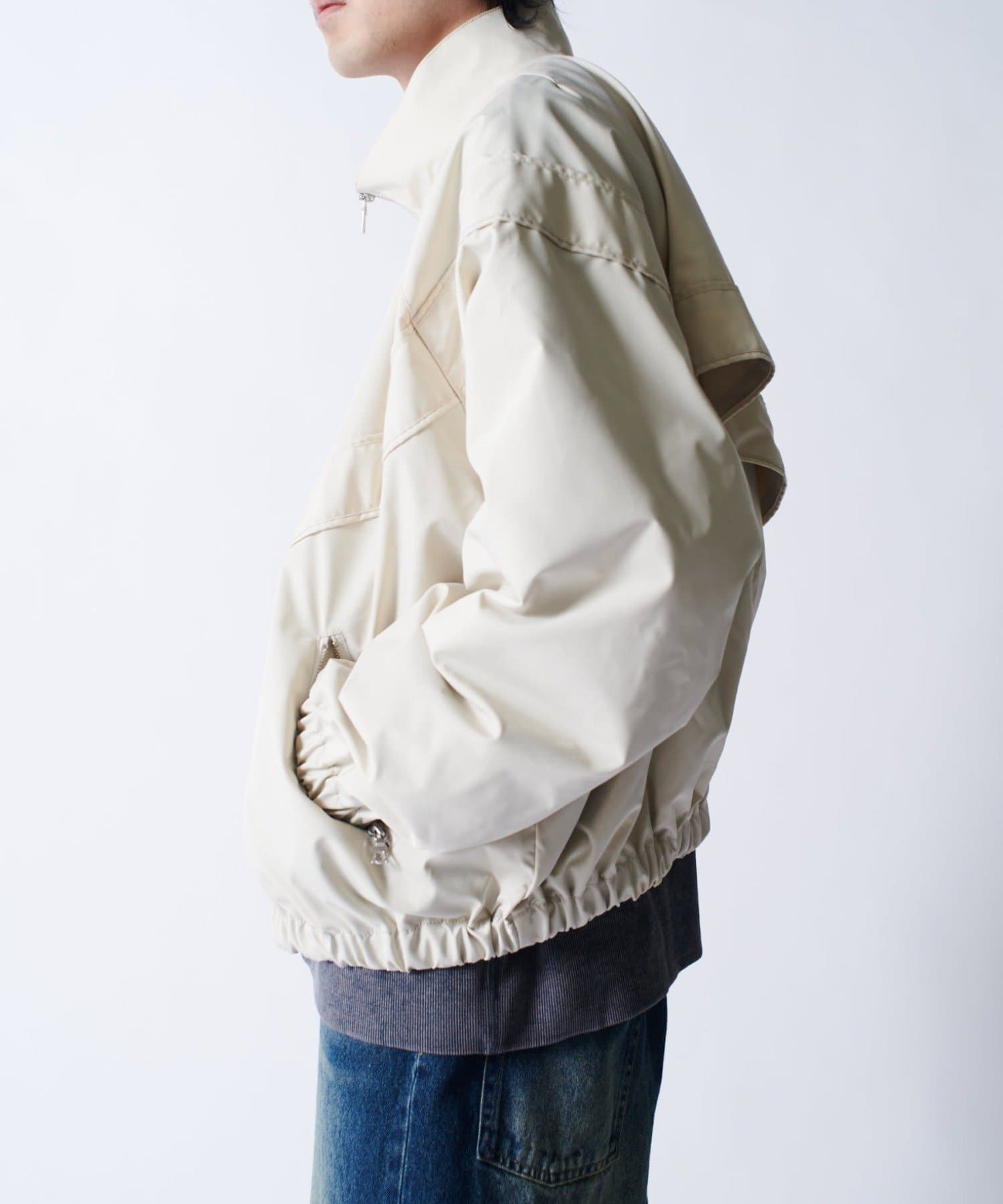 着丈に対して身幅を広くとったボックスシルエット。首元はハイネック仕様で上まで上げると首が覆われる仕様に。さらっと一枚で着て頂けるジャケットです。