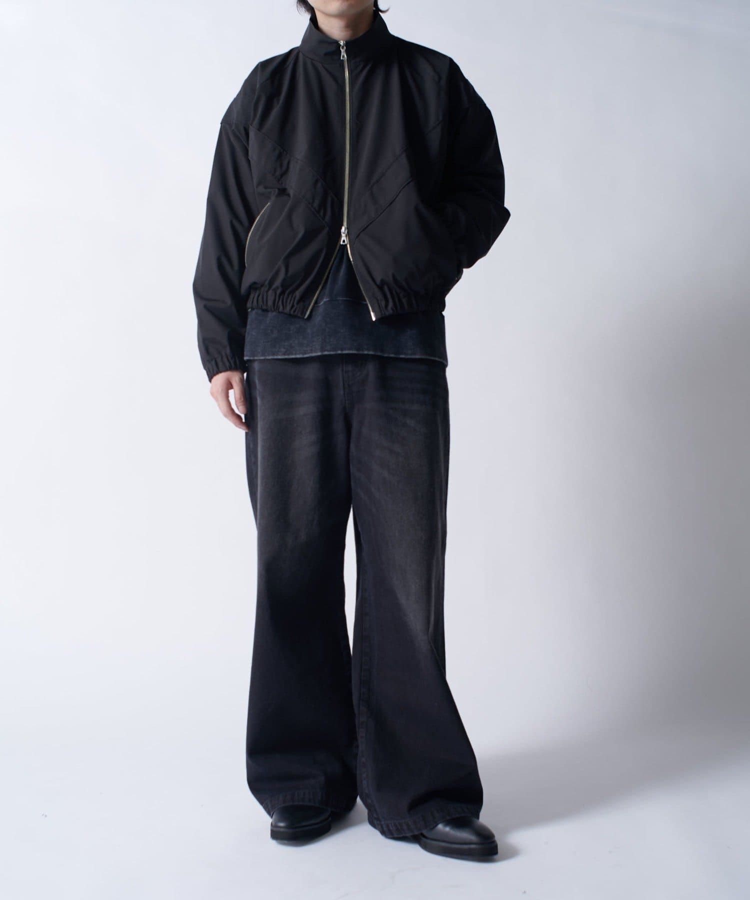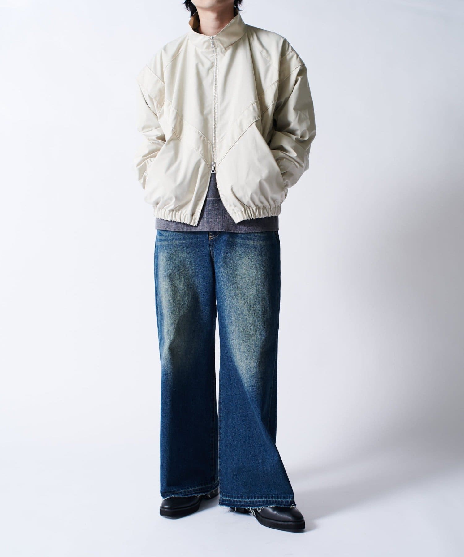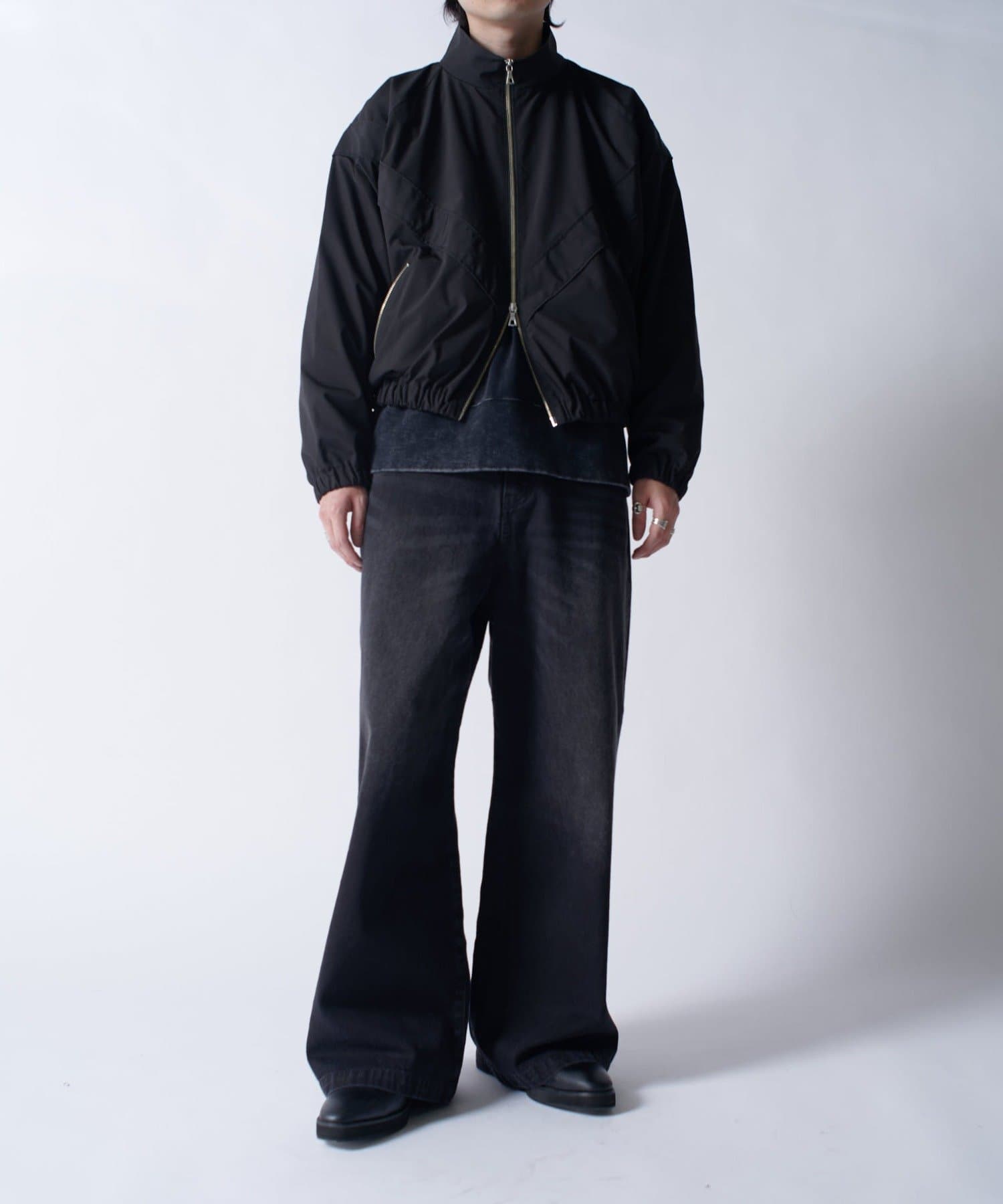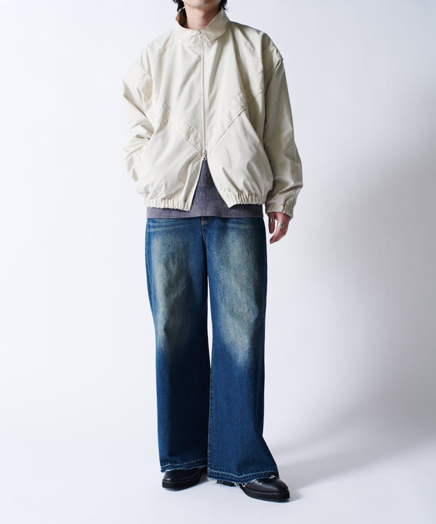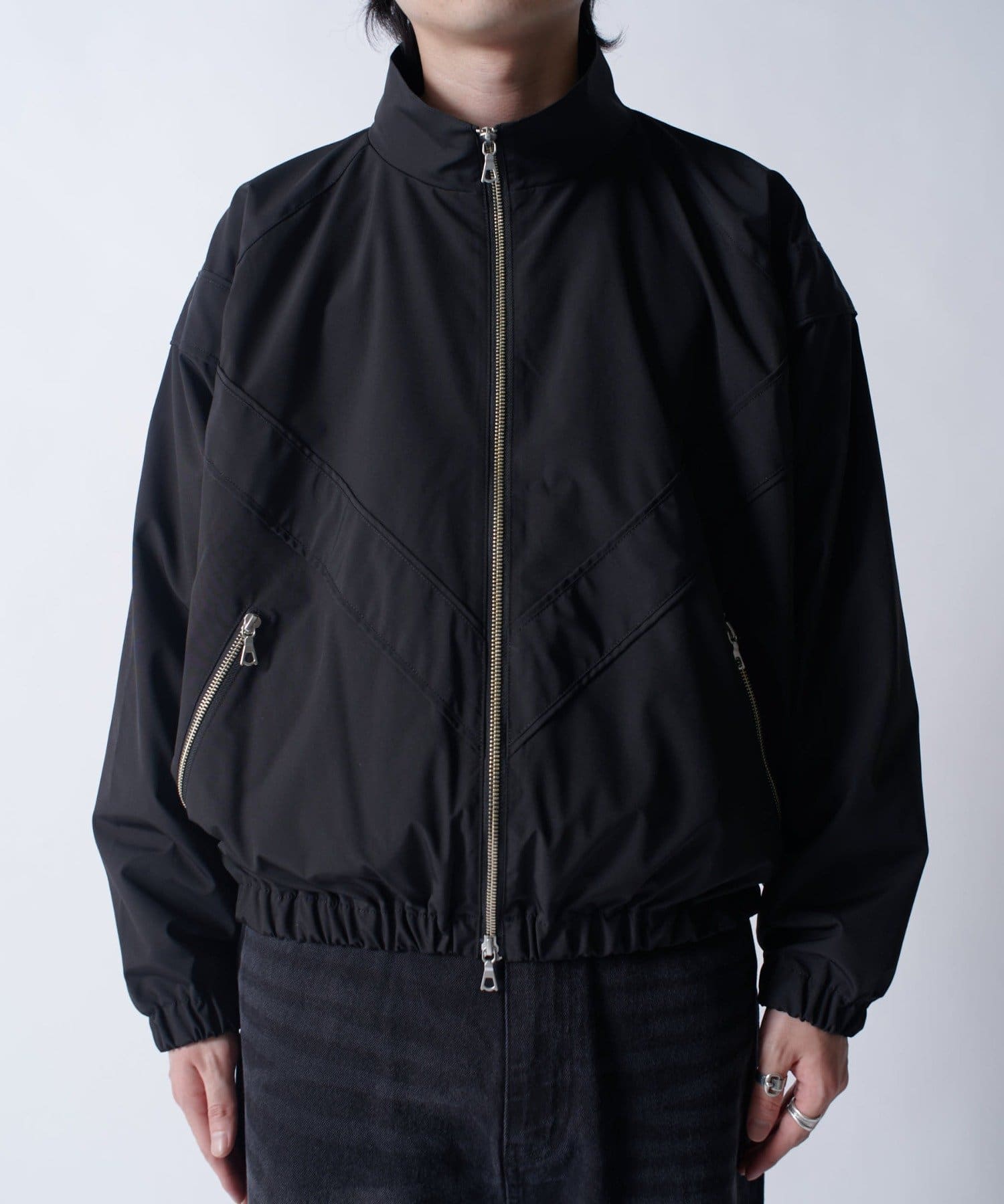 着丈に対して身幅を広くとったボックスシルエット。首元はハイネック仕様で上まで上げると首が覆われる仕様に。さらっと一枚で着て頂けるジャケットです。