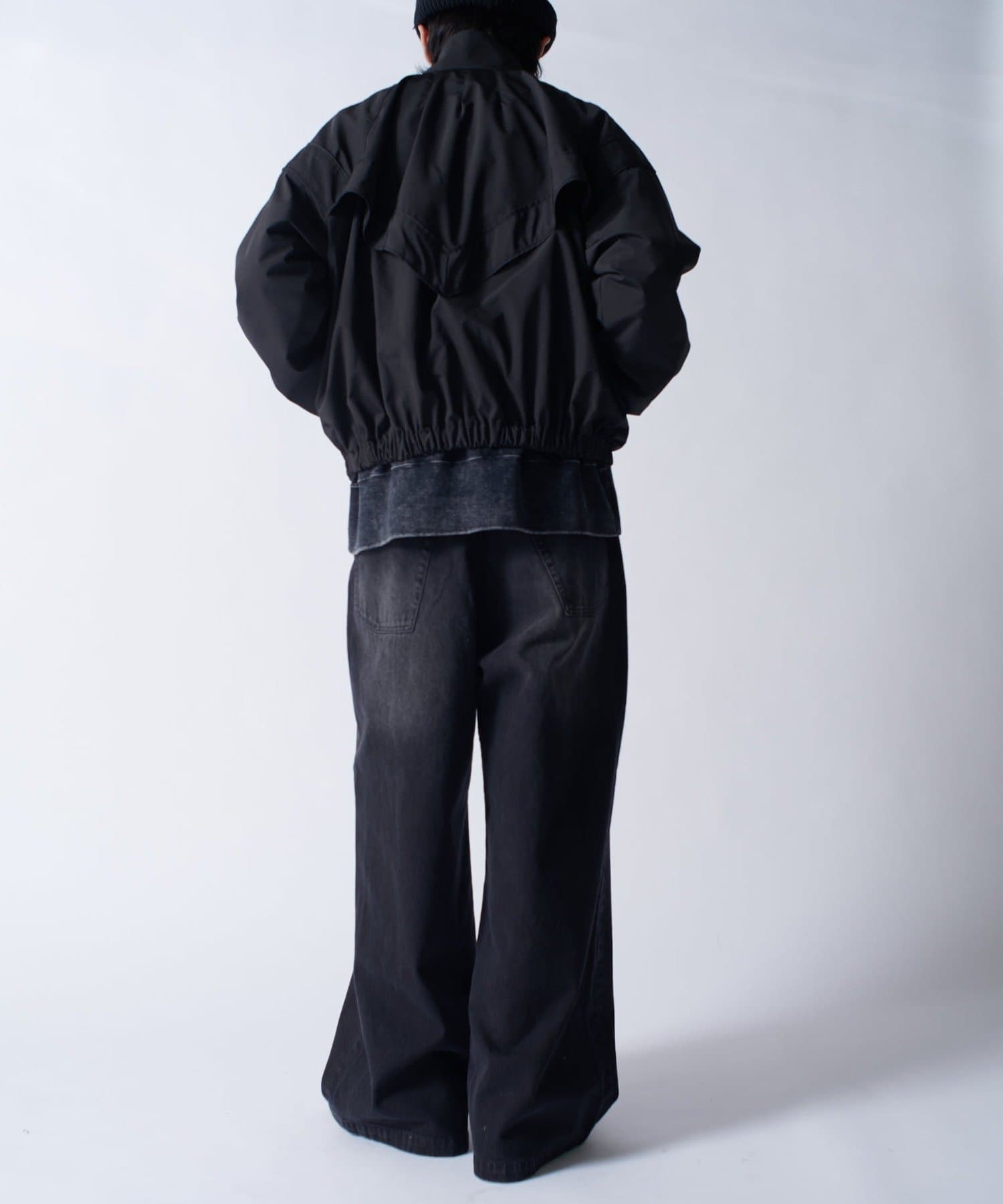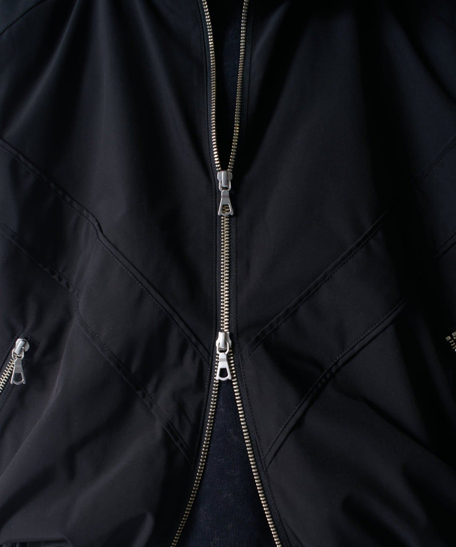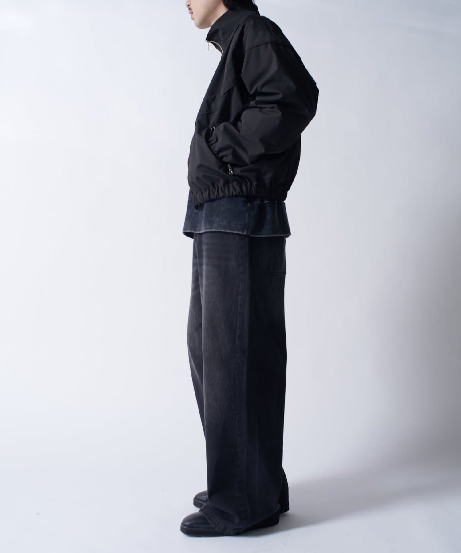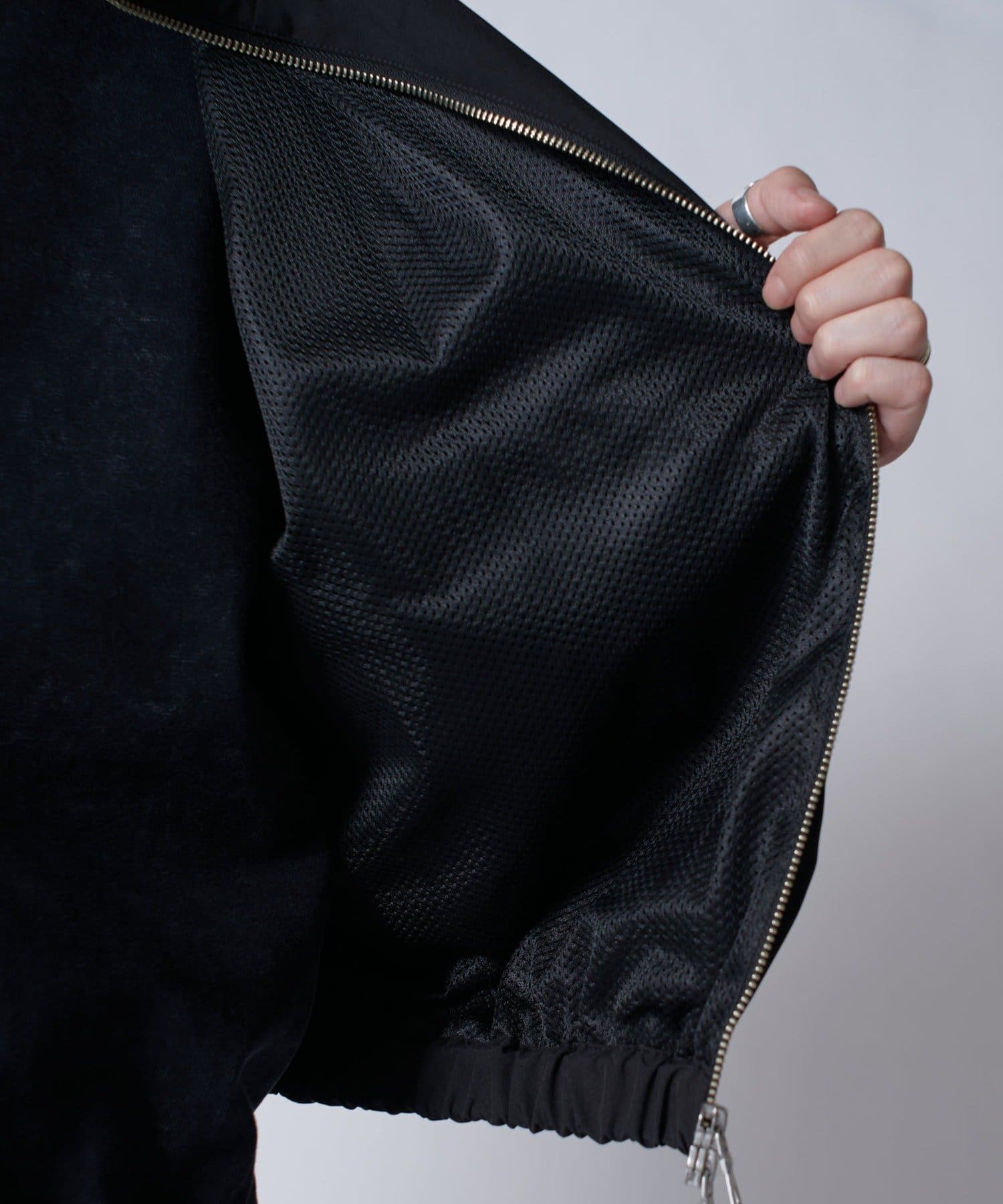 着丈に対して身幅を広くとったボックスシルエット。首元はハイネック仕様で上まで上げると首が覆われる仕様に。さらっと一枚で着て頂けるジャケットです。