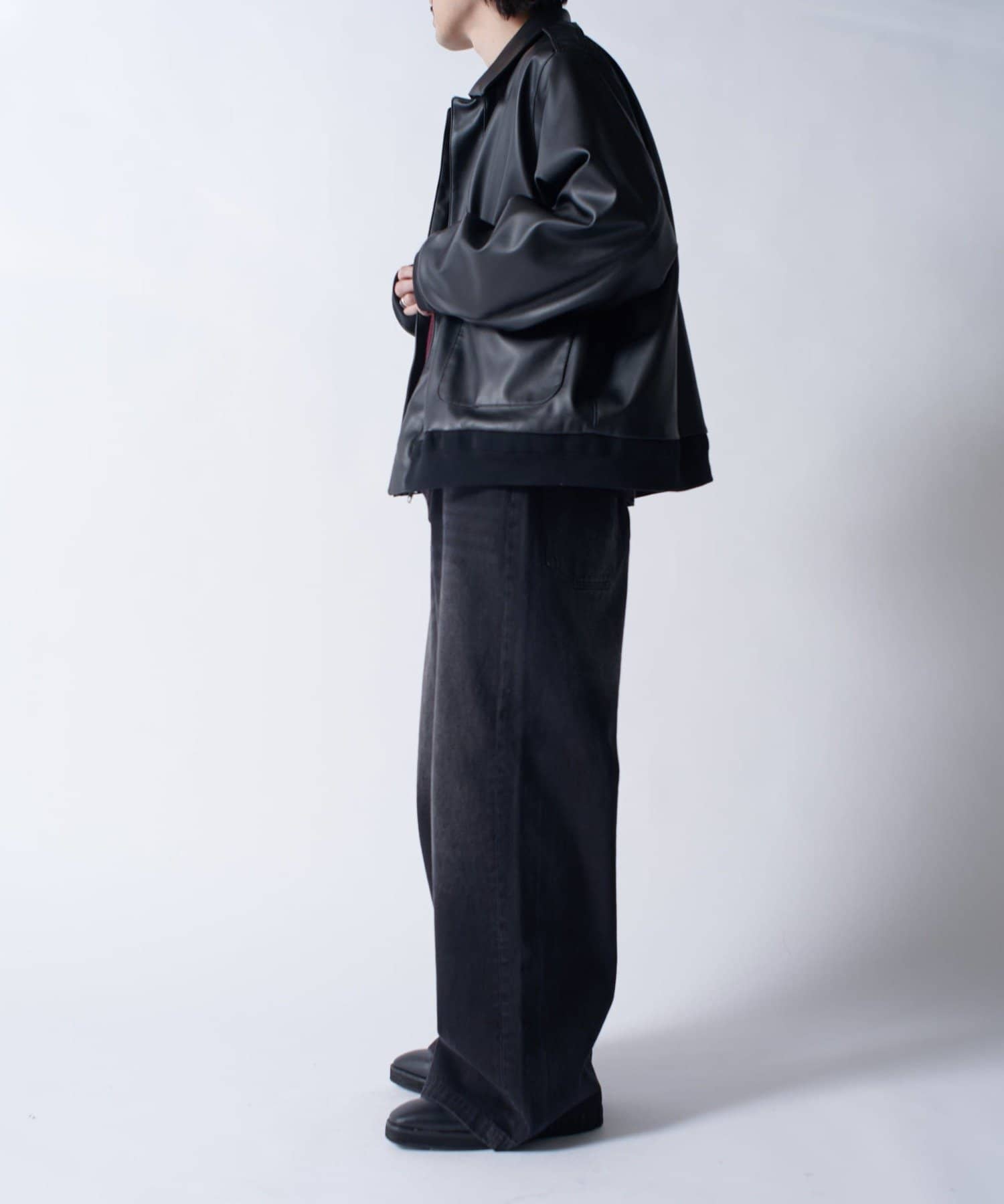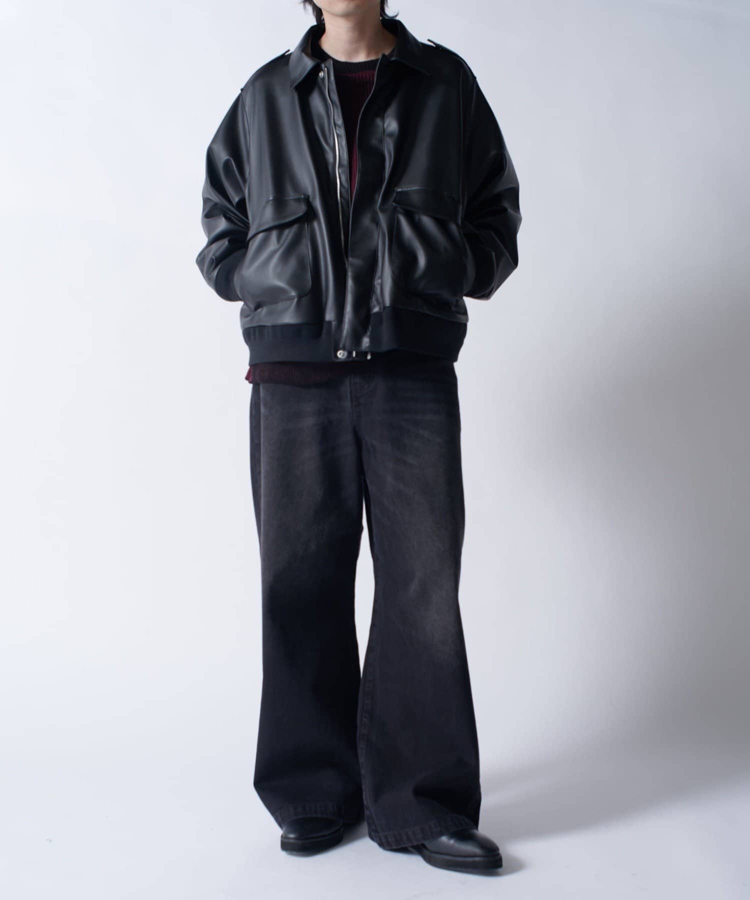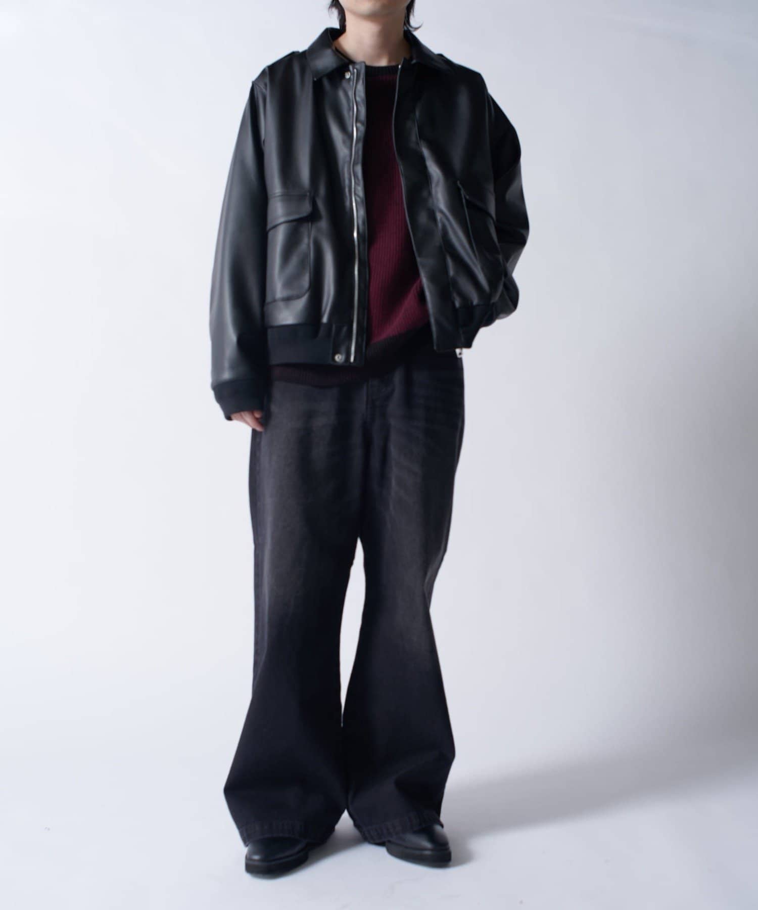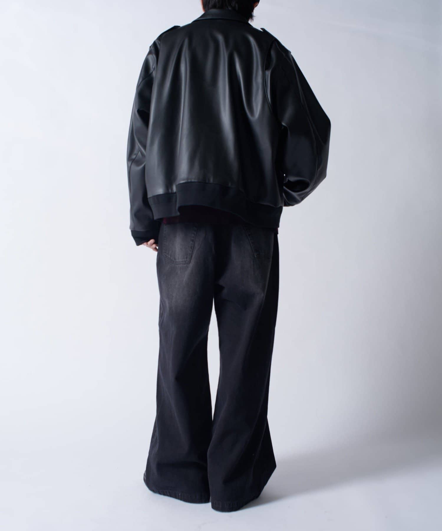 通常ショート丈でコンパクトなサイズ感のフライトジャケットを、やや大きめに着やすくサイズ修正しました。バックにはアクションプリーツ、肩にはエポレットを設けて立体的な見え方に。無駄なディテールは省き、キレイめでシックな印象に仕上げました。