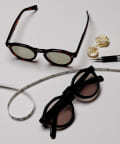 限りなく丸に近い逆三角形のような形のボストン型がベースですが、フレームの下が丸みを帯びたデザインのラウンドになっている、ボストンにウェリントンの要素を取り入れたユニークなデザイン。フレームからブリッジ、ノーズパッドまですべてアセテートで仕上げており、幅広いスタイルで合わせられるサングラスです。