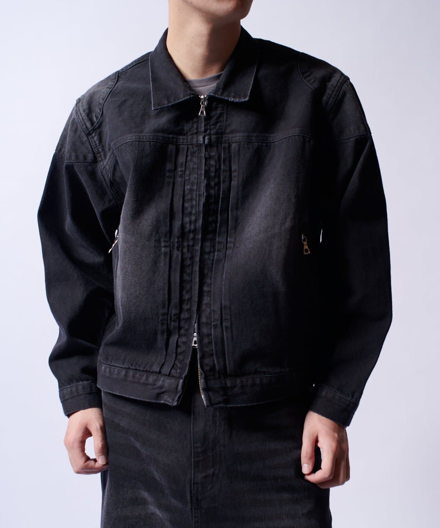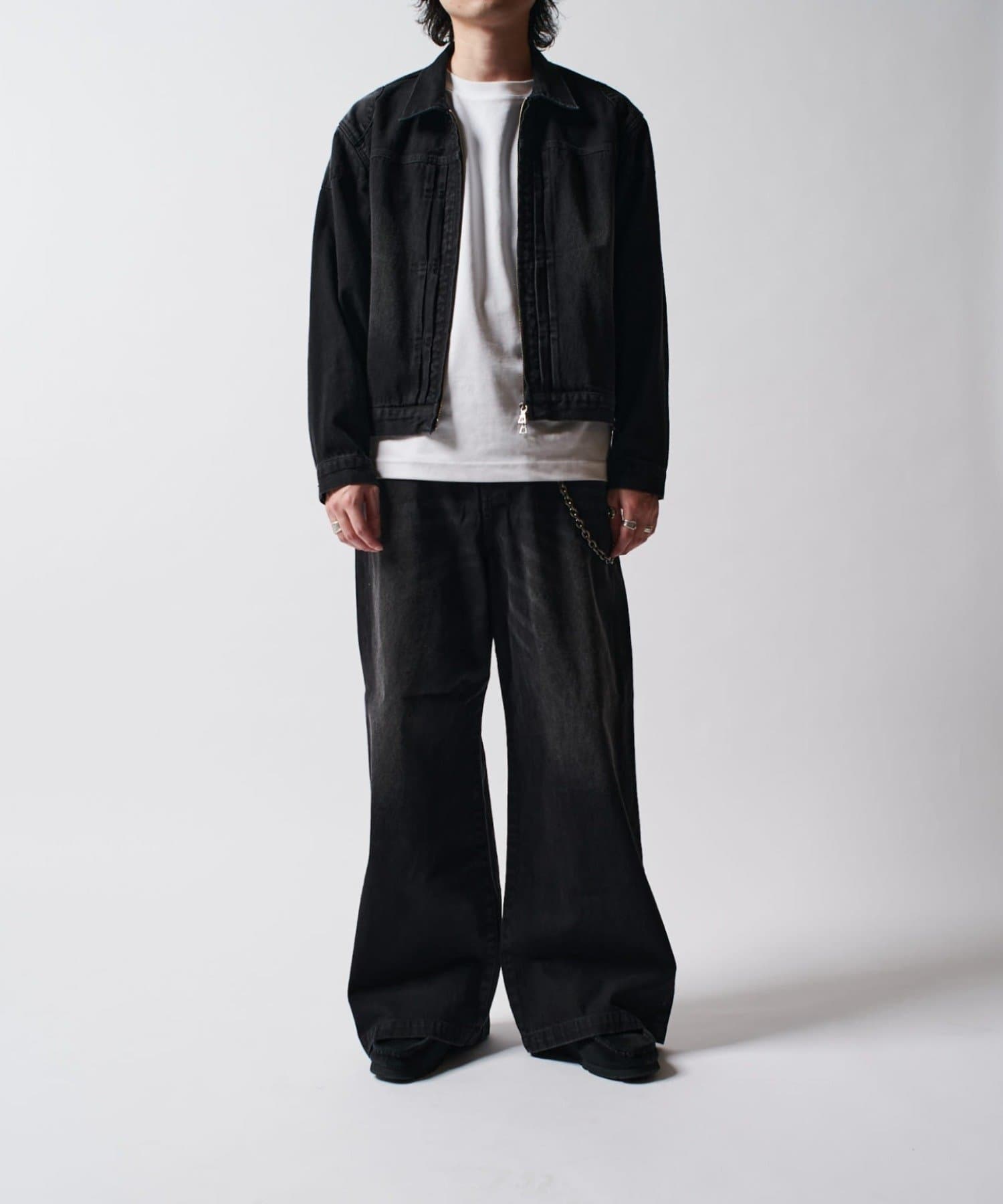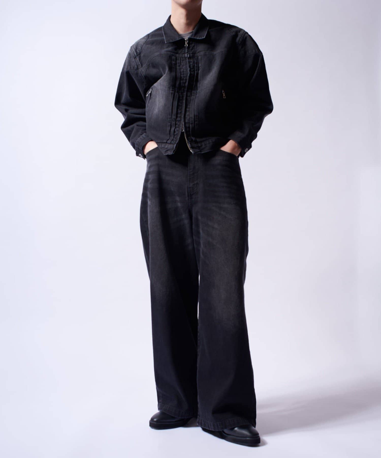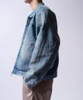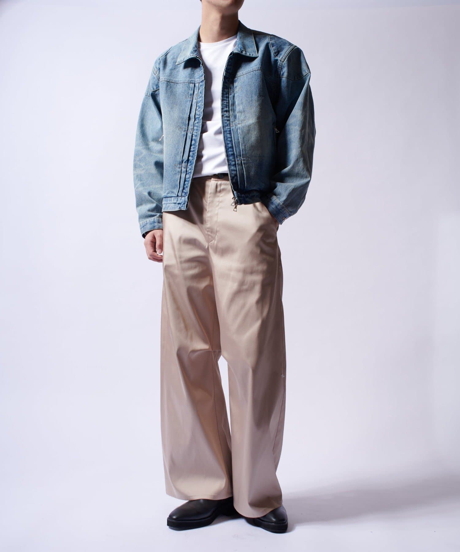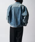 デニムジャケットをZIPブルゾンに仕上げたユニークなデザインのブルゾン。着丈に対して身幅を広くとった、ややルーズなシルエット。