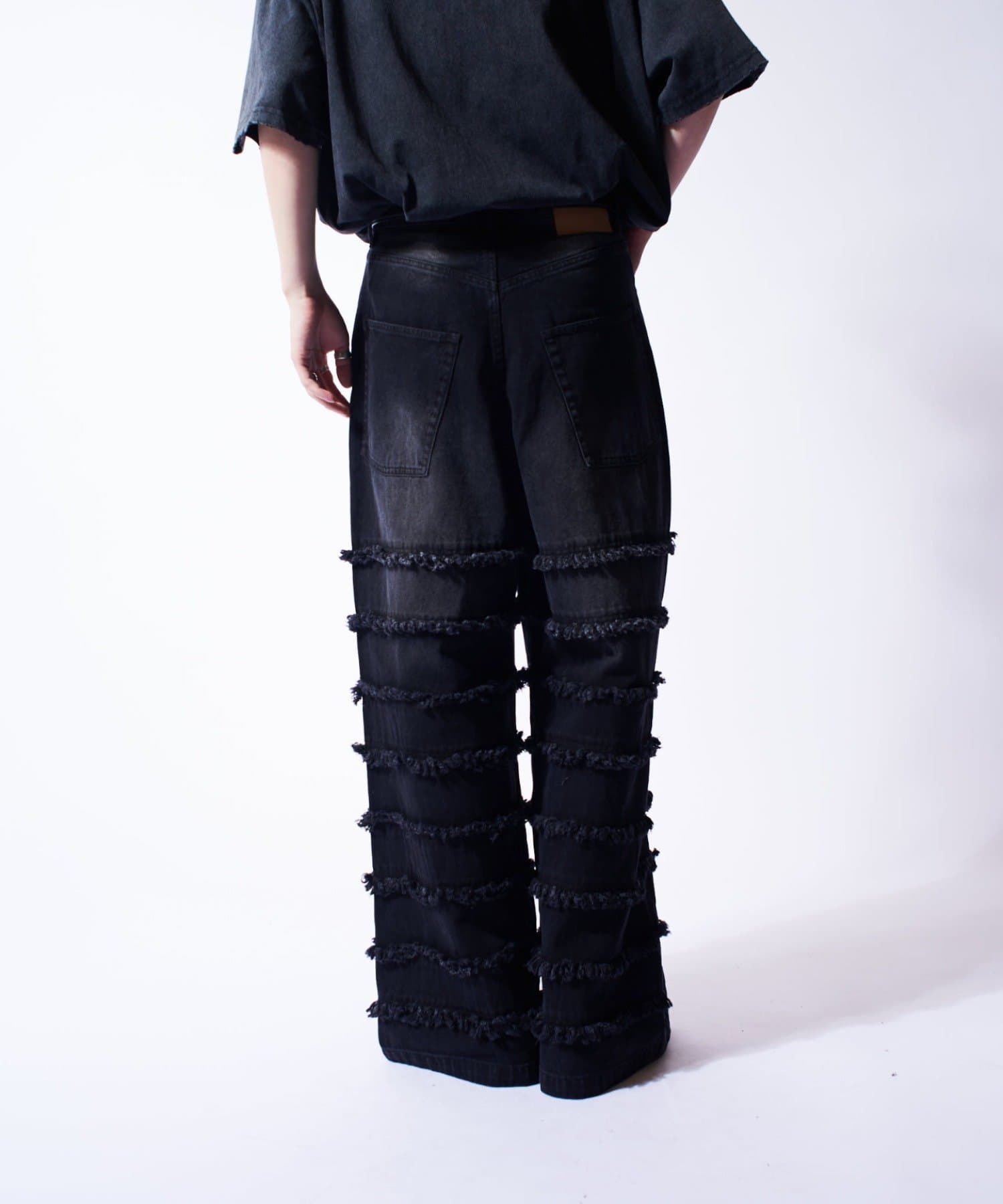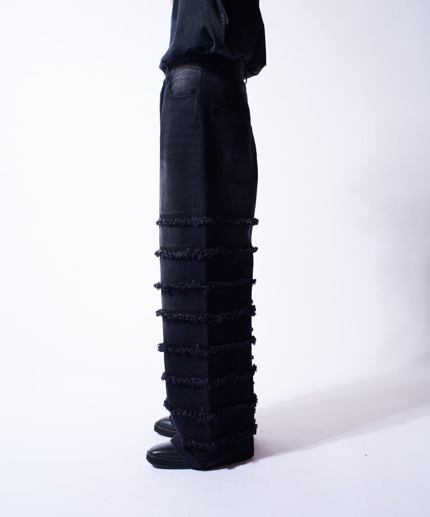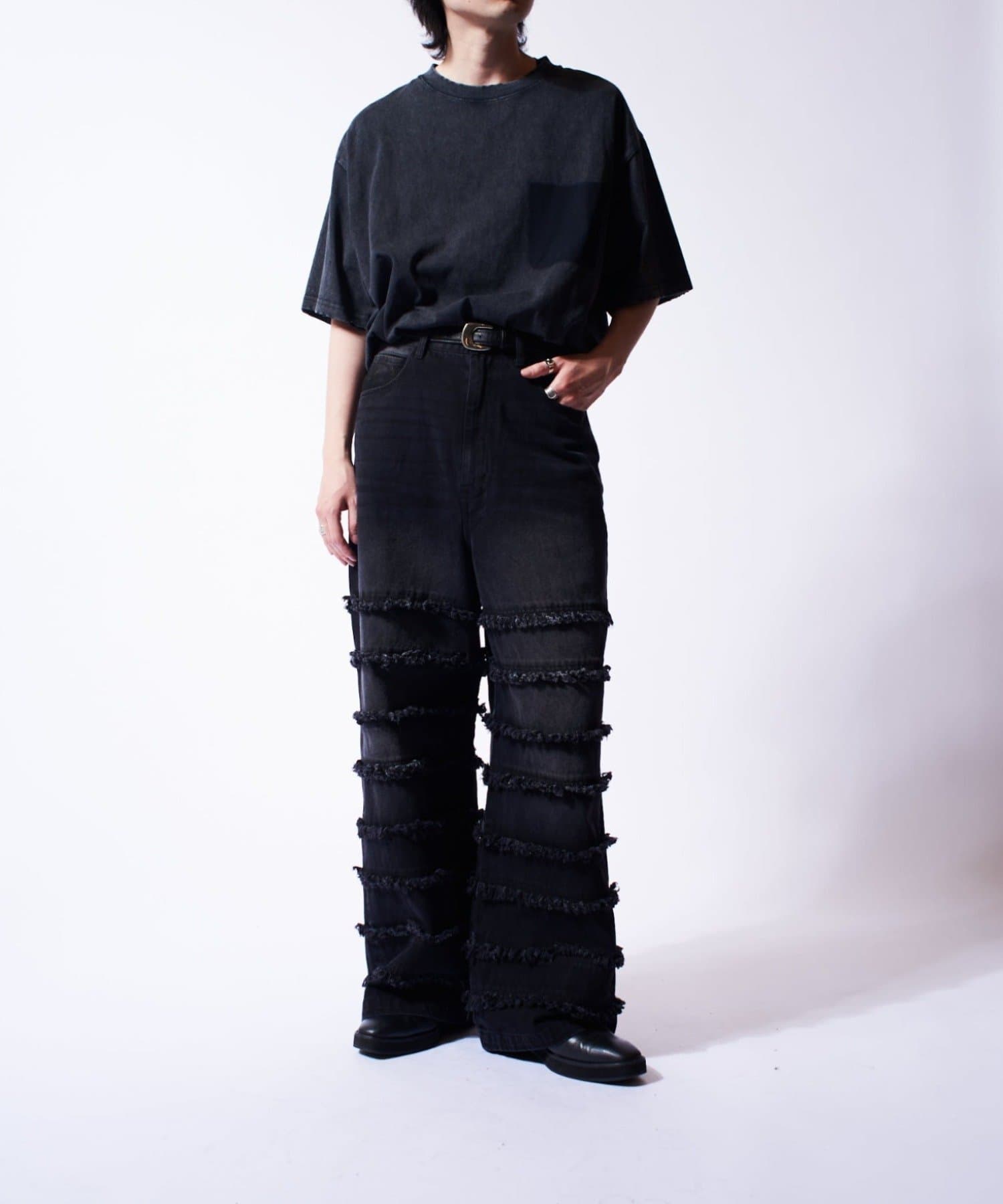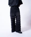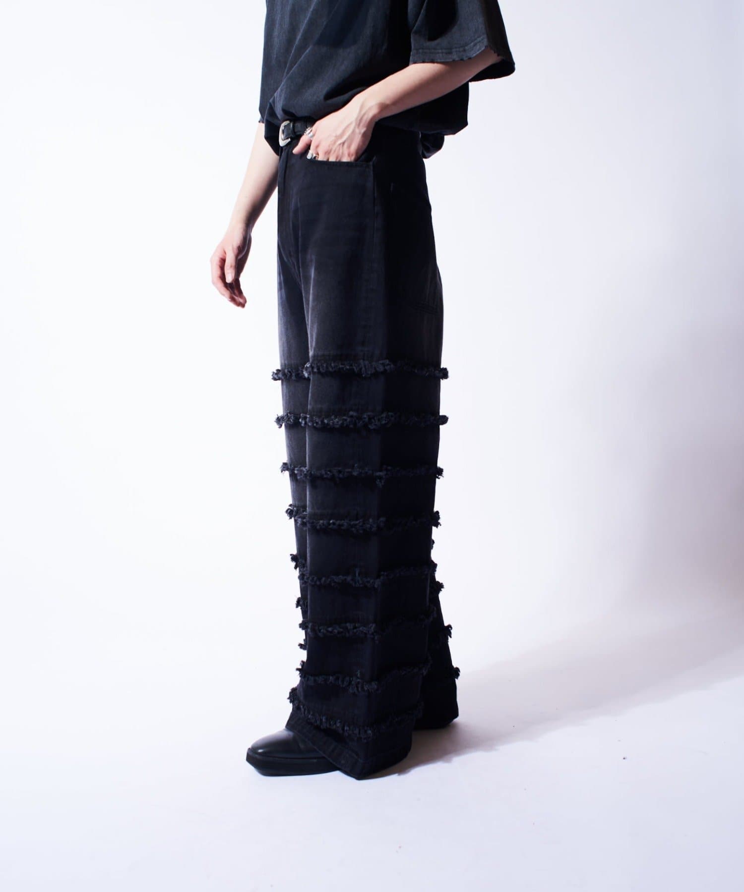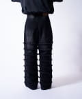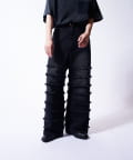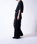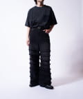 ワタリと裾幅をかなり広く取ったバギーシルエット。継ぎ接ぎのデザインで、一枚で存在感ある見た目に仕上がっております。
