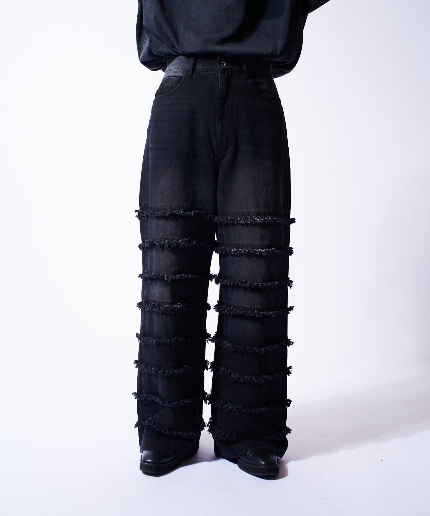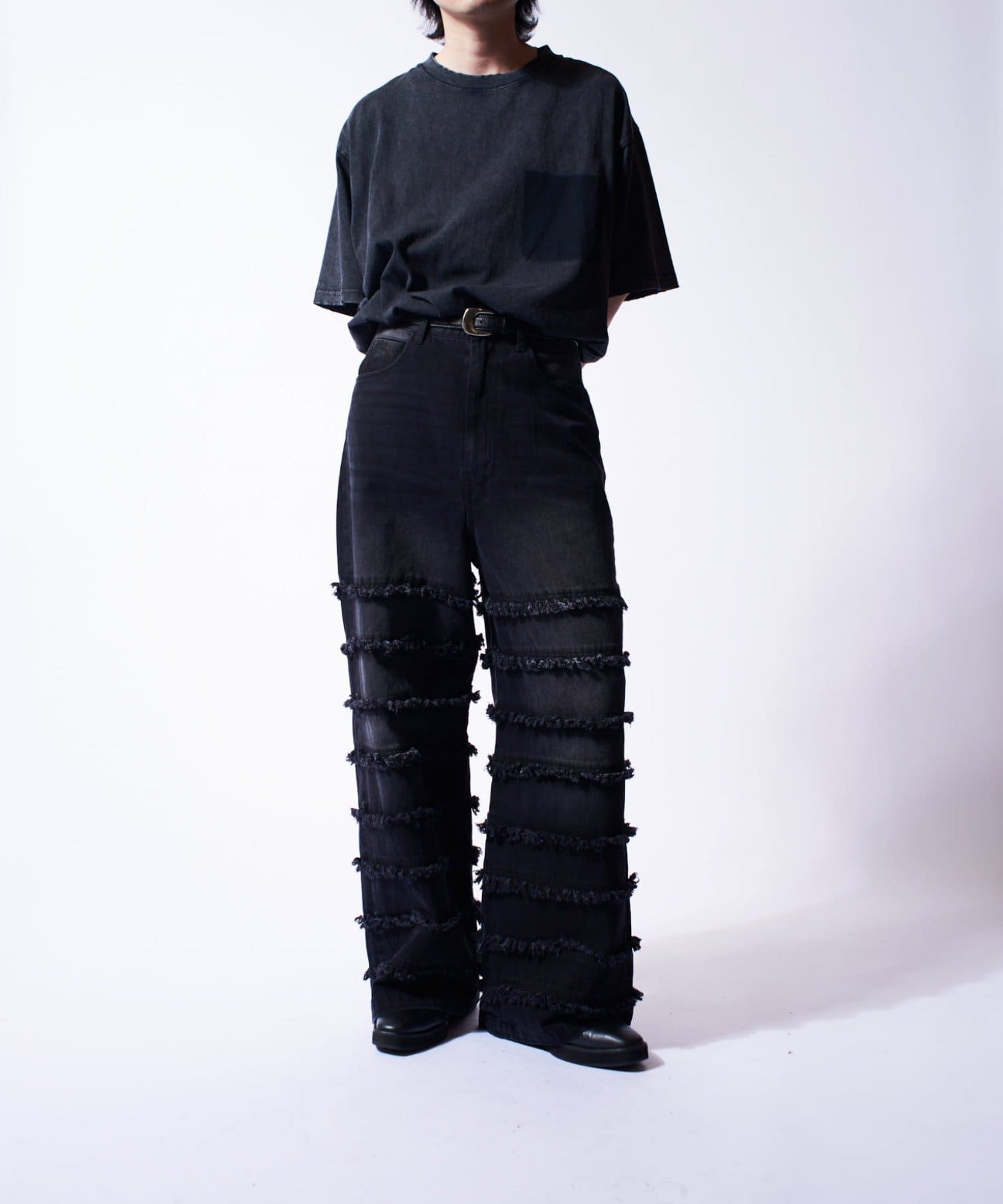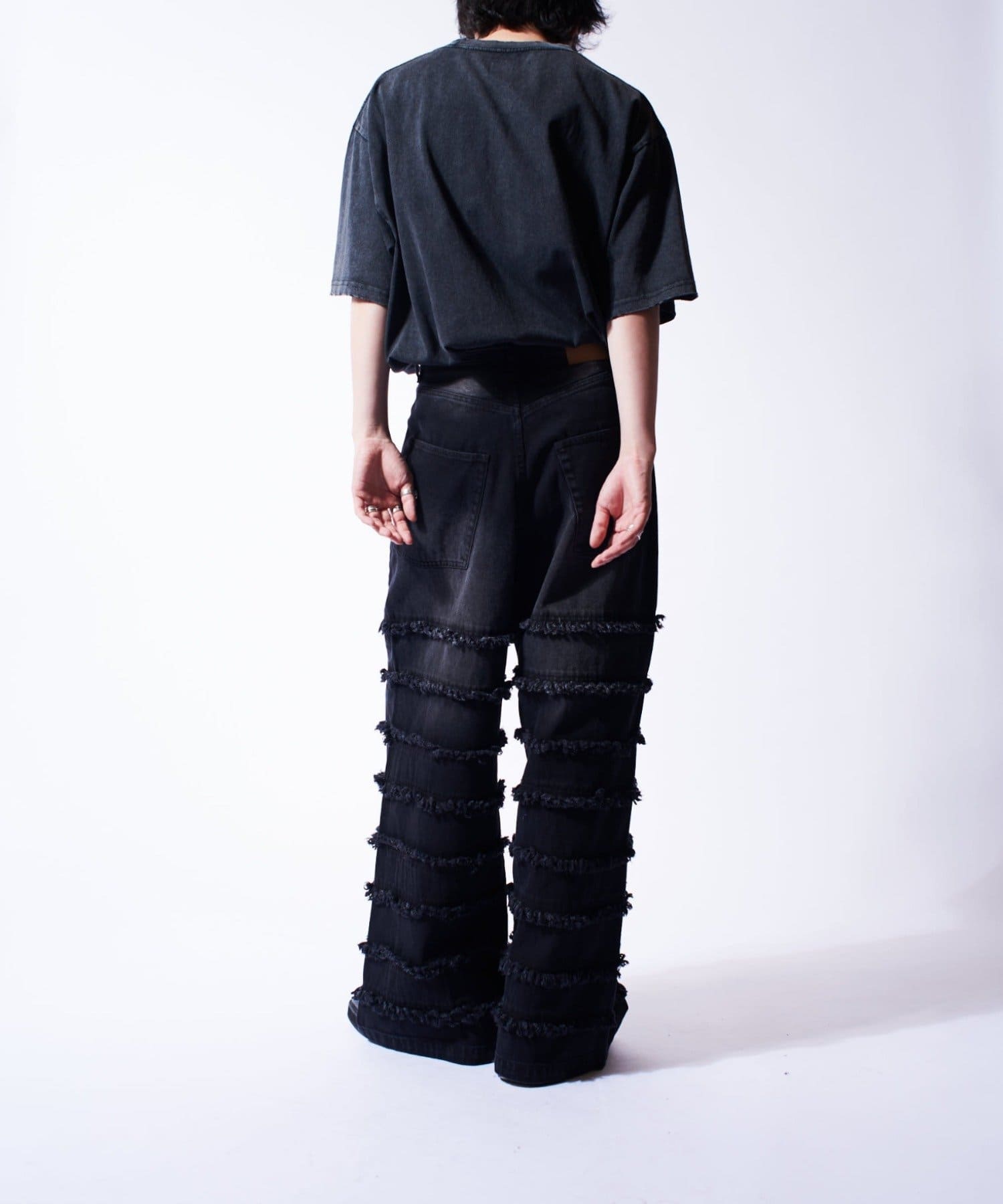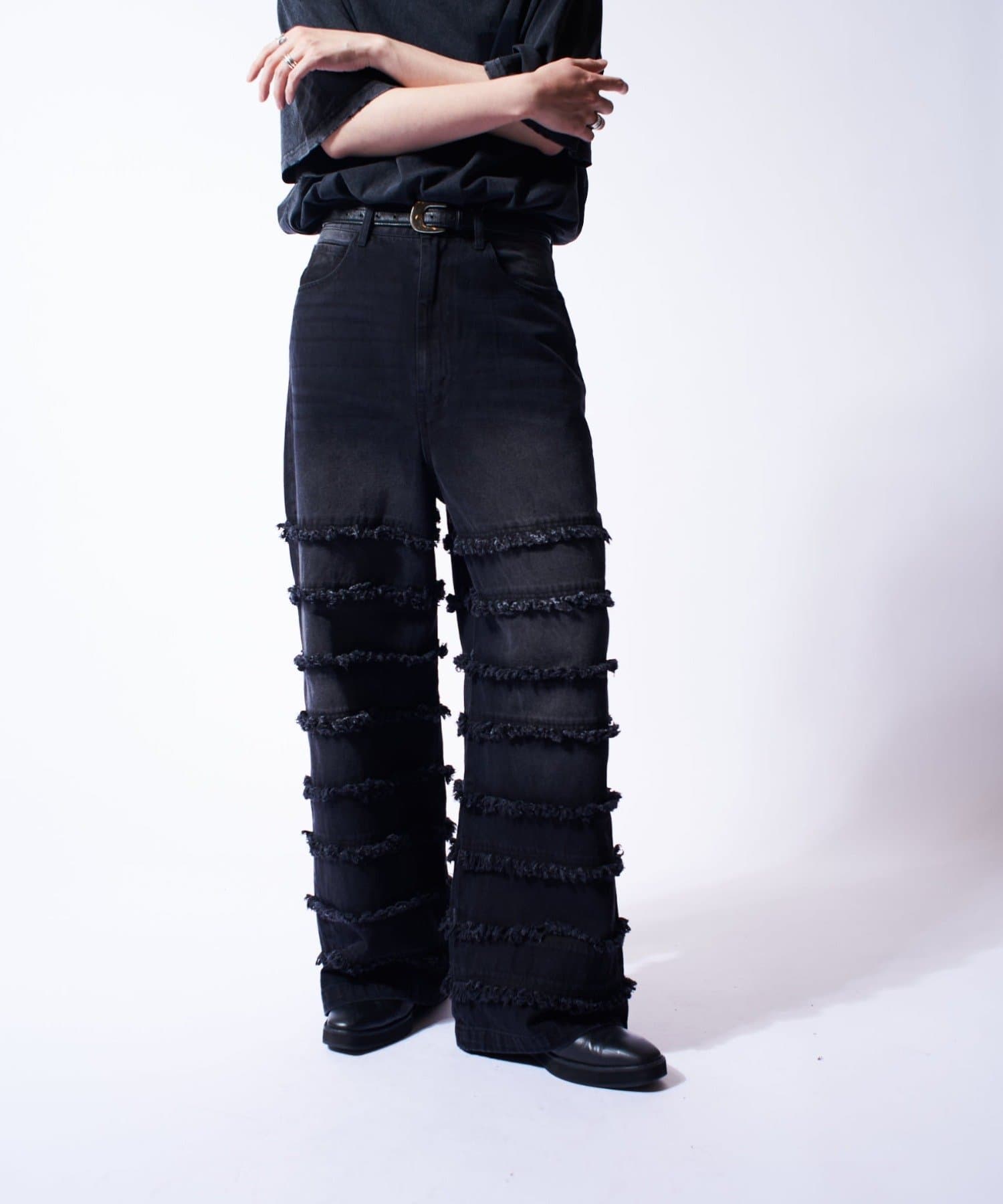ワタリと裾幅をかなり広く取ったバギーシルエット。継ぎ接ぎのデザインで、一枚で存在感ある見た目に仕上がっております。