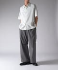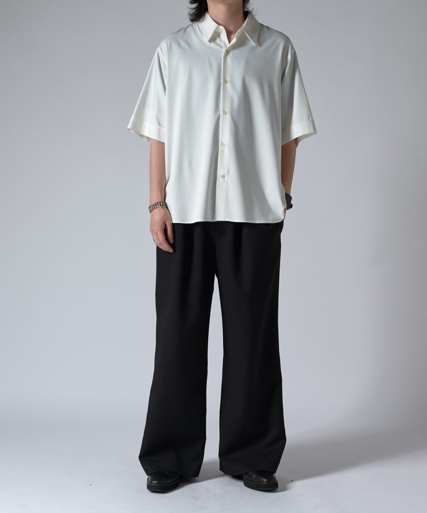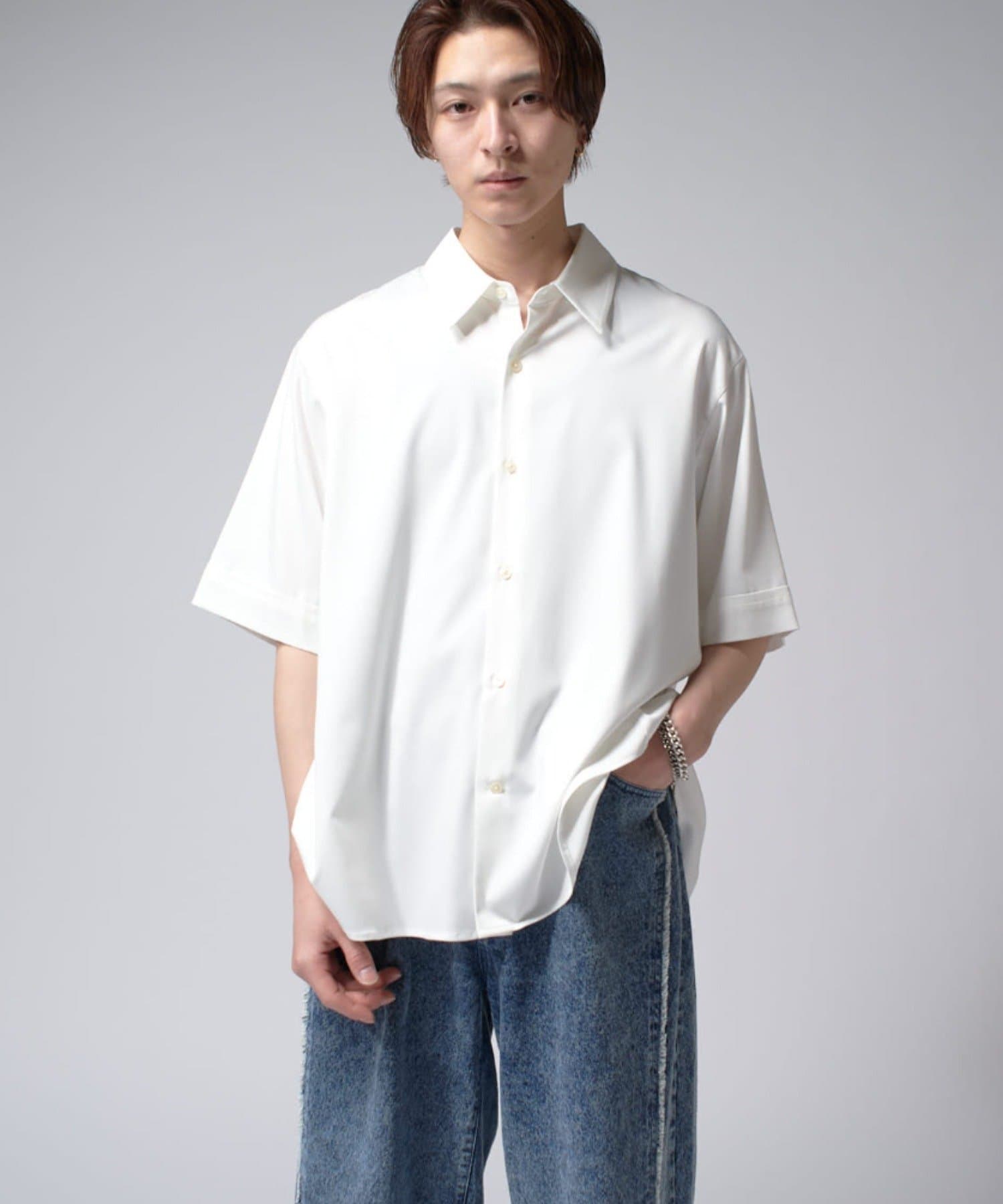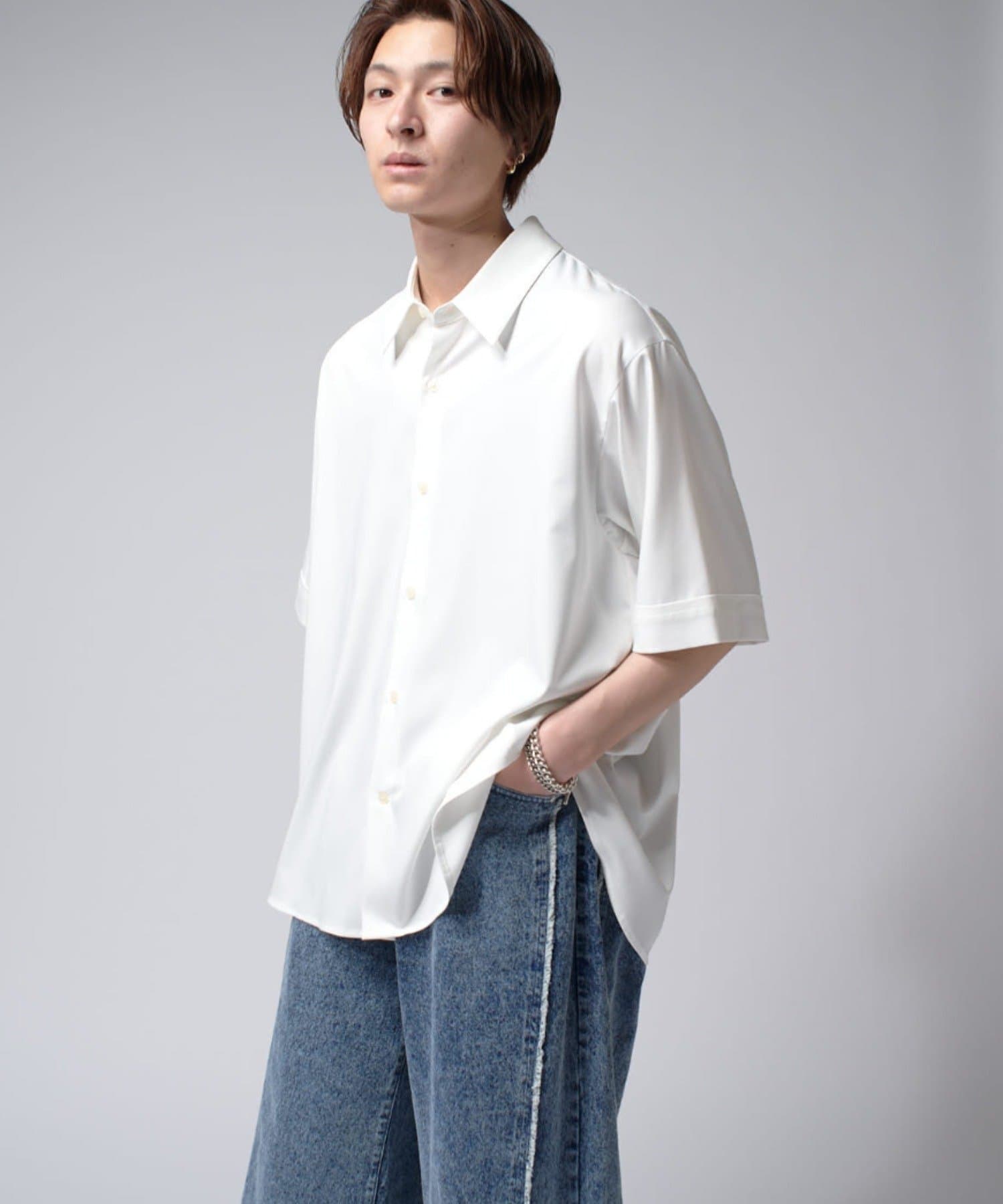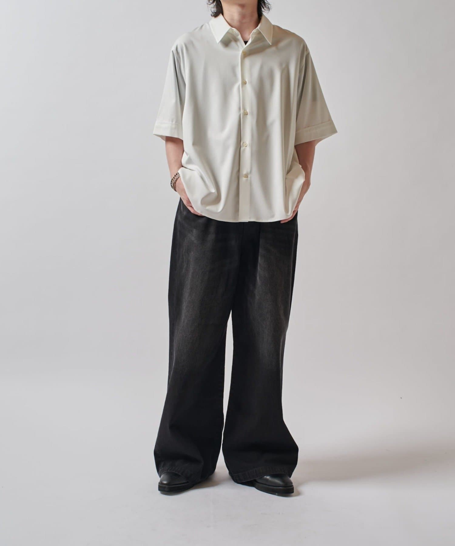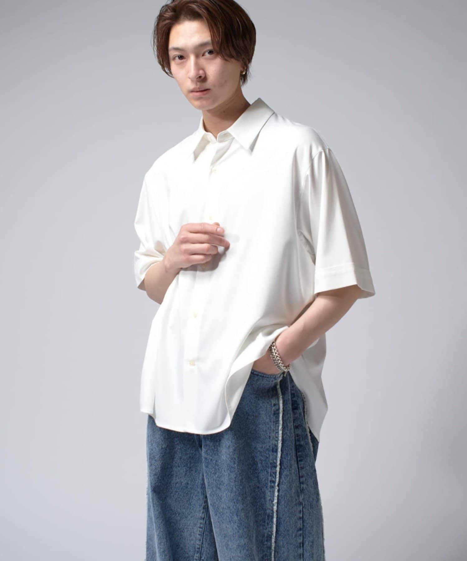 クリーンでミニマルな見た目のシャツなので、ワイドデニムやパラシュートパンツと組み合わせたキレイめカジュアルなスタイルがオススメ。