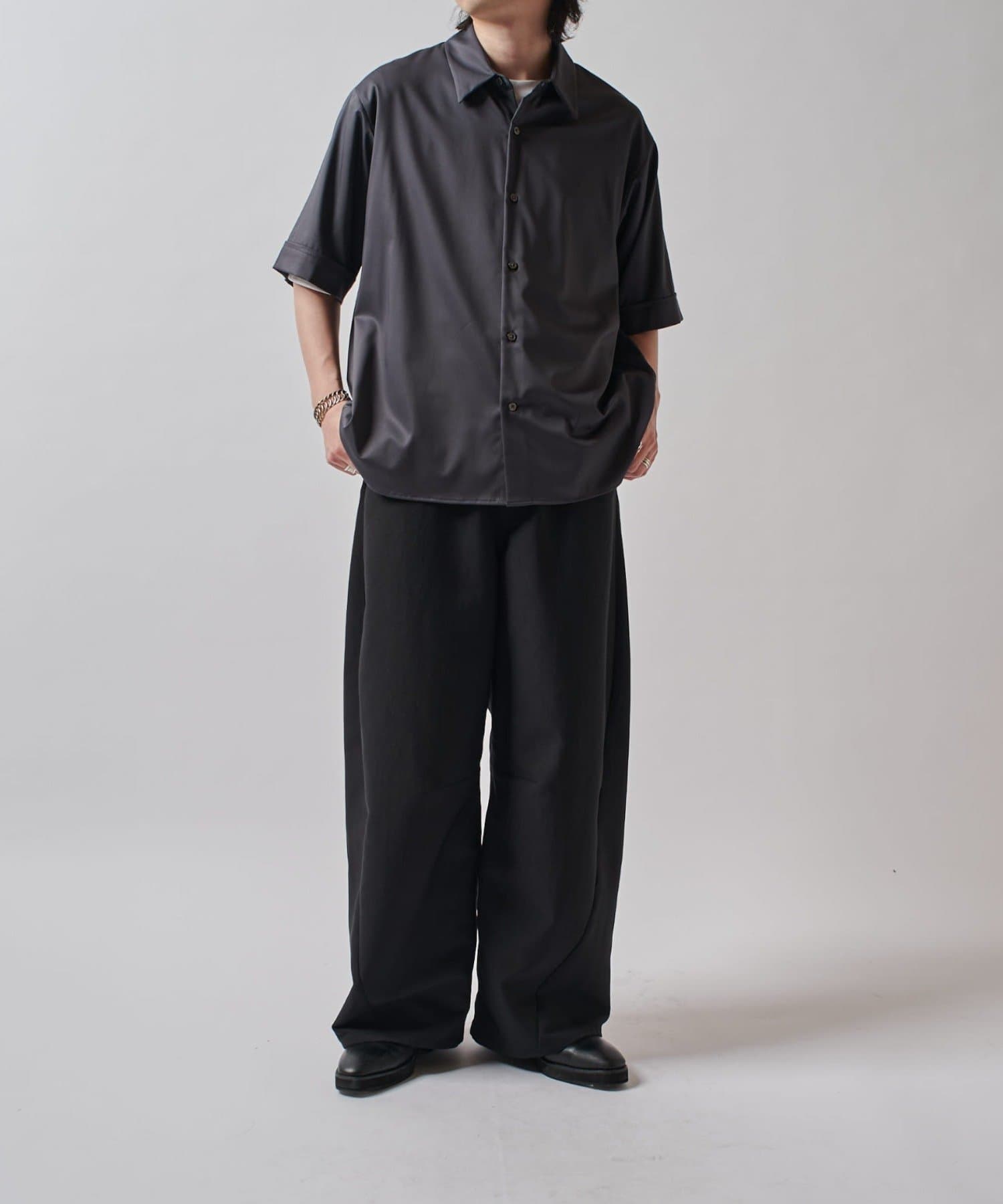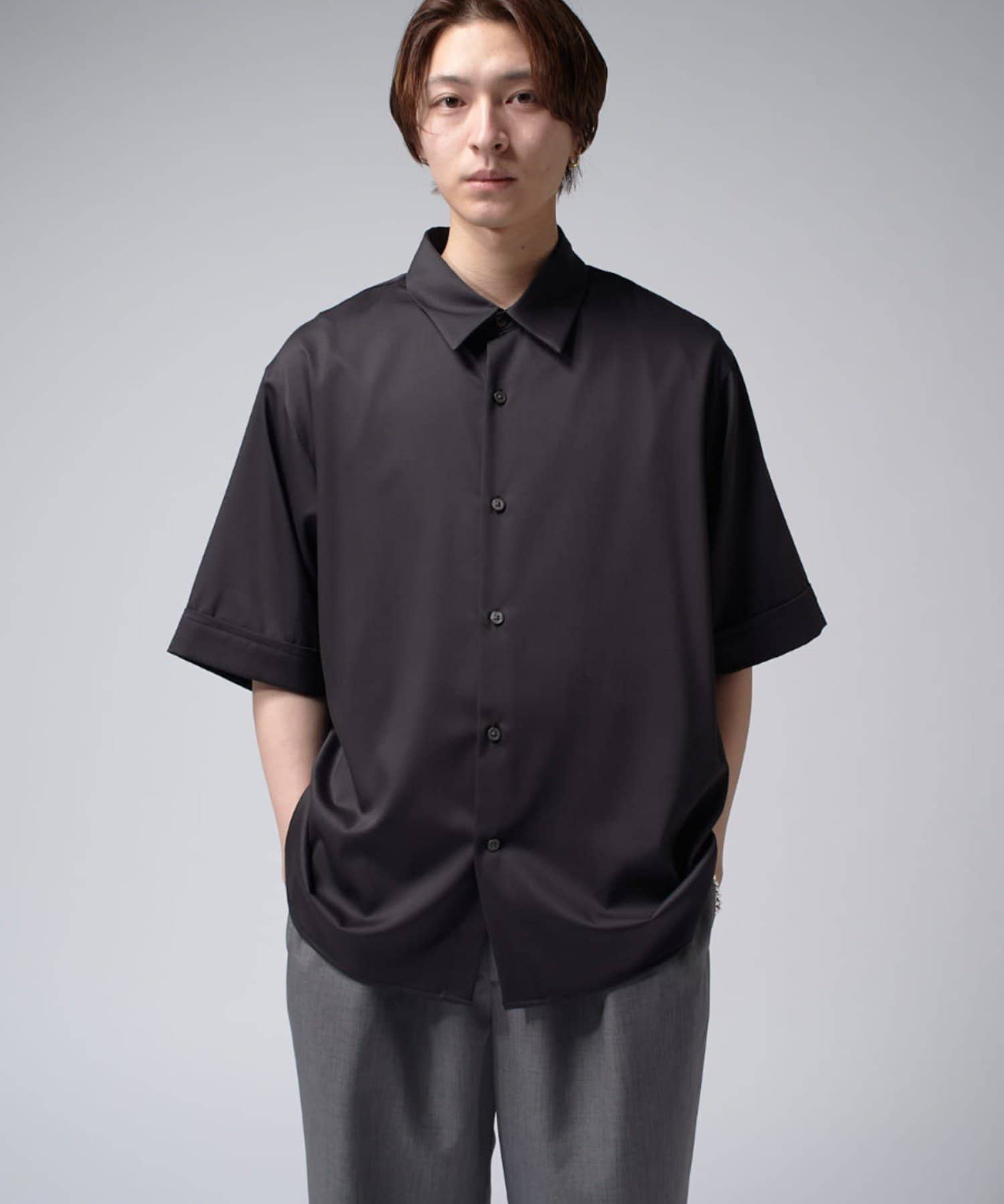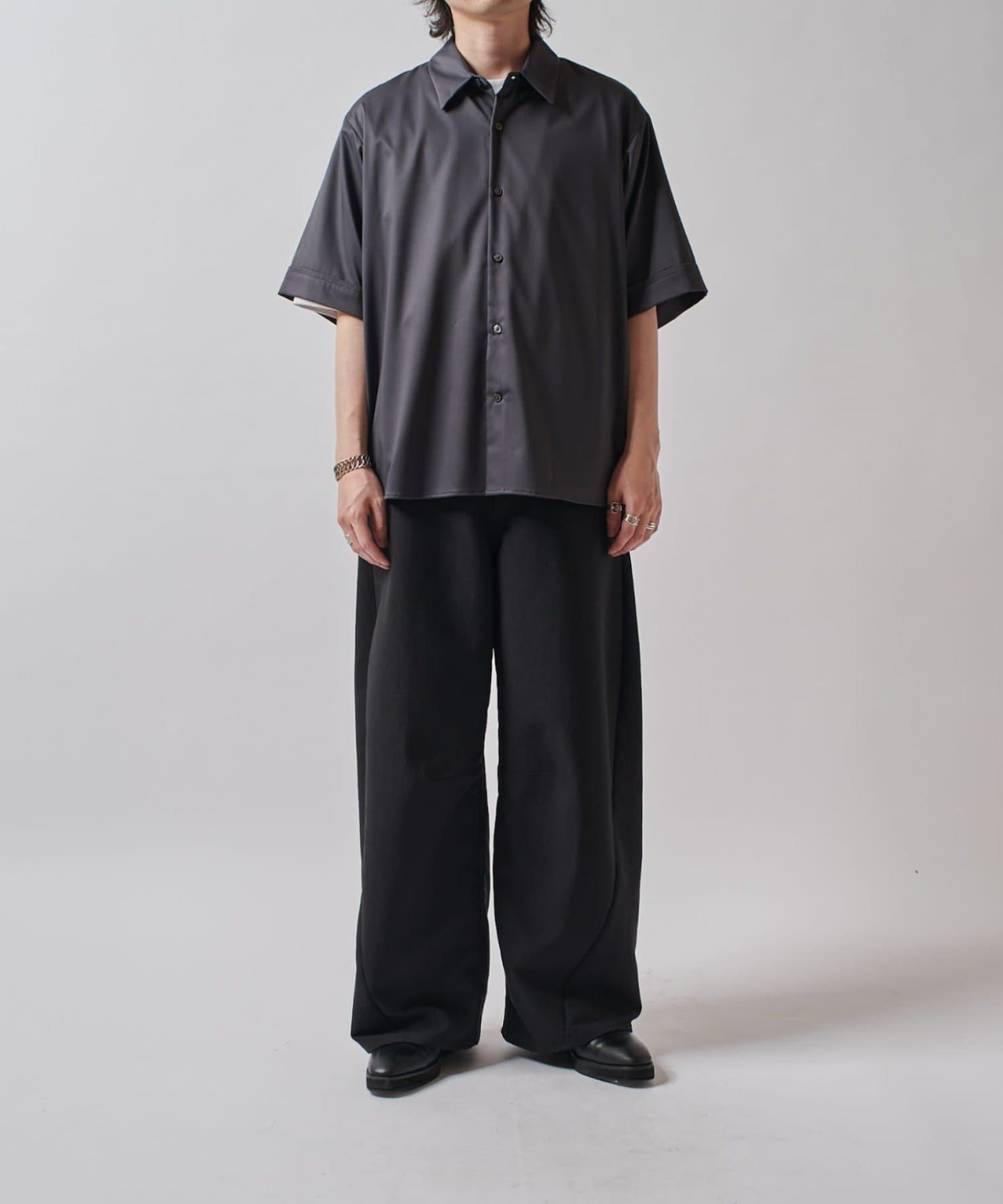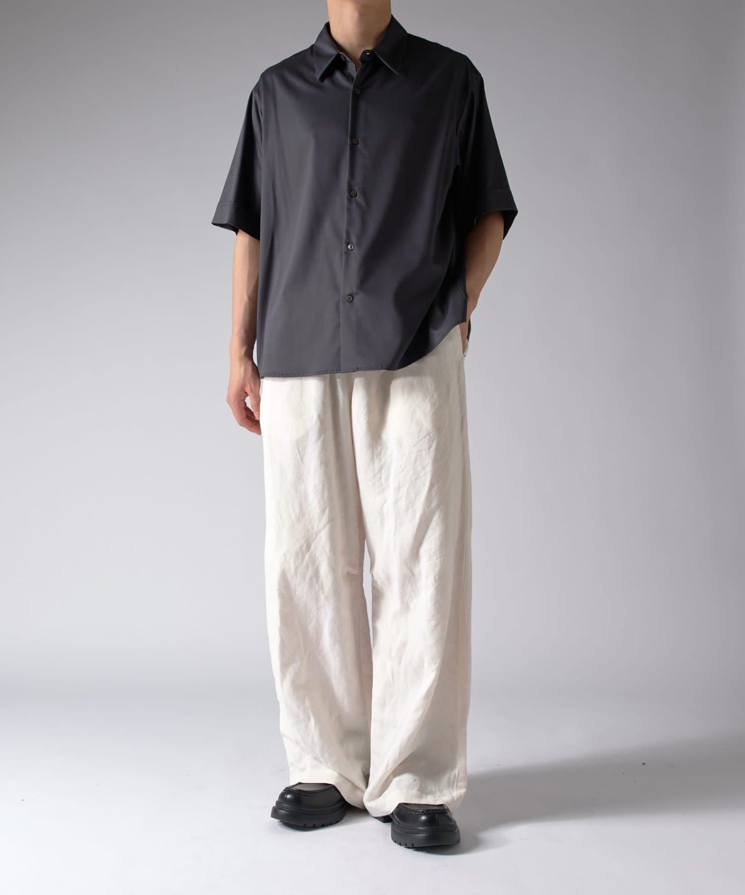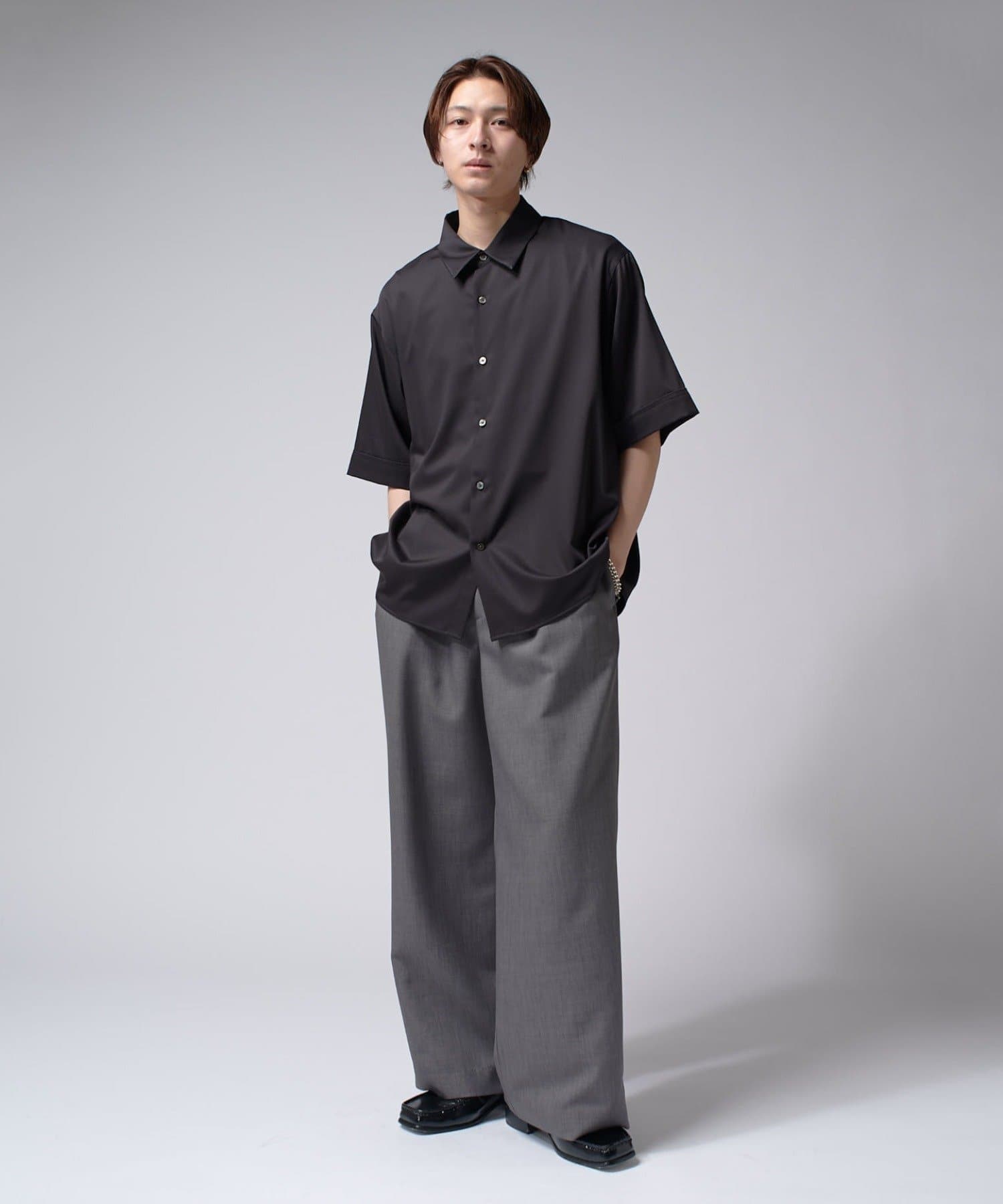 クリーンでミニマルな見た目のシャツなので、ワイドデニムやパラシュートパンツと組み合わせたキレイめカジュアルなスタイルがオススメ。