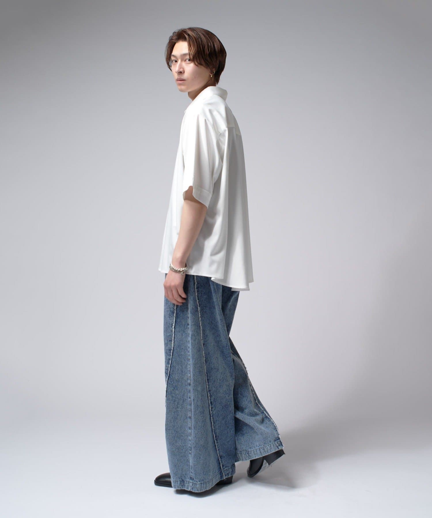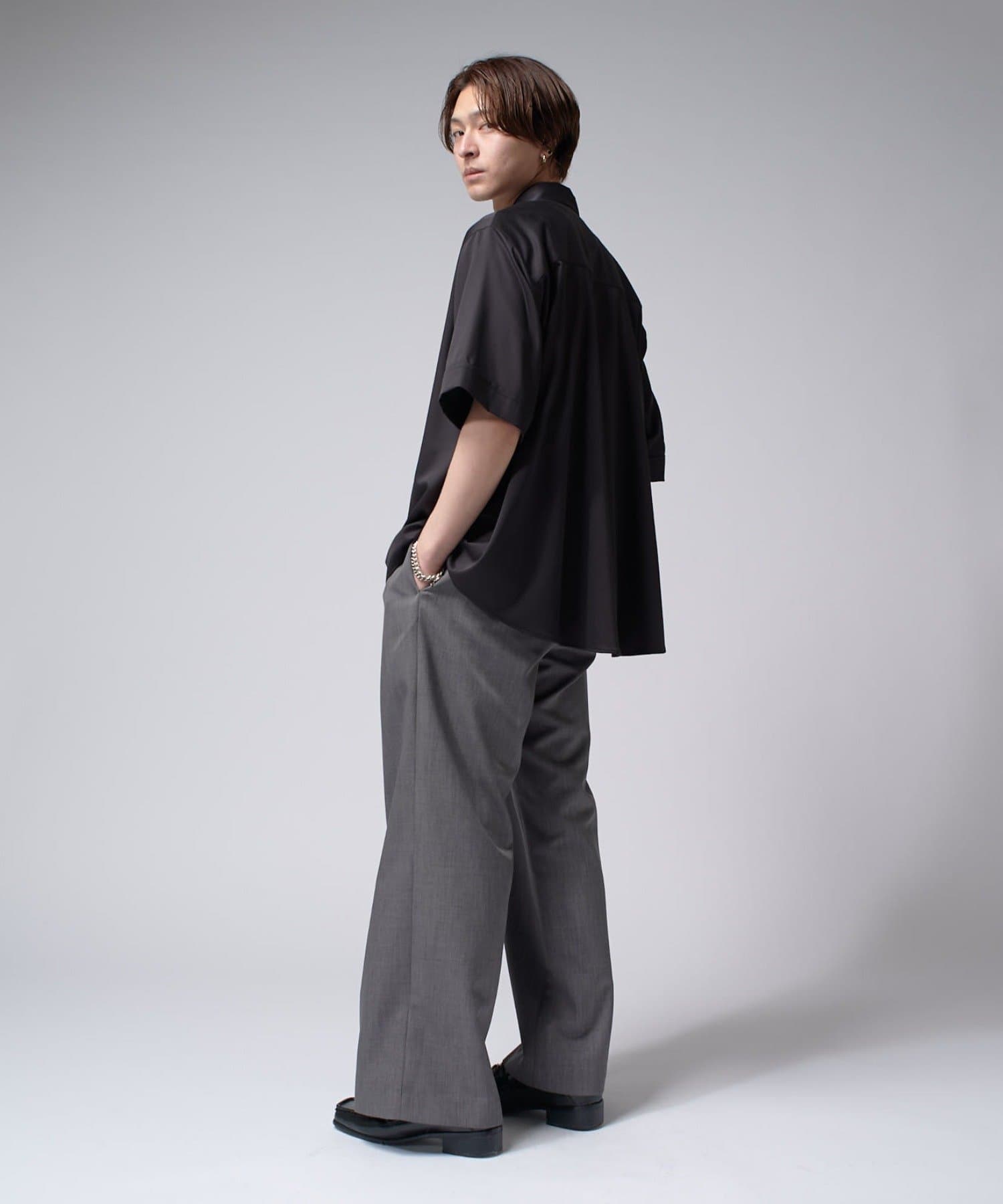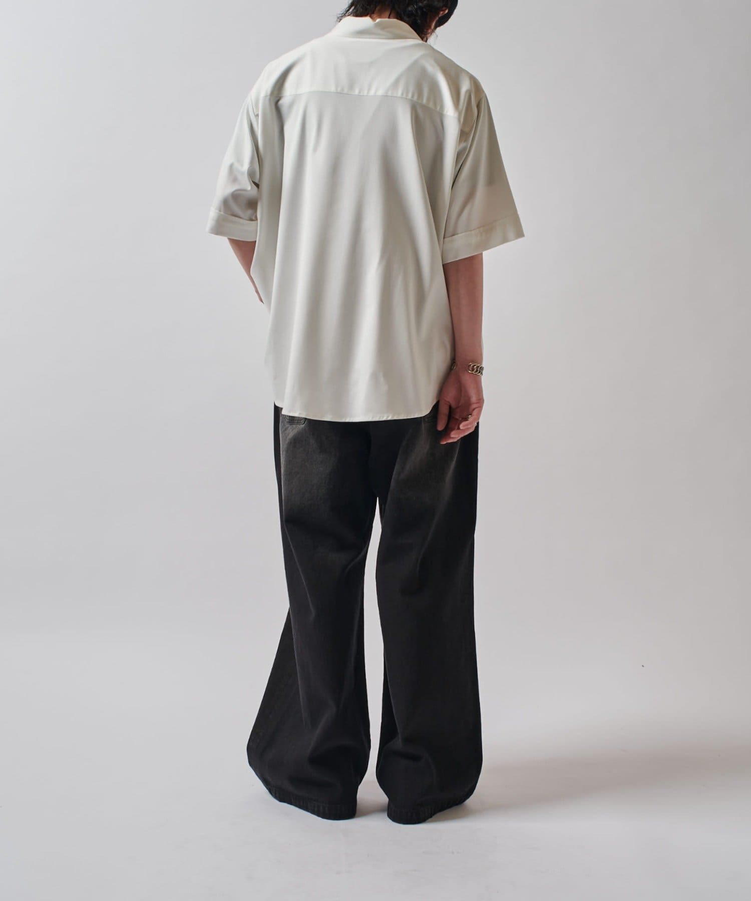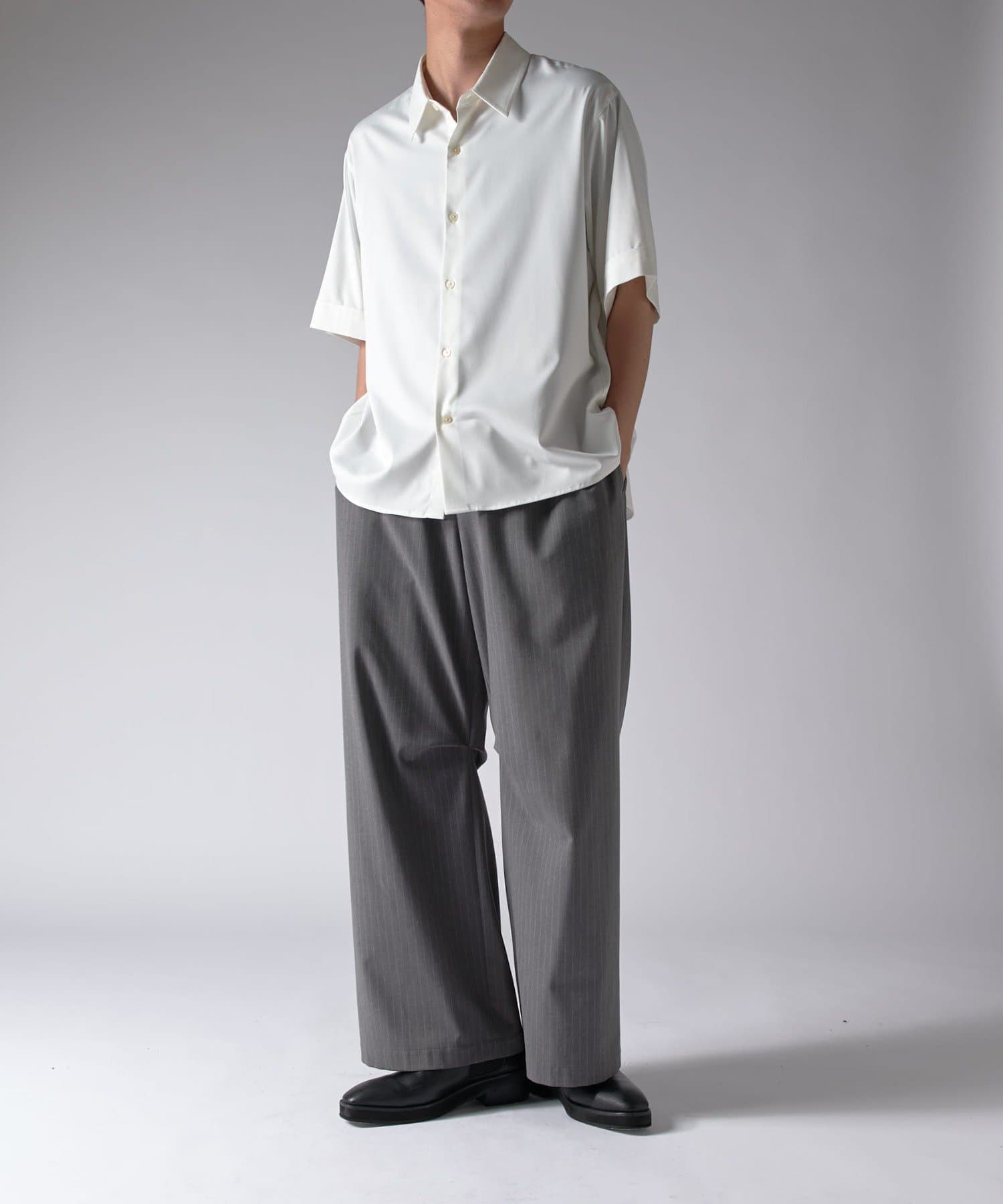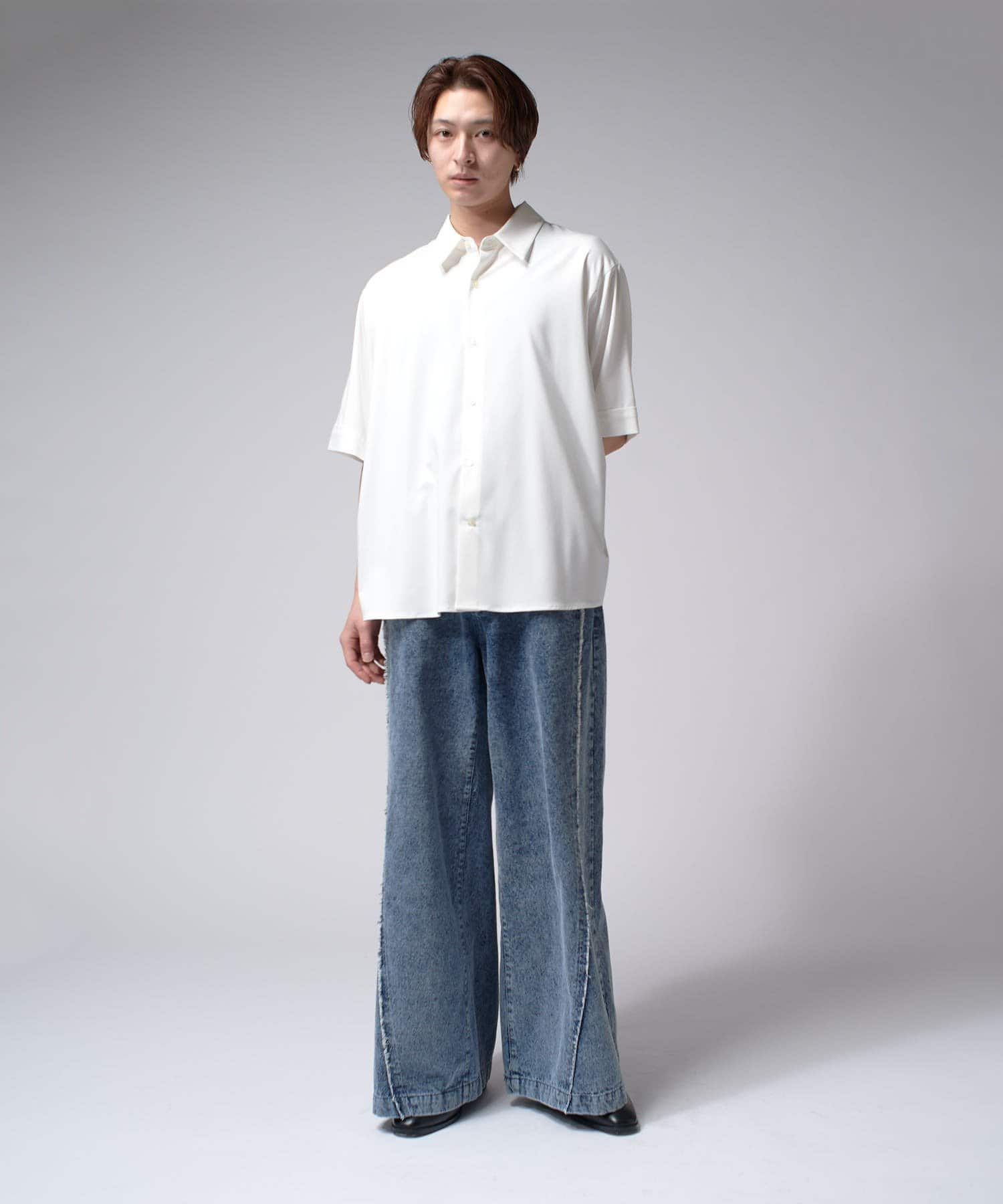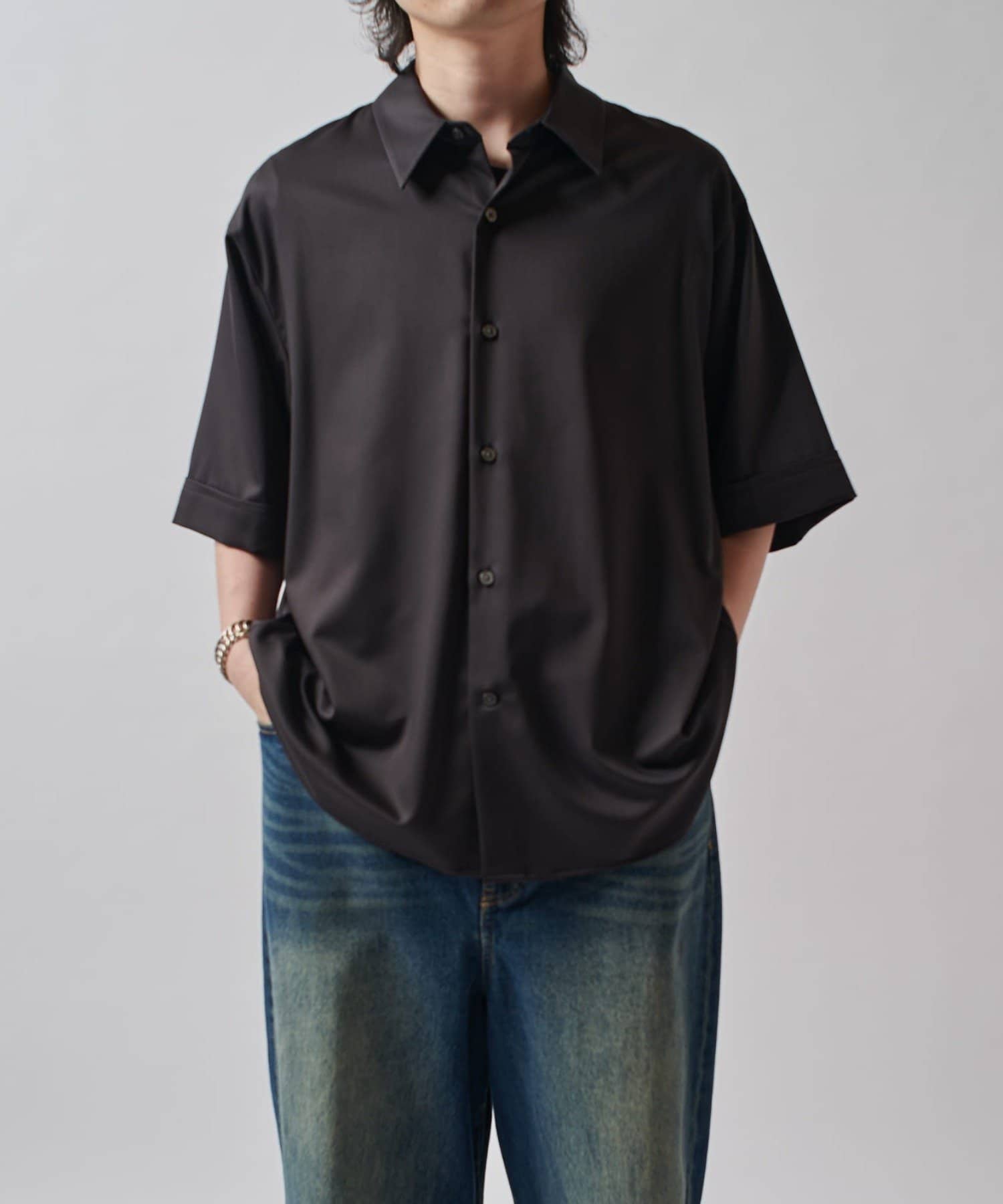 クリーンでミニマルな見た目のシャツなので、ワイドデニムやパラシュートパンツと組み合わせたキレイめカジュアルなスタイルがオススメ。
