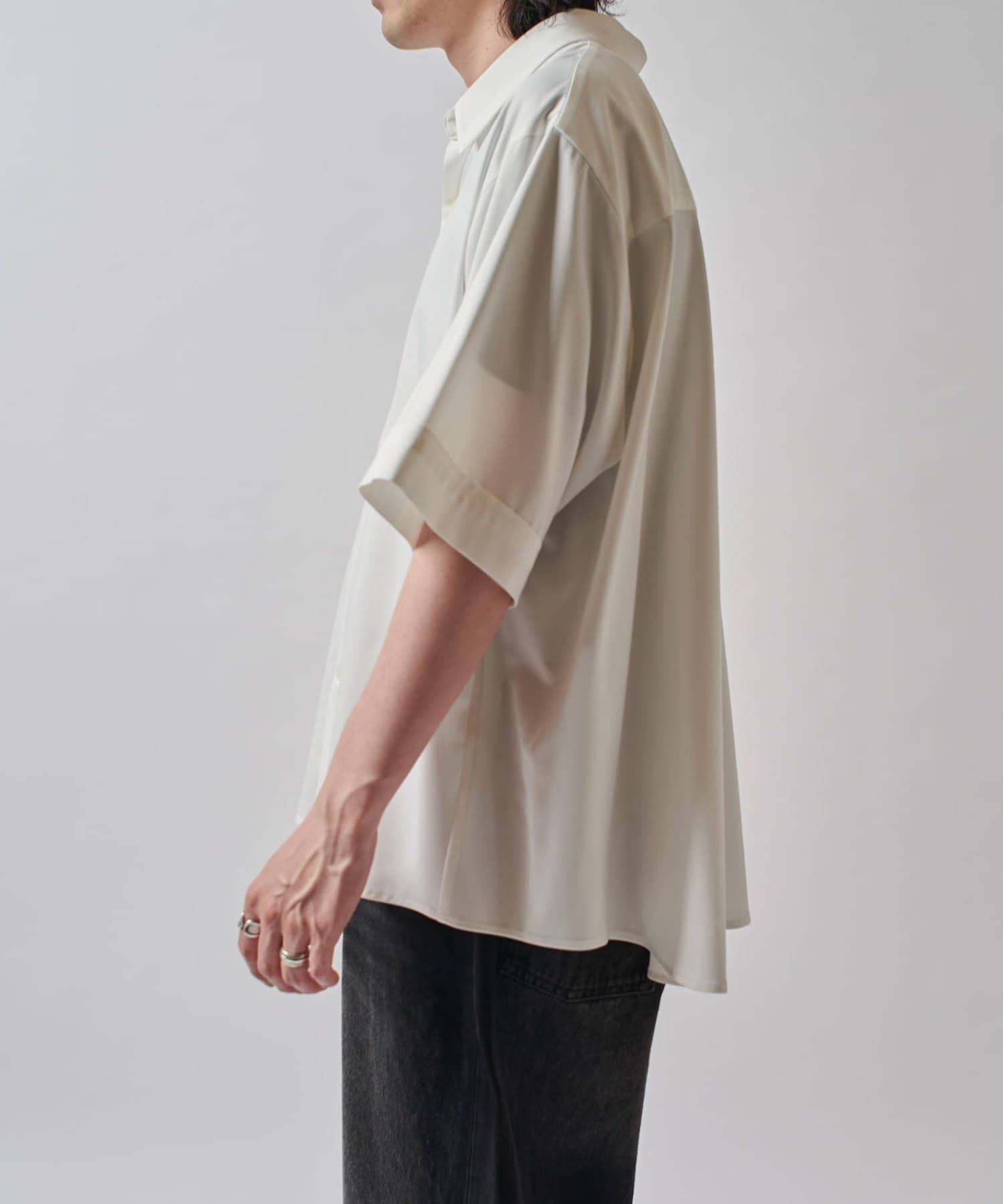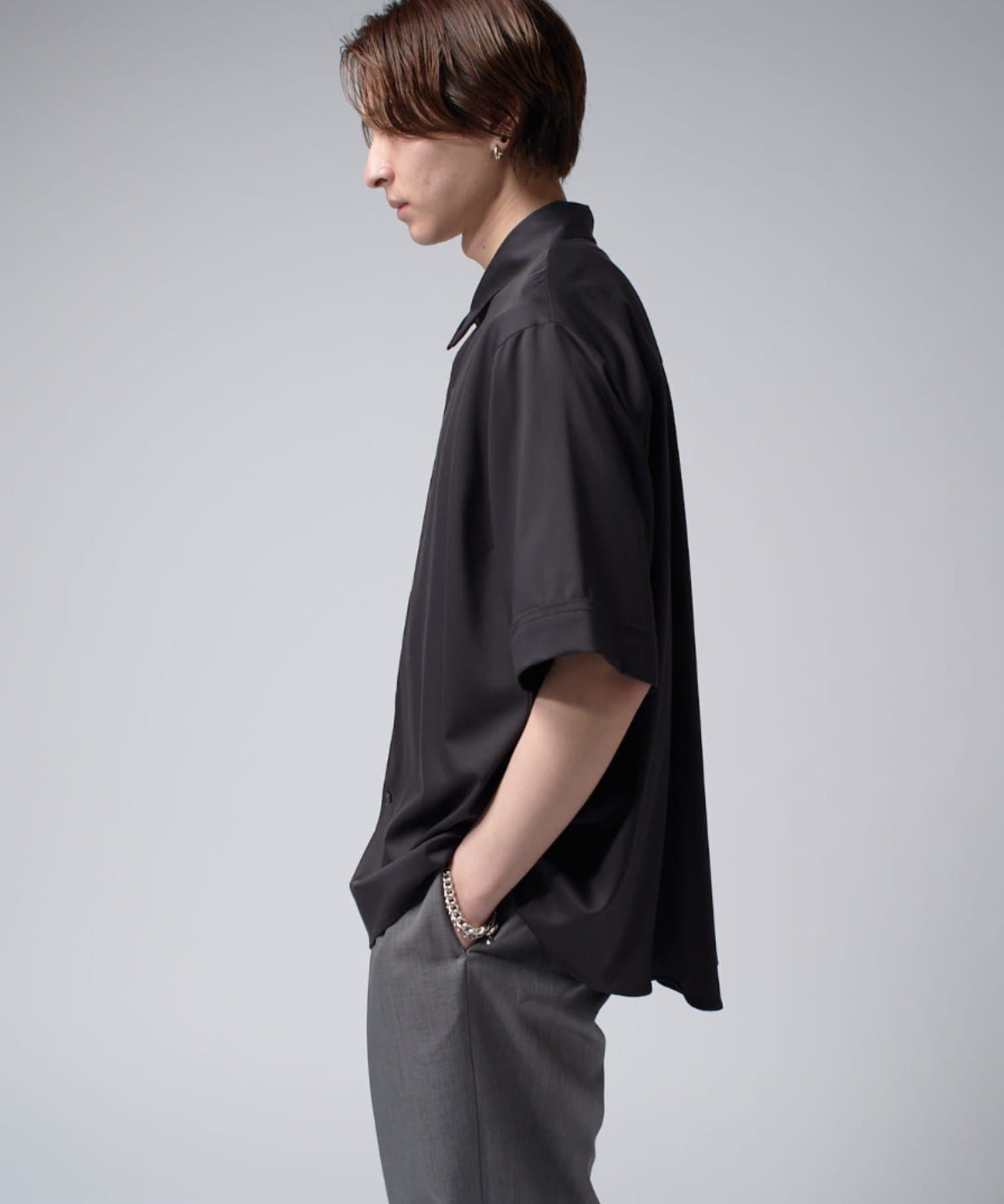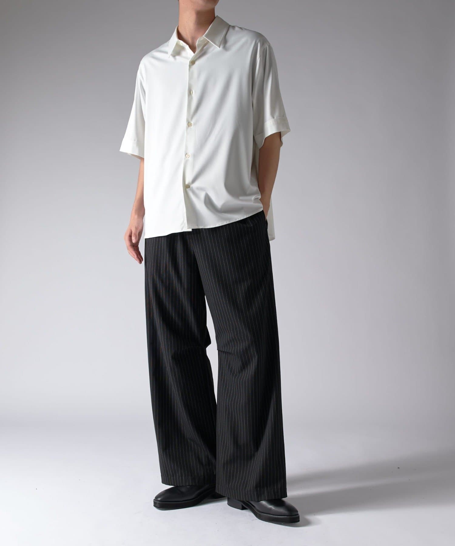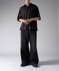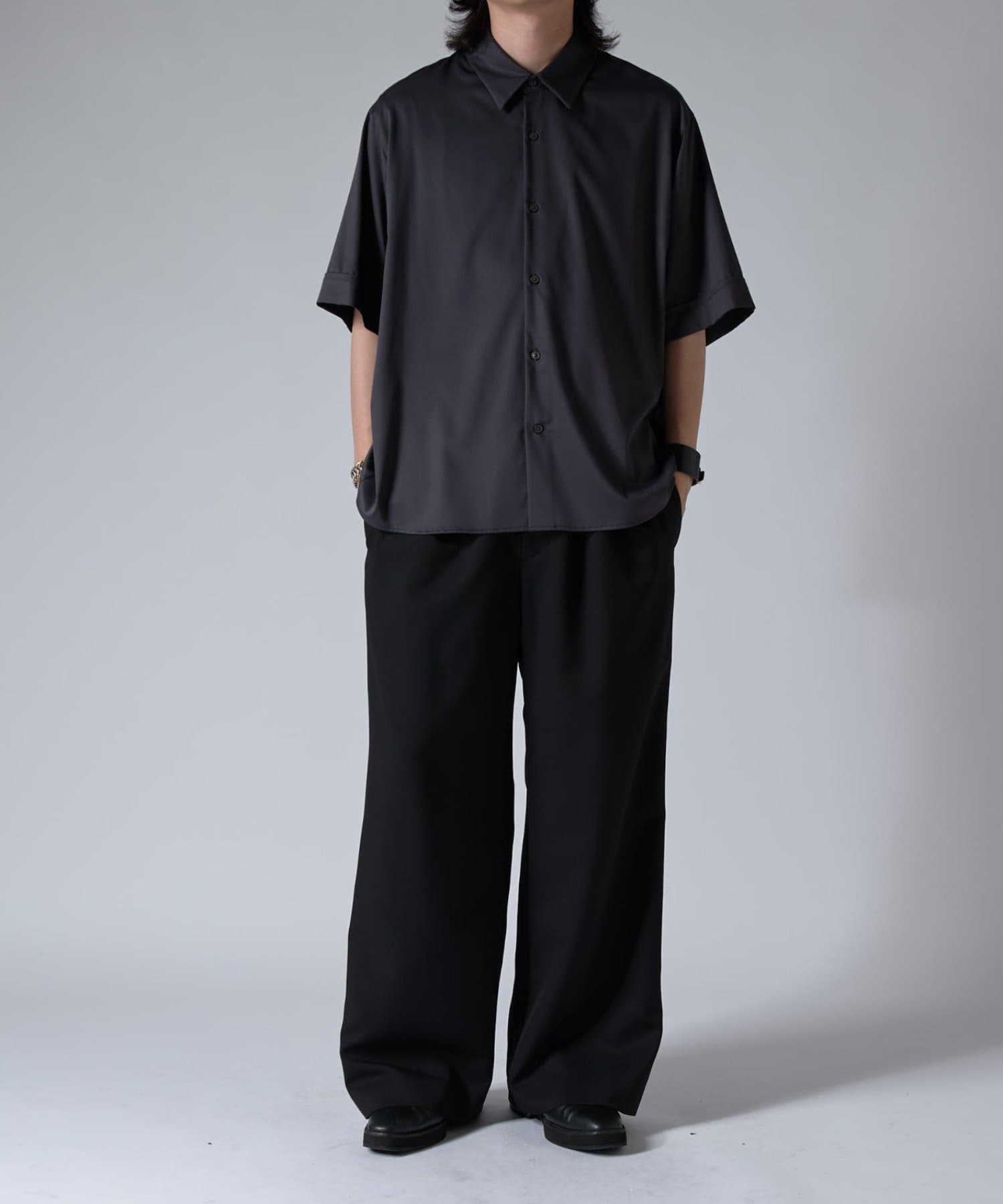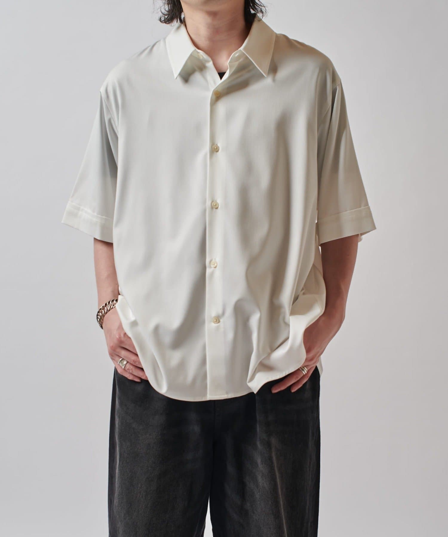 クリーンでミニマルな見た目のシャツなので、ワイドデニムやパラシュートパンツと組み合わせたキレイめカジュアルなスタイルがオススメ。