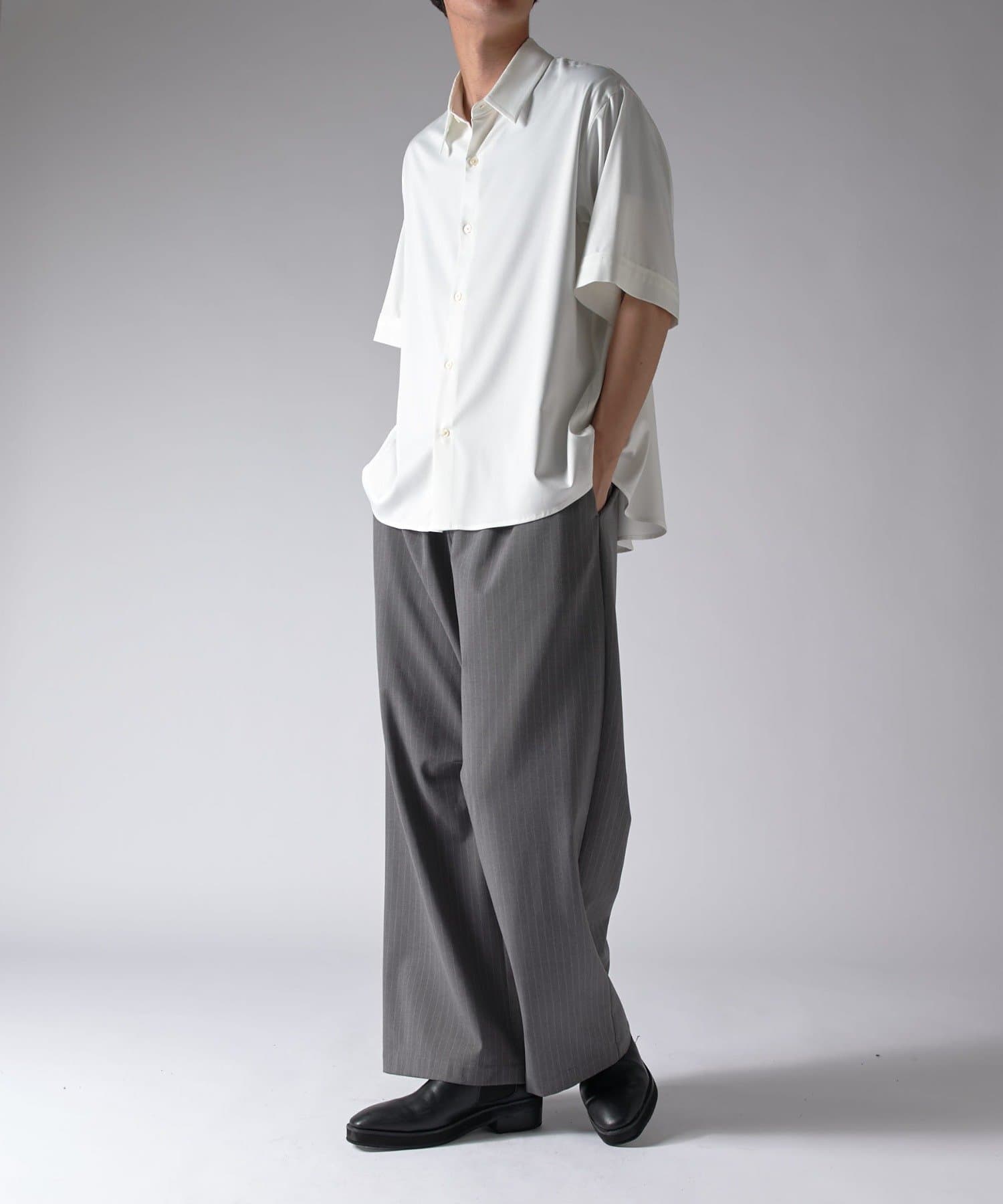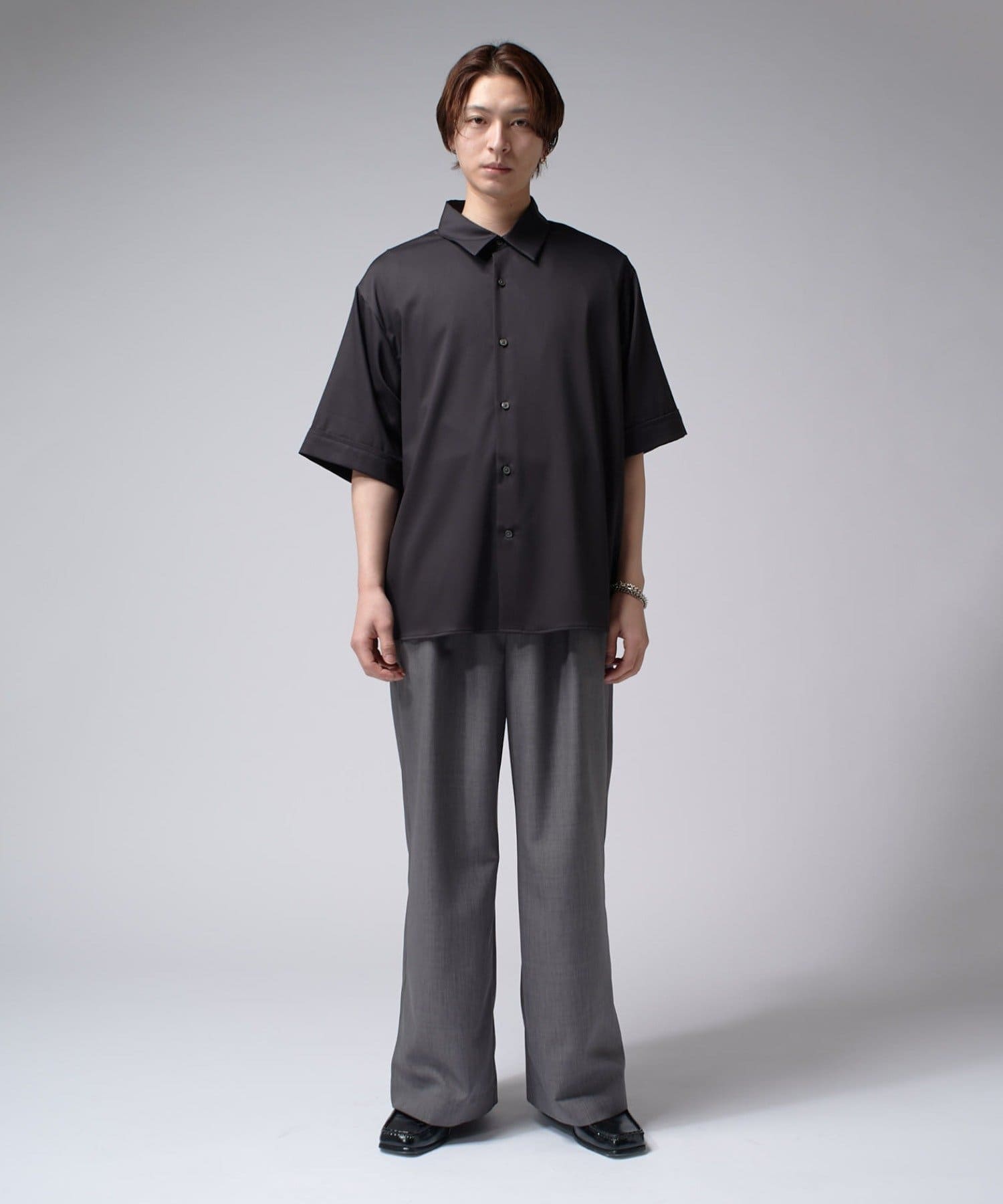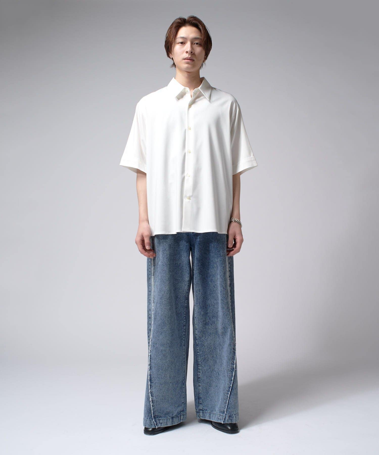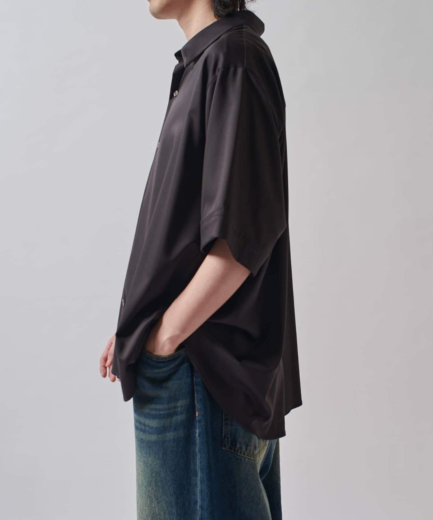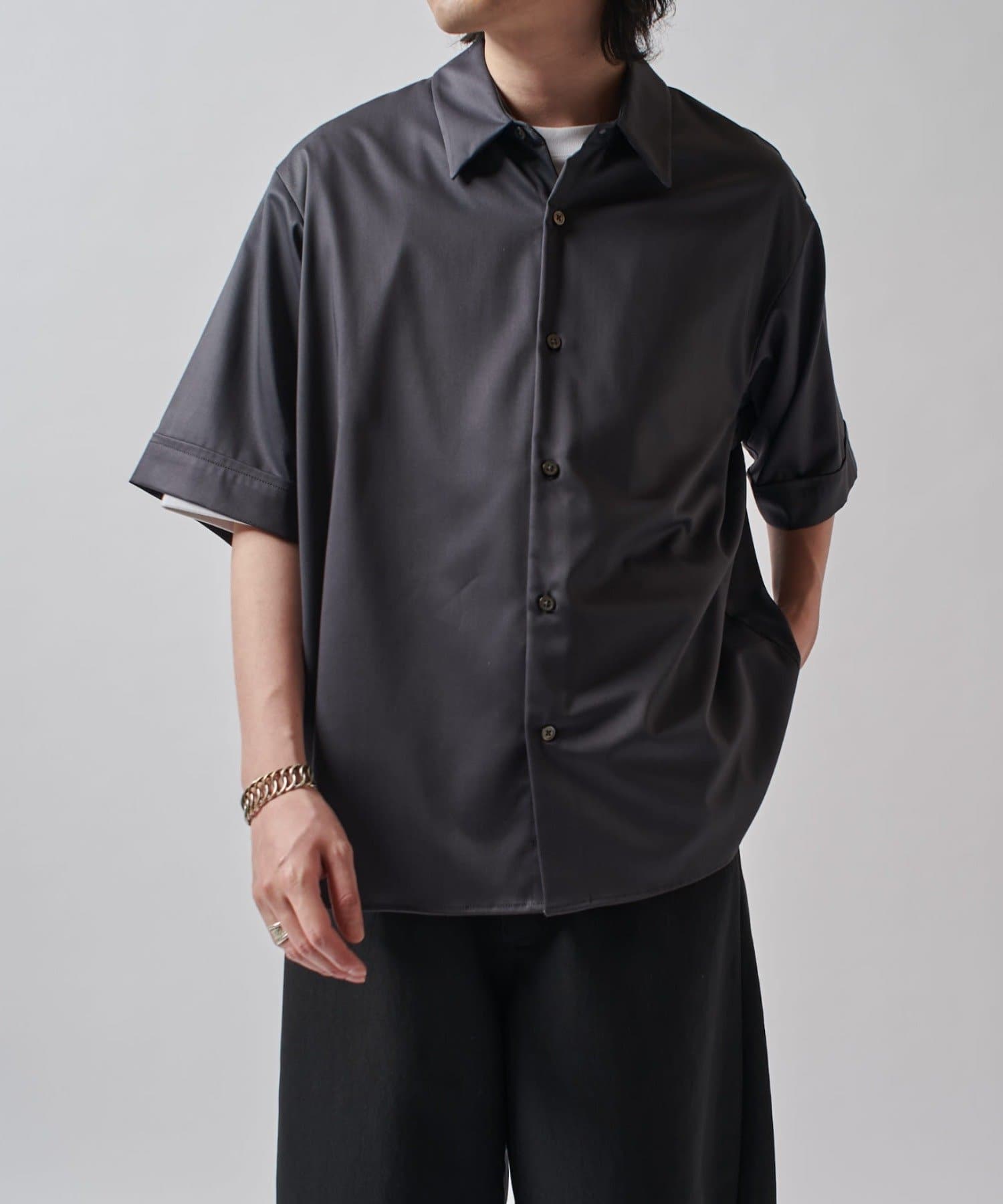 クリーンでミニマルな見た目のシャツなので、ワイドデニムやパラシュートパンツと組み合わせたキレイめカジュアルなスタイルがオススメ。