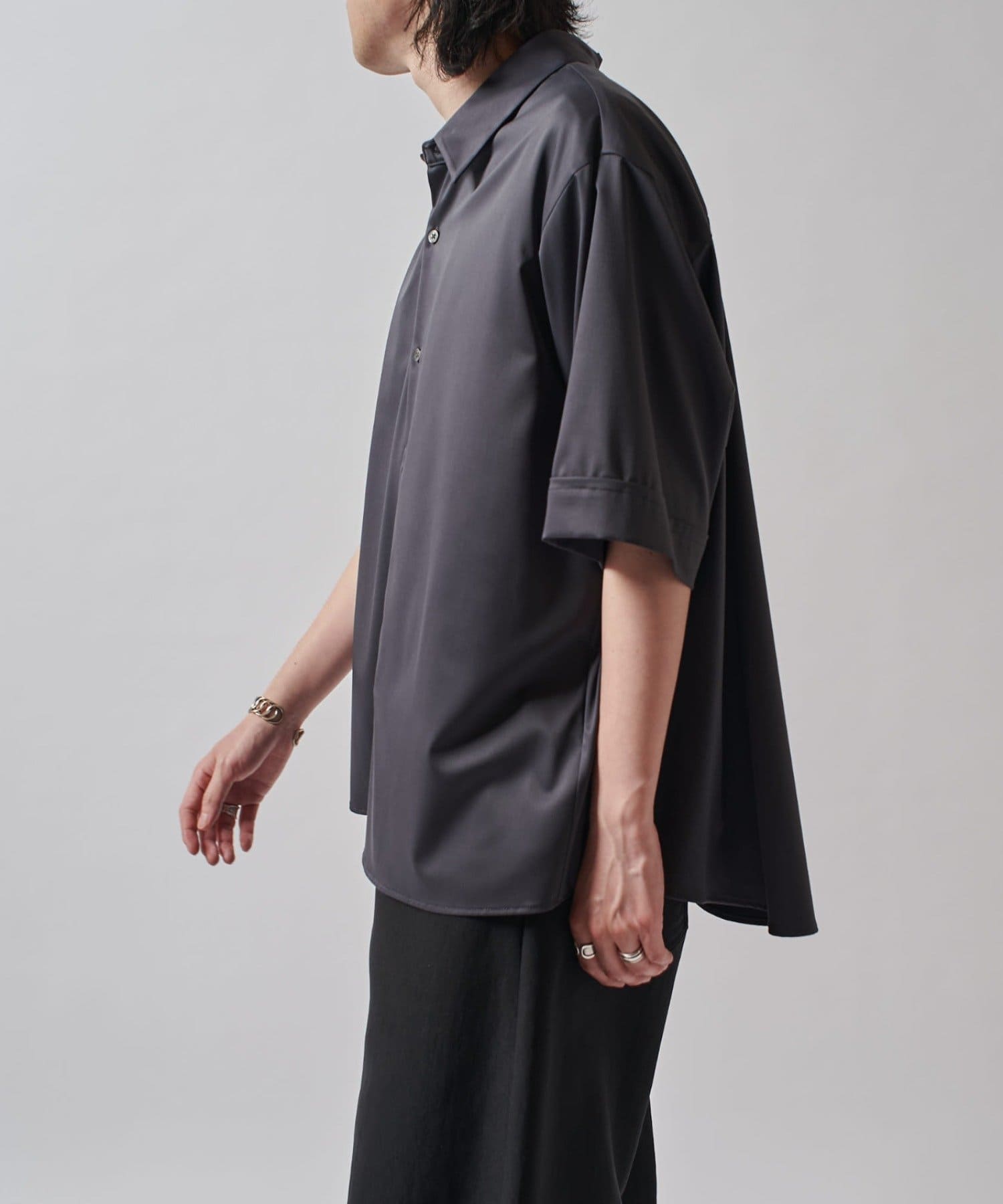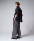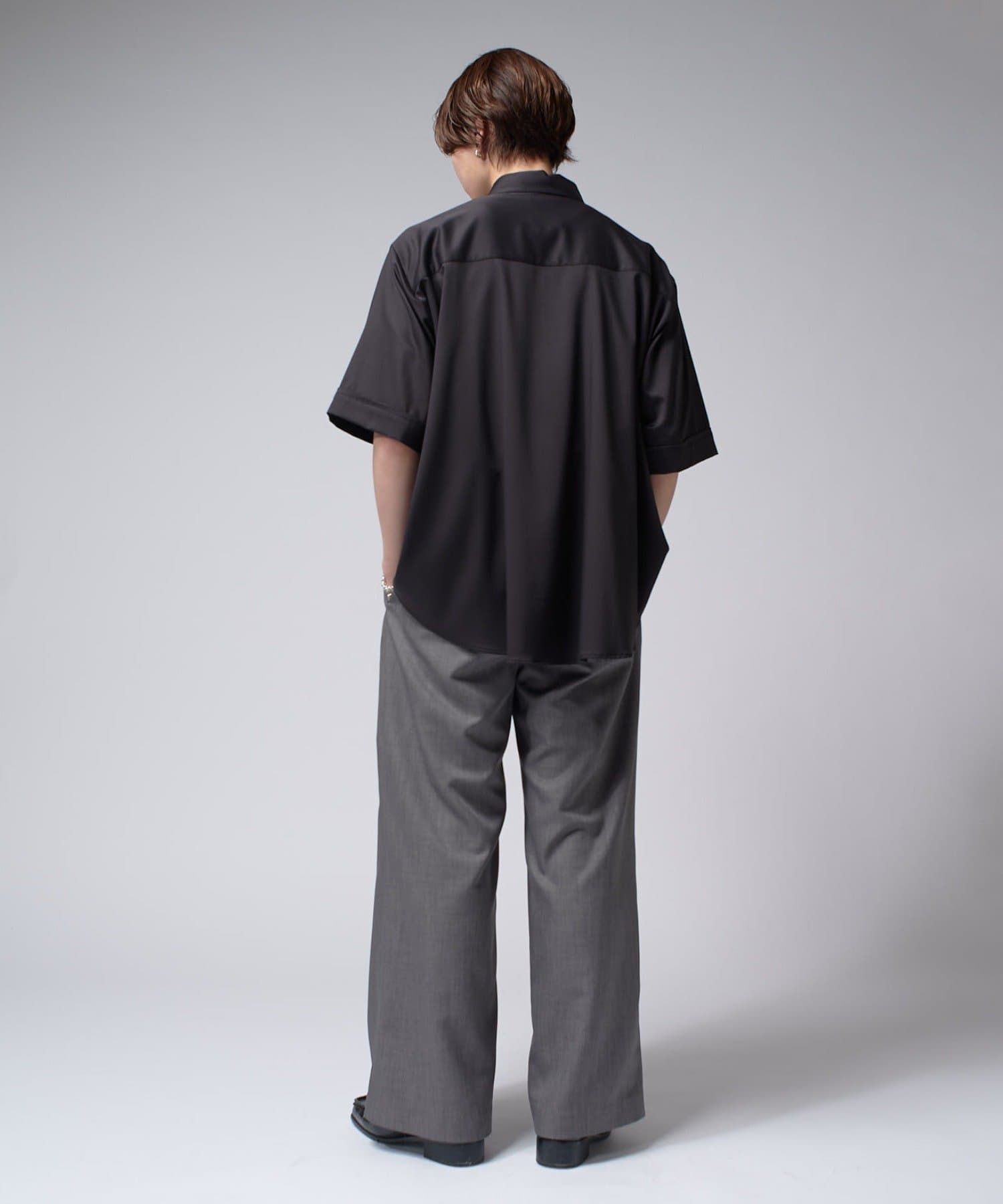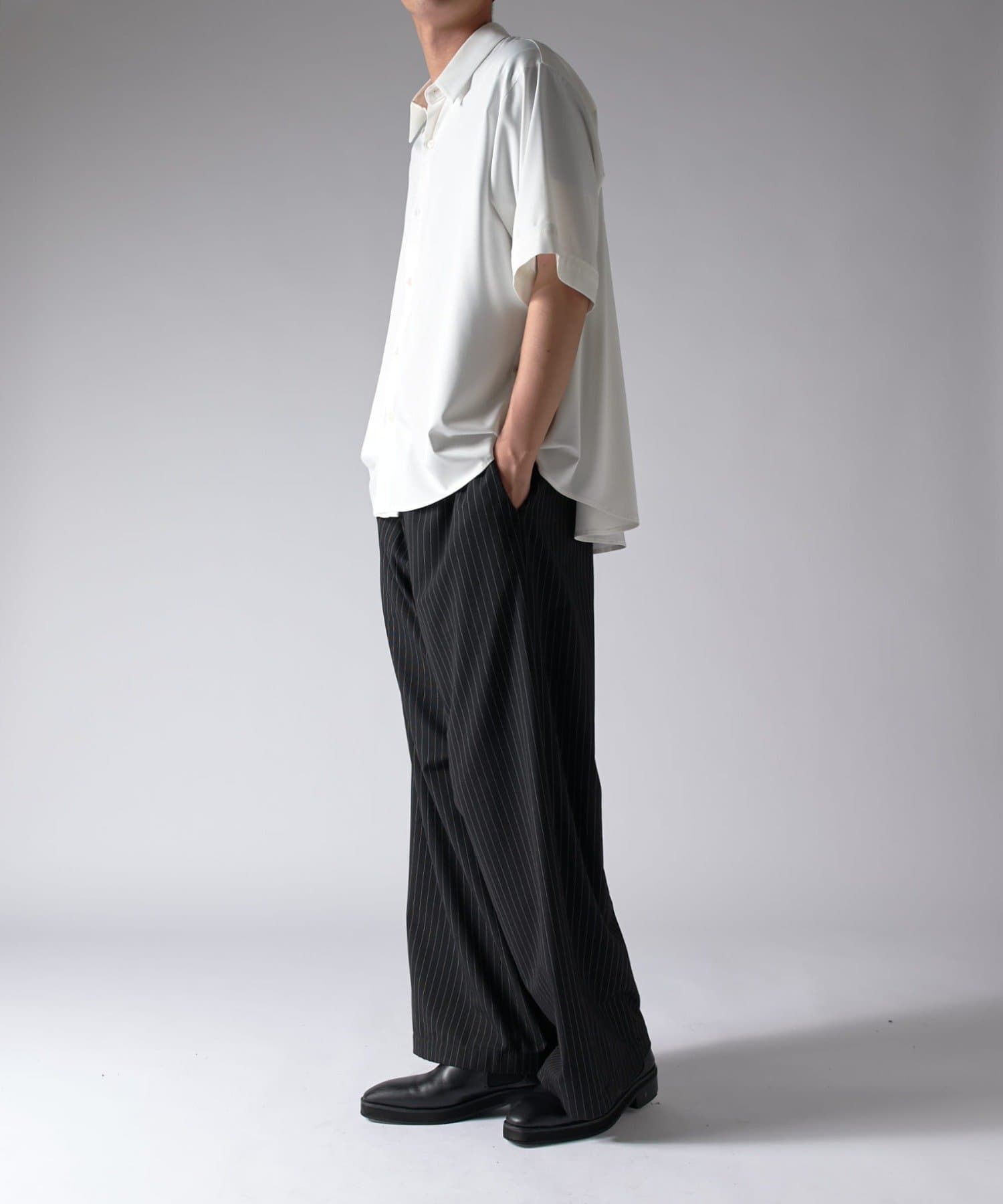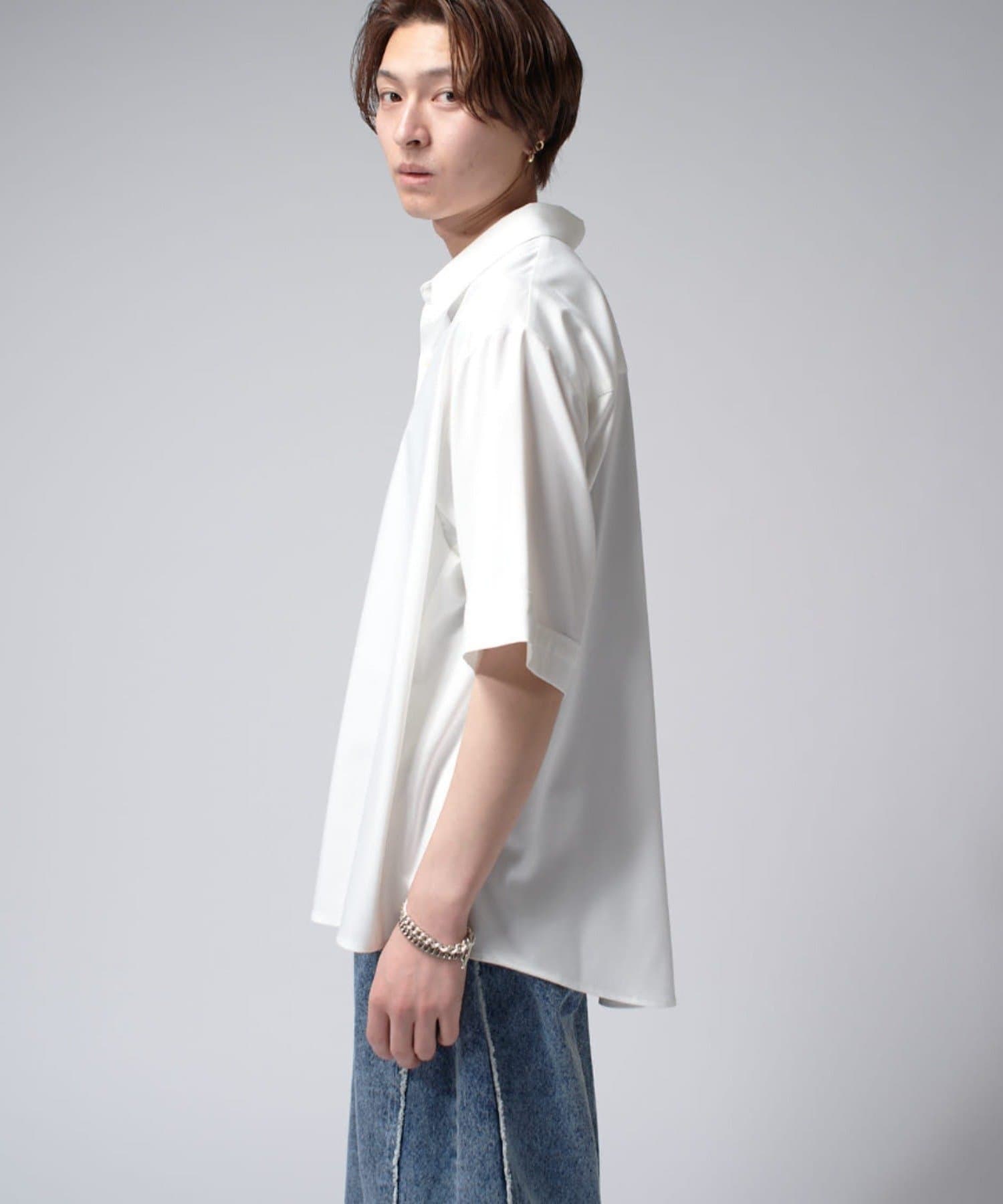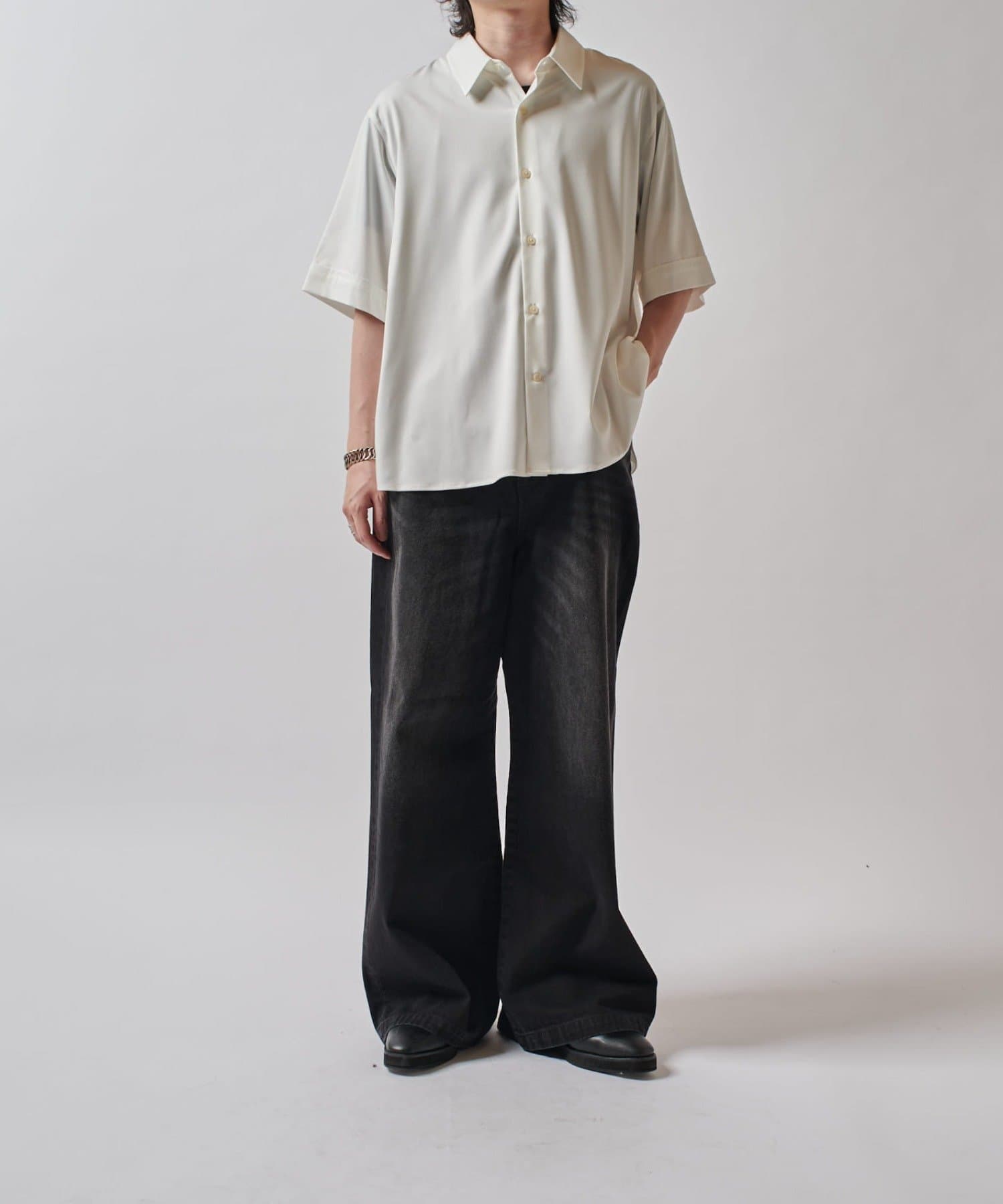 クリーンでミニマルな見た目のシャツなので、ワイドデニムやパラシュートパンツと組み合わせたキレイめカジュアルなスタイルがオススメ。