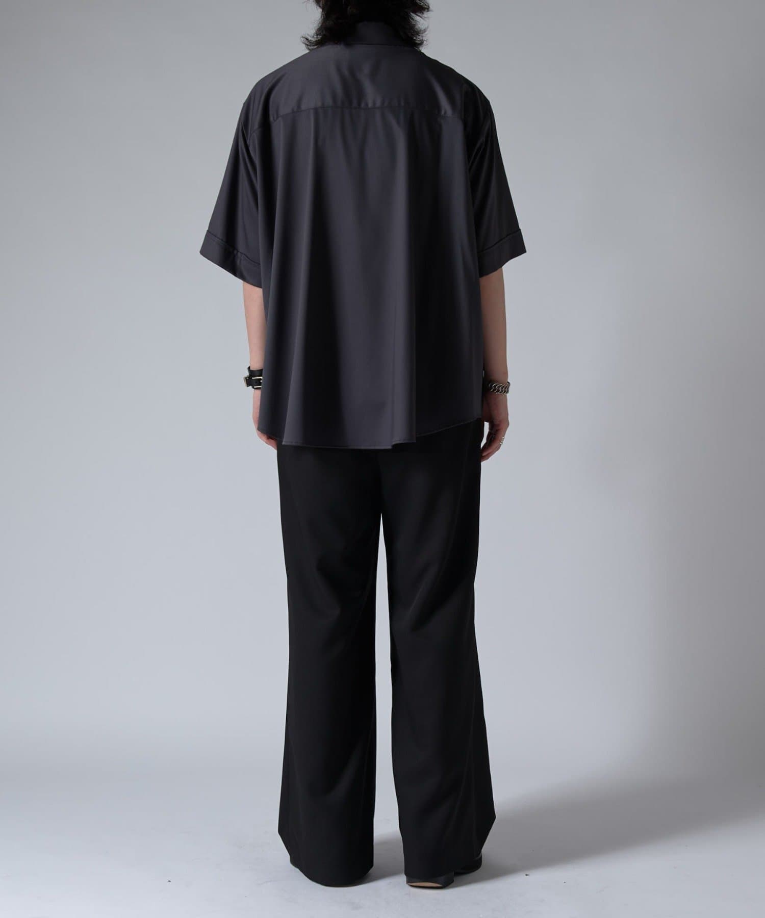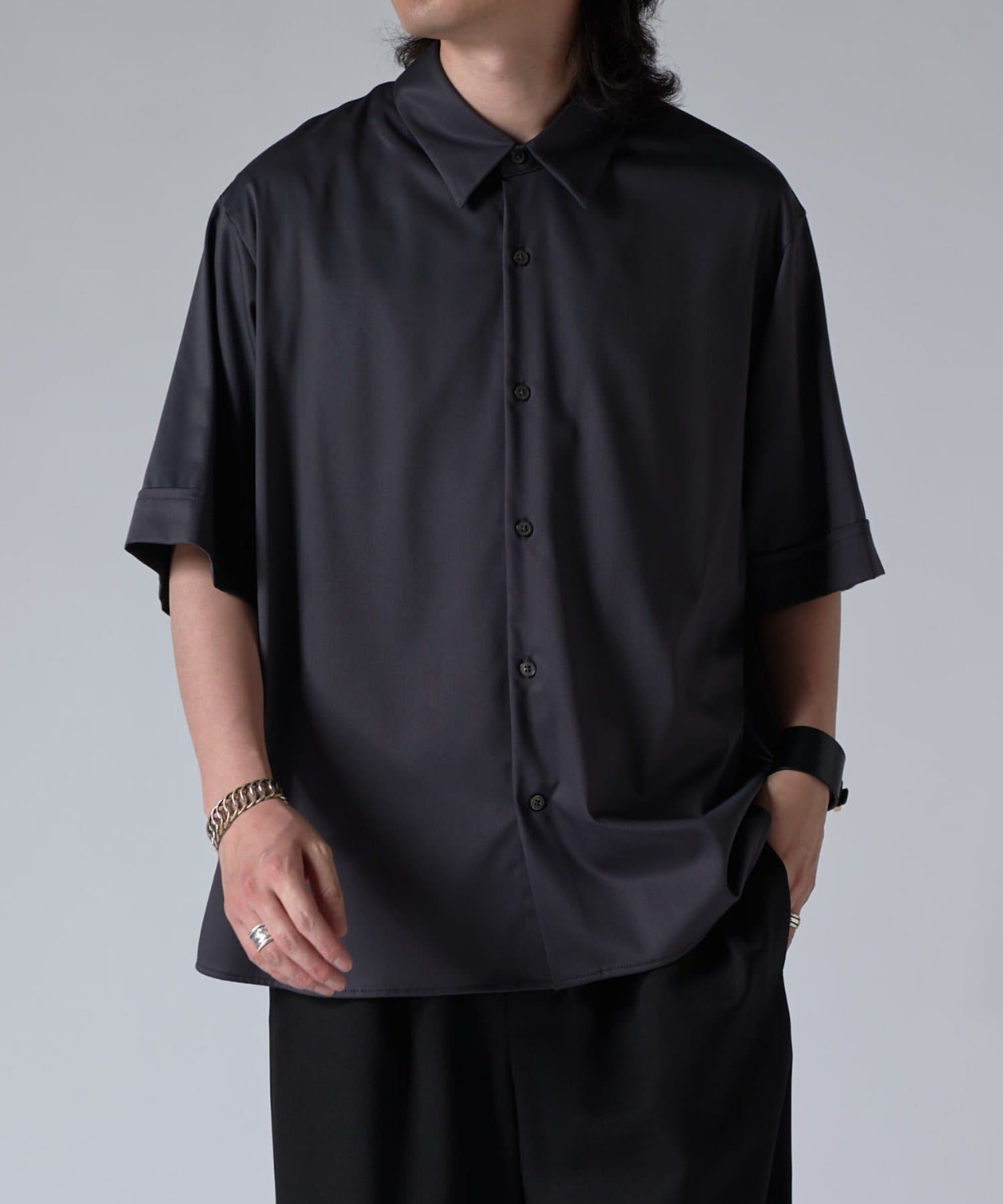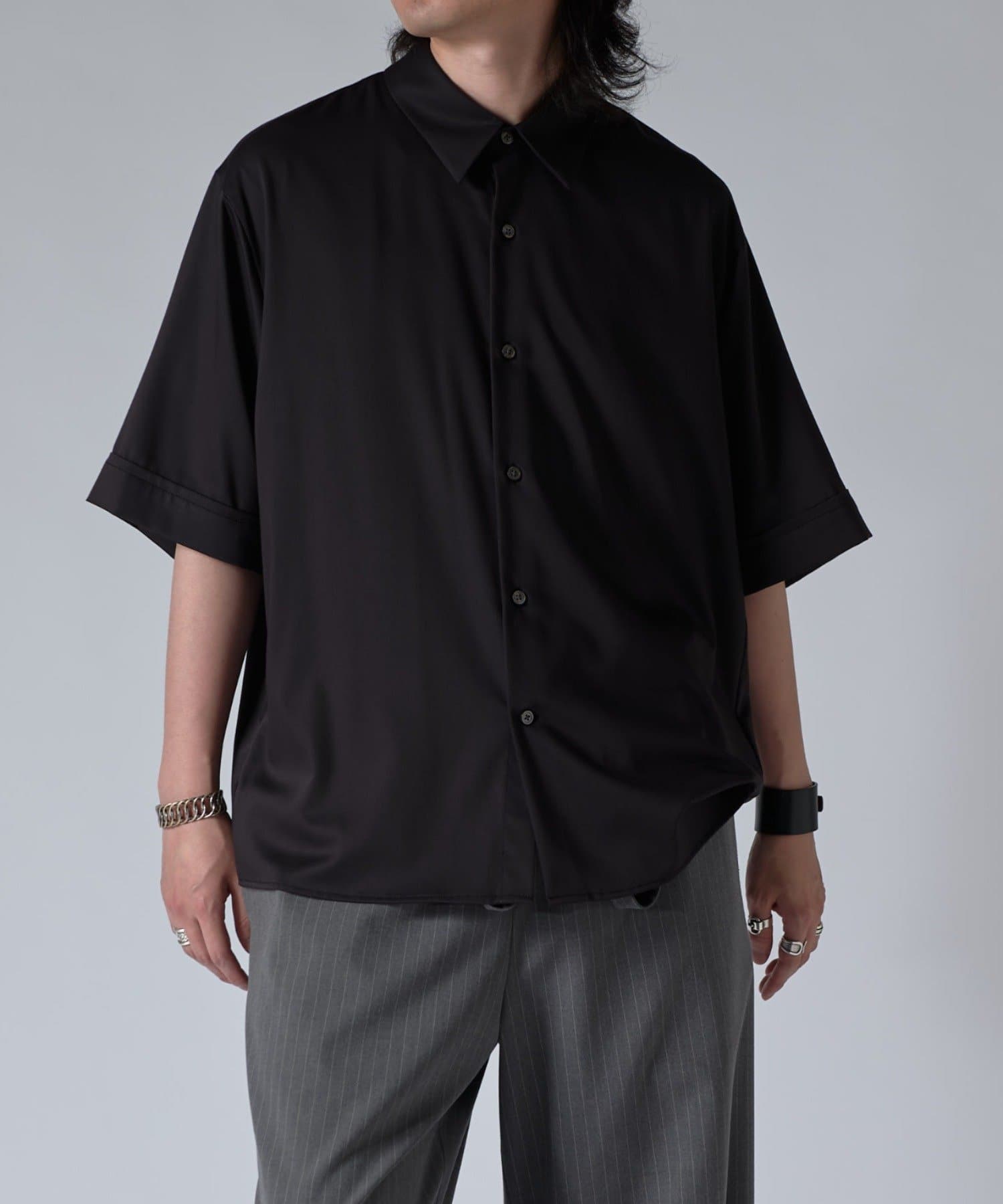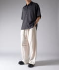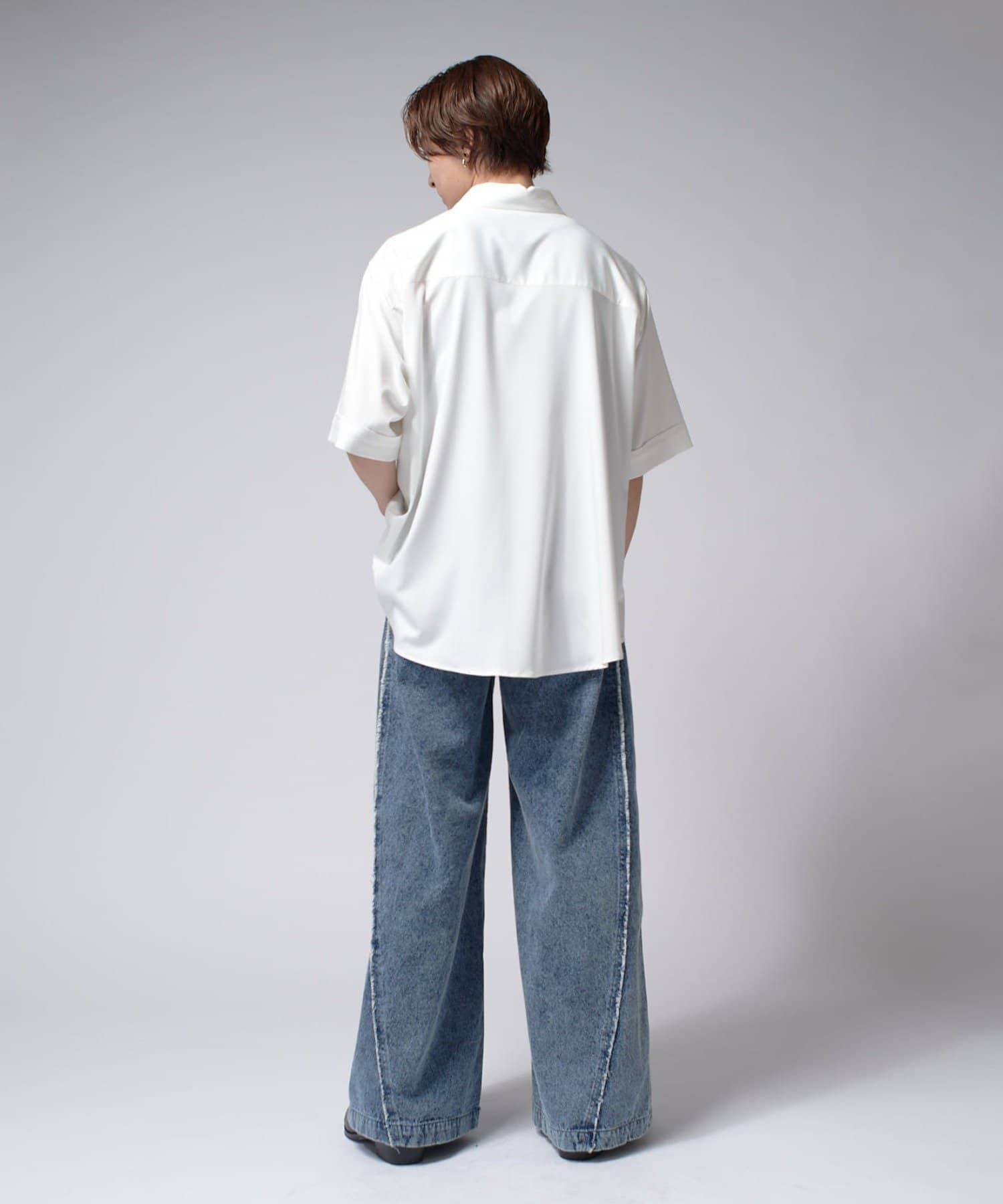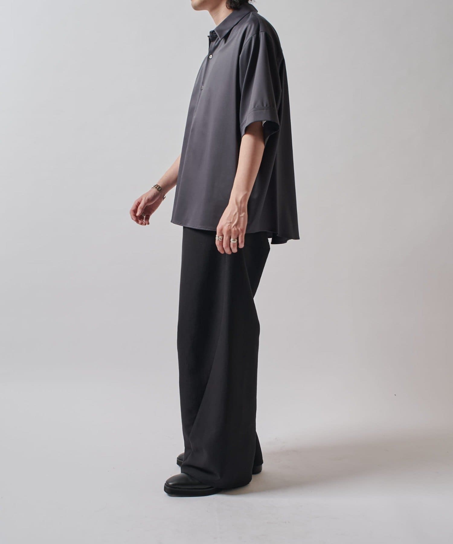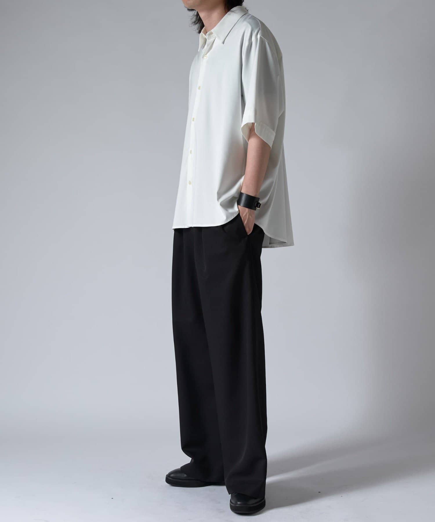 クリーンでミニマルな見た目のシャツなので、ワイドデニムやパラシュートパンツと組み合わせたキレイめカジュアルなスタイルがオススメ。